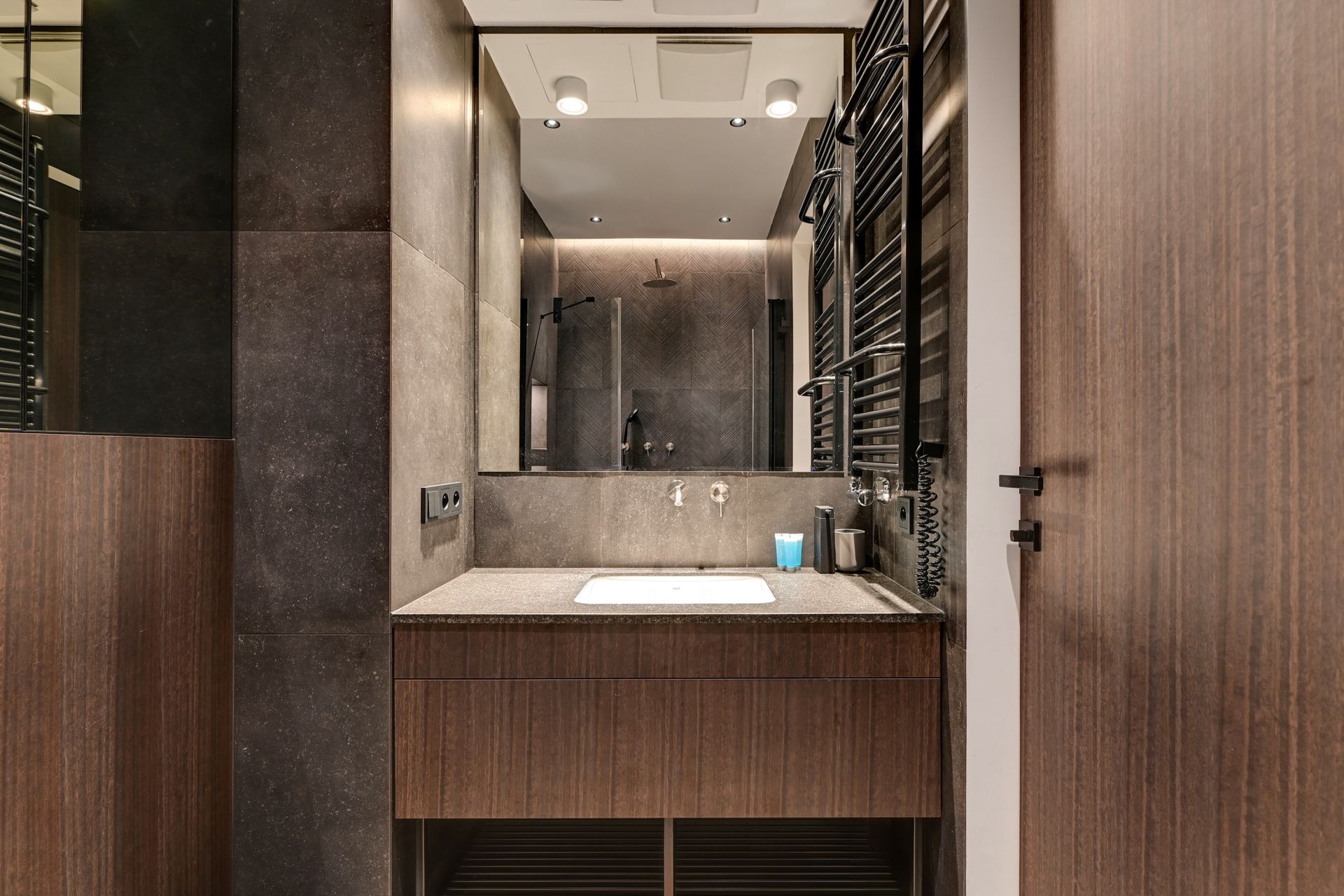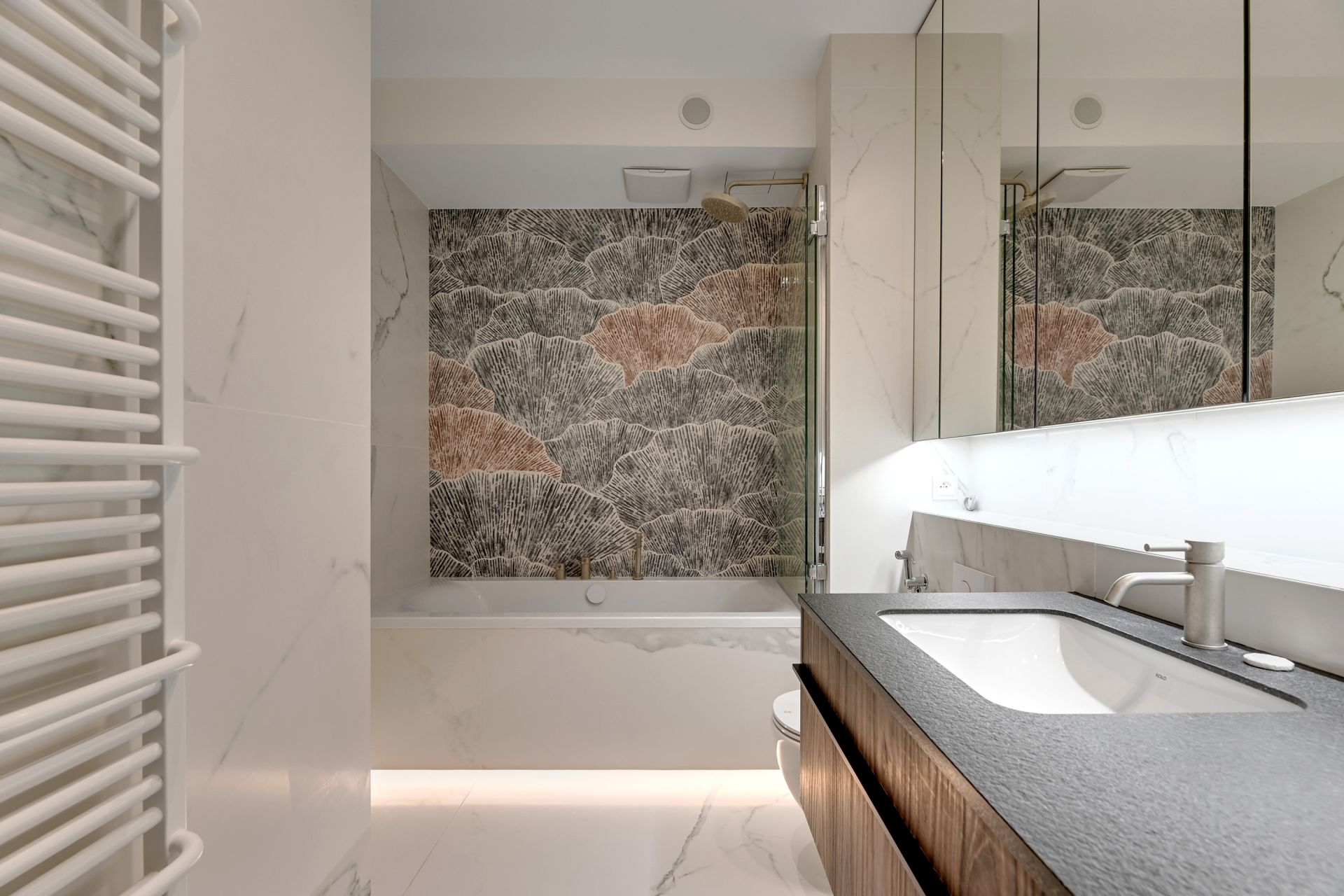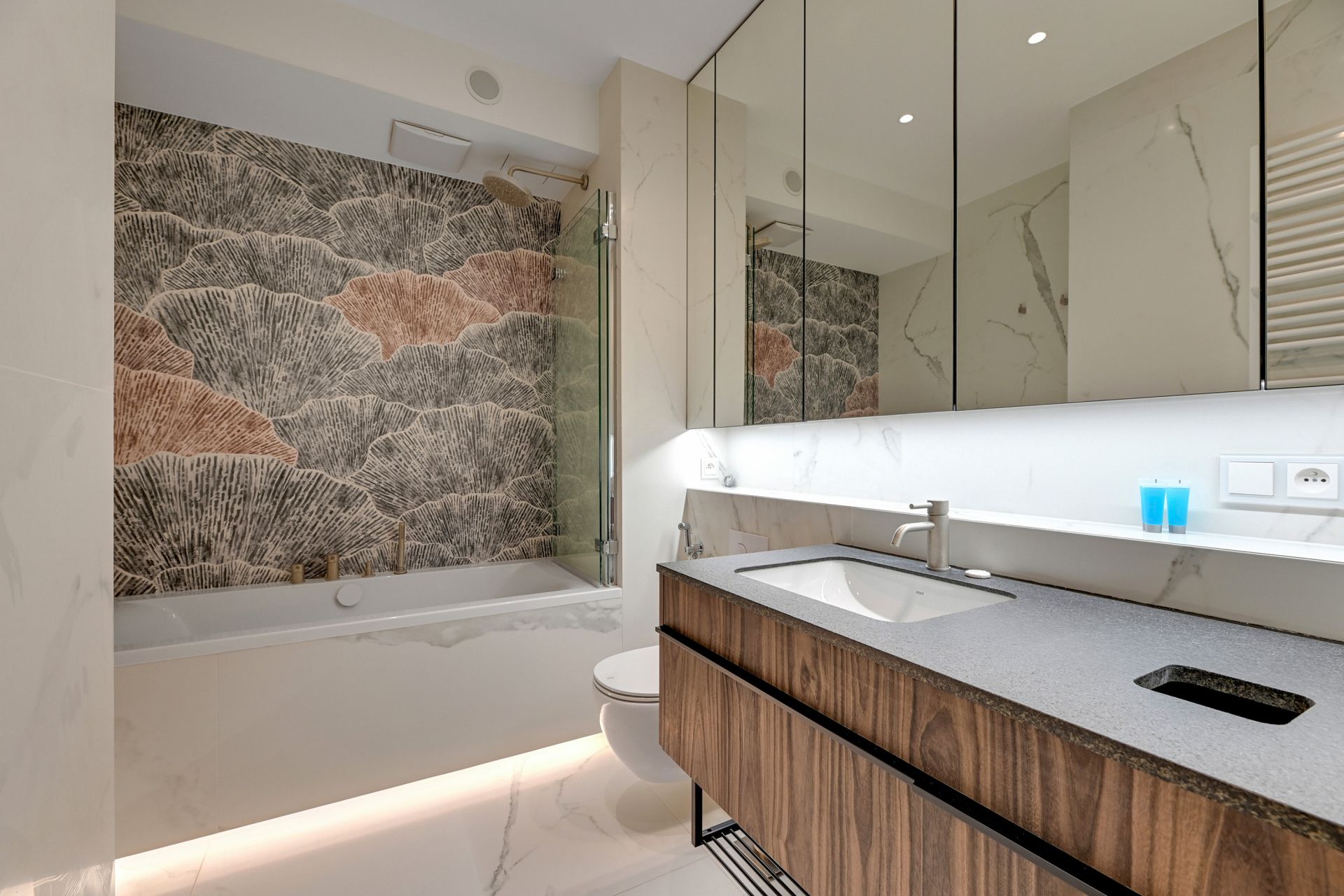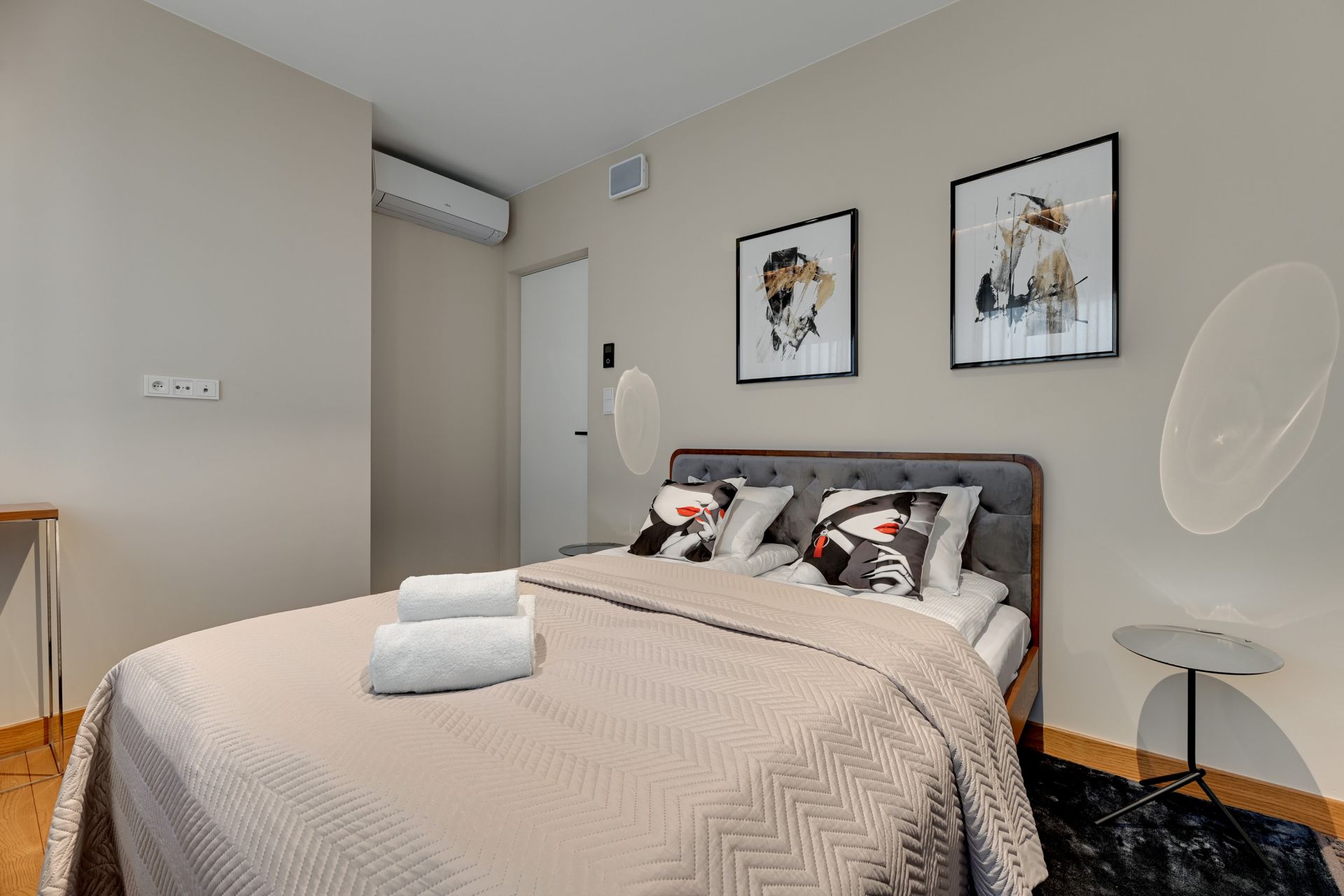 Przestronne i zaprojektowane z dbałością o każdy szczegół wnętrza zachwycają luksusowymi materiałami wykończeniowymi i designerskim oświetleniem. Dwie eleganckie sypialnie zapewniają oazę spokoju, a komfortowy salon z nowoczesnym aneksem kuchennym stanowi idealne miejsce do relaksu i wspólnych chwil. Dla większej wygody gości, apartament posiada dwie nowoczesne łazienki – jedną z komfortową wanną, idealną na relaksującą kąpiel, oraz drugą z praktycznym prysznicem.