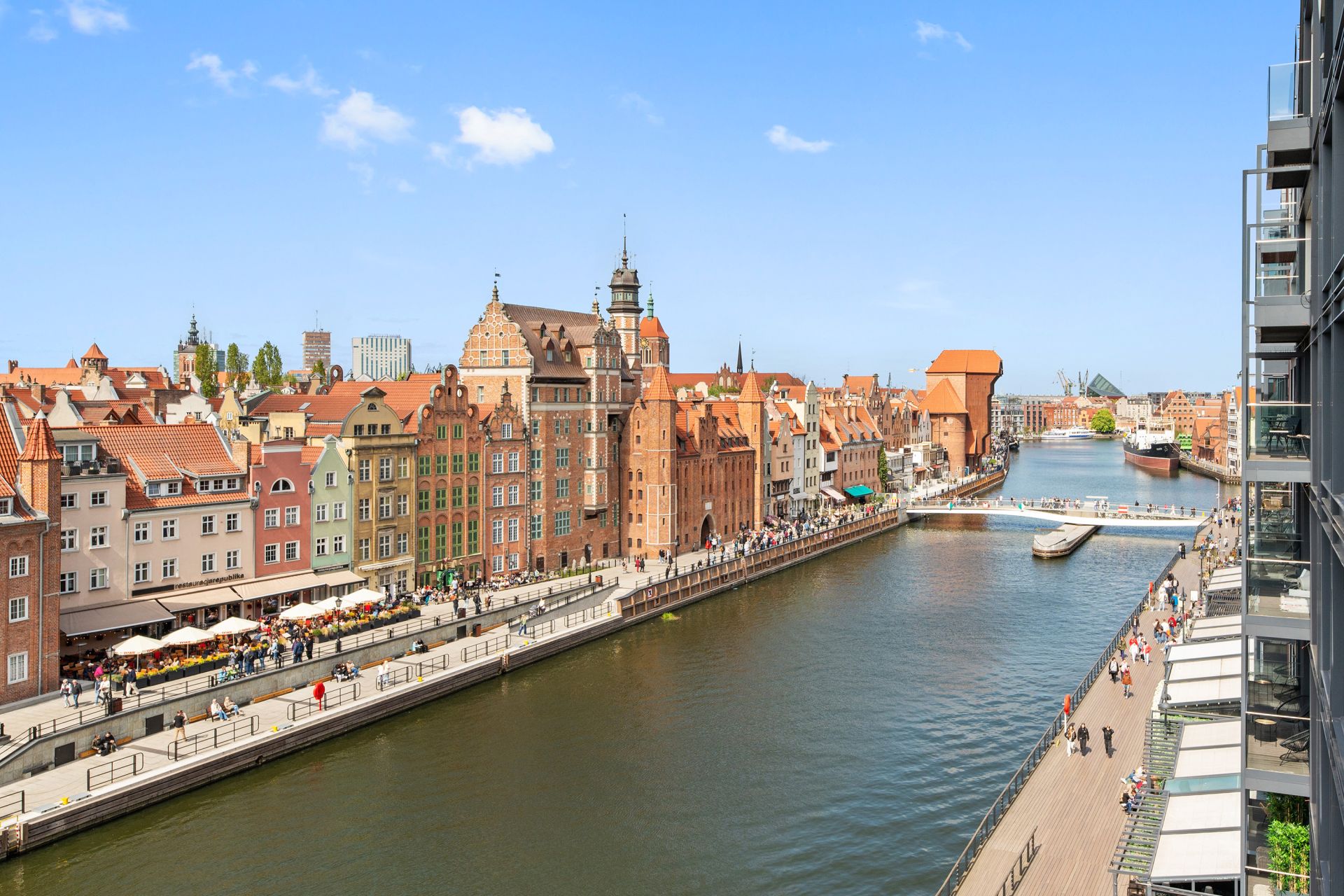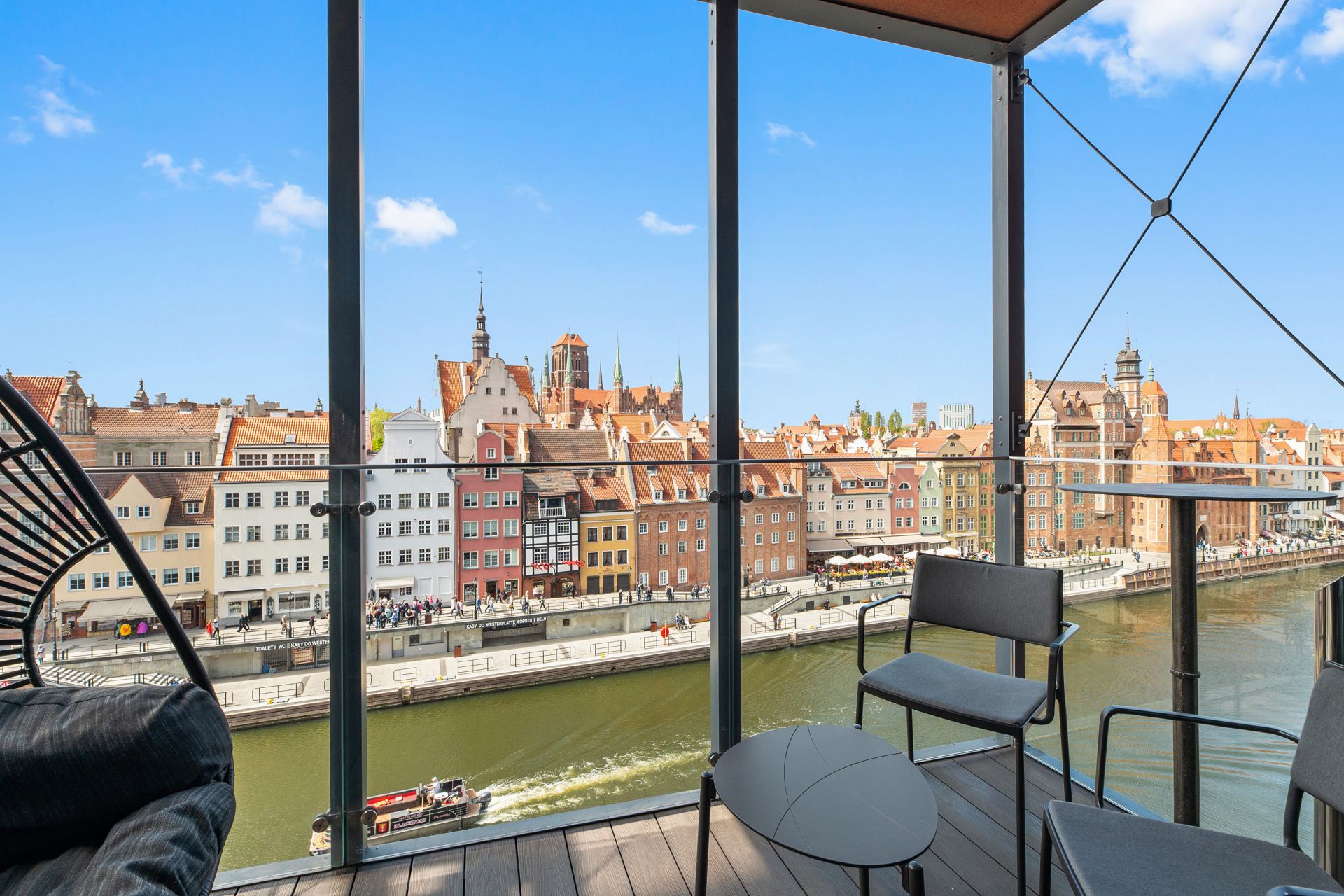 Jednak prawdziwą perłą tego apartamentu jest balkon z zapierającym dech w piersiach panoramicznym widokiem na malowniczą Motławę i zabytkową architekturę Starego Miasta. To idealne miejsce na poranną kawę lub wieczorny relaks, podziwiając uroki Gdańska.
