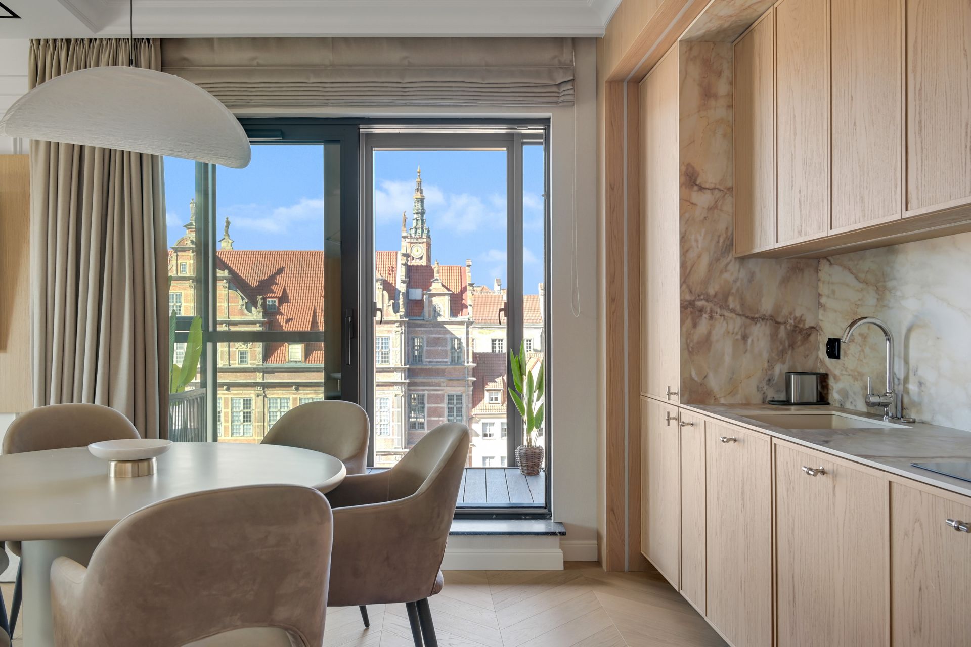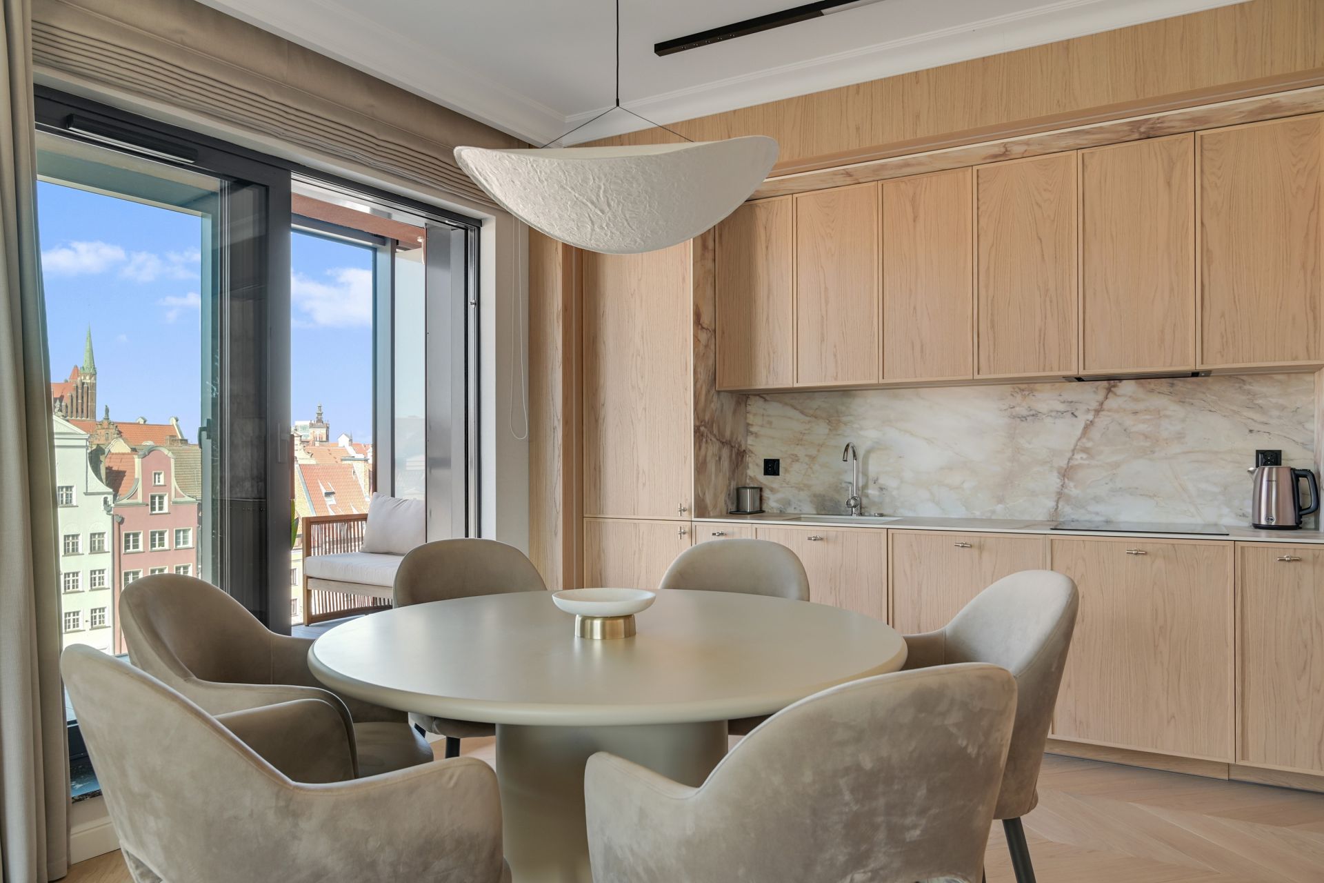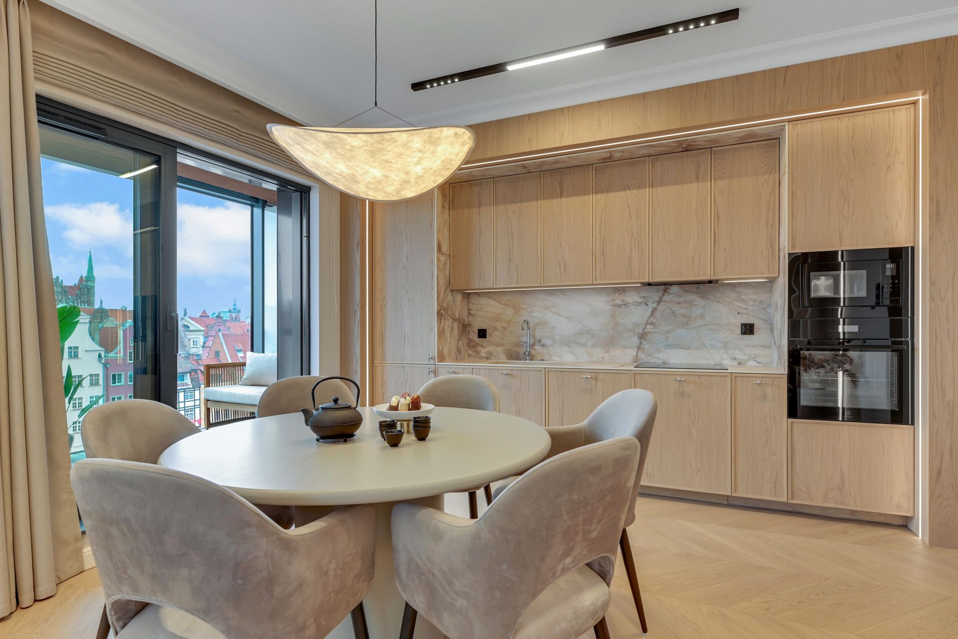 Wnętrza charakteryzują się harmonijnym połączeniem nowoczesnego designu z naturalnymi materiałami. Przestronny salon z panoramicznymi oknami i wyjściem na duży balkon zachwyca widokiem na rzekę i historyczną zabudowę Gdańska. To idealne miejsce na poranną kawę lub wieczorny relaks. W pełni wyposażona kuchnia z luksusowymi blatami i nowoczesnym sprzętem pozwoli Ci na przygotowanie dowolnego posiłku, a część jadalna stworzy idealne tło dla wspólnych spotkań.