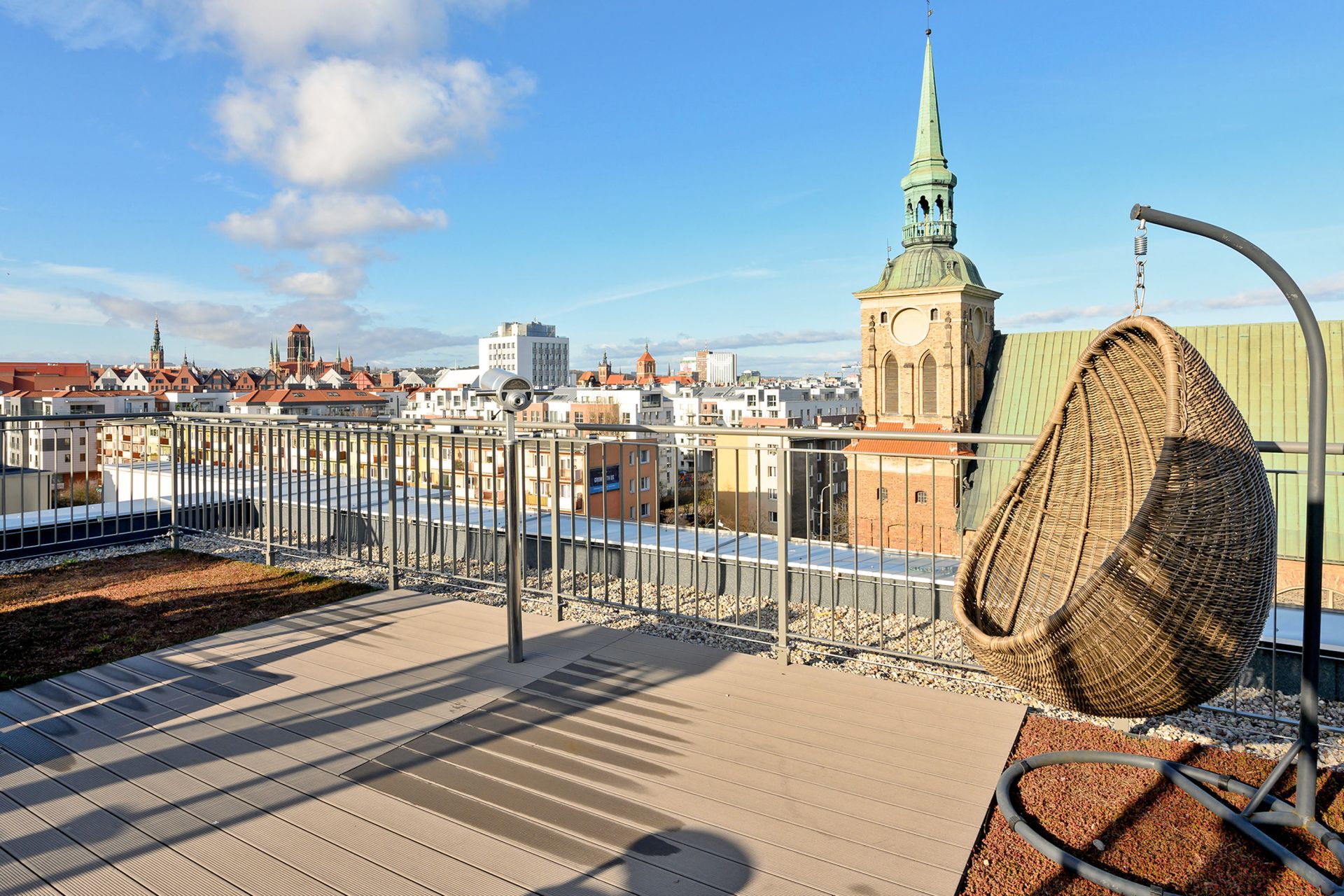 Nowoczesny, dwupokojowy apartament położony w urokliwej dzielnicy Gdańska, gdzie od Starego Miasta dzieli nas pięciominutowy spacer. Modny wystrój i funkcjonalne wnętrze spełnią oczekiwania nawet najbardziej wymagających gości. Oddzielna sypialnia z podwójnym łóżkiem, dodatkowo w salonie rozkładana sofa oraz w pełni wyposażony aneks kuchenny i łazienka z prysznicem. Na dachu budynku usytuowany jest przestronny taras ze zniewalającym widokiem na Stare Miasto. Otaczające go ogrody oraz miejsca przeznaczone do relaksu dodają mu niesamowitego uroku oraz klimatu. Taras przeznaczony jest do użytku wszystkich mieszkańców. W pobliżu zlokalizowane są takie atrakcje, jak Fontanna Neptuna, Polska Filharmonia Bałtycka i Brama Zielona.