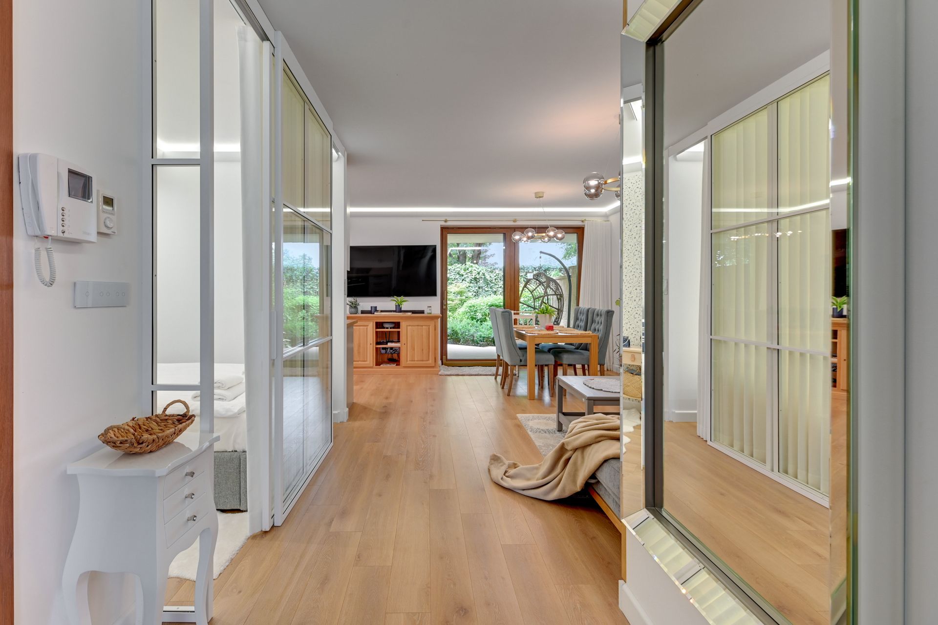 Dużym atutem apartamentu jest taras z drewnianą podłogą, otoczony zielenią. To idealne miejsce na poranną kawę, śniadanie lub wieczorny relaks. Bezpośrednie wyjście na taras zapewnia poczucie bliskości z naturą, nawet w środku miasta.