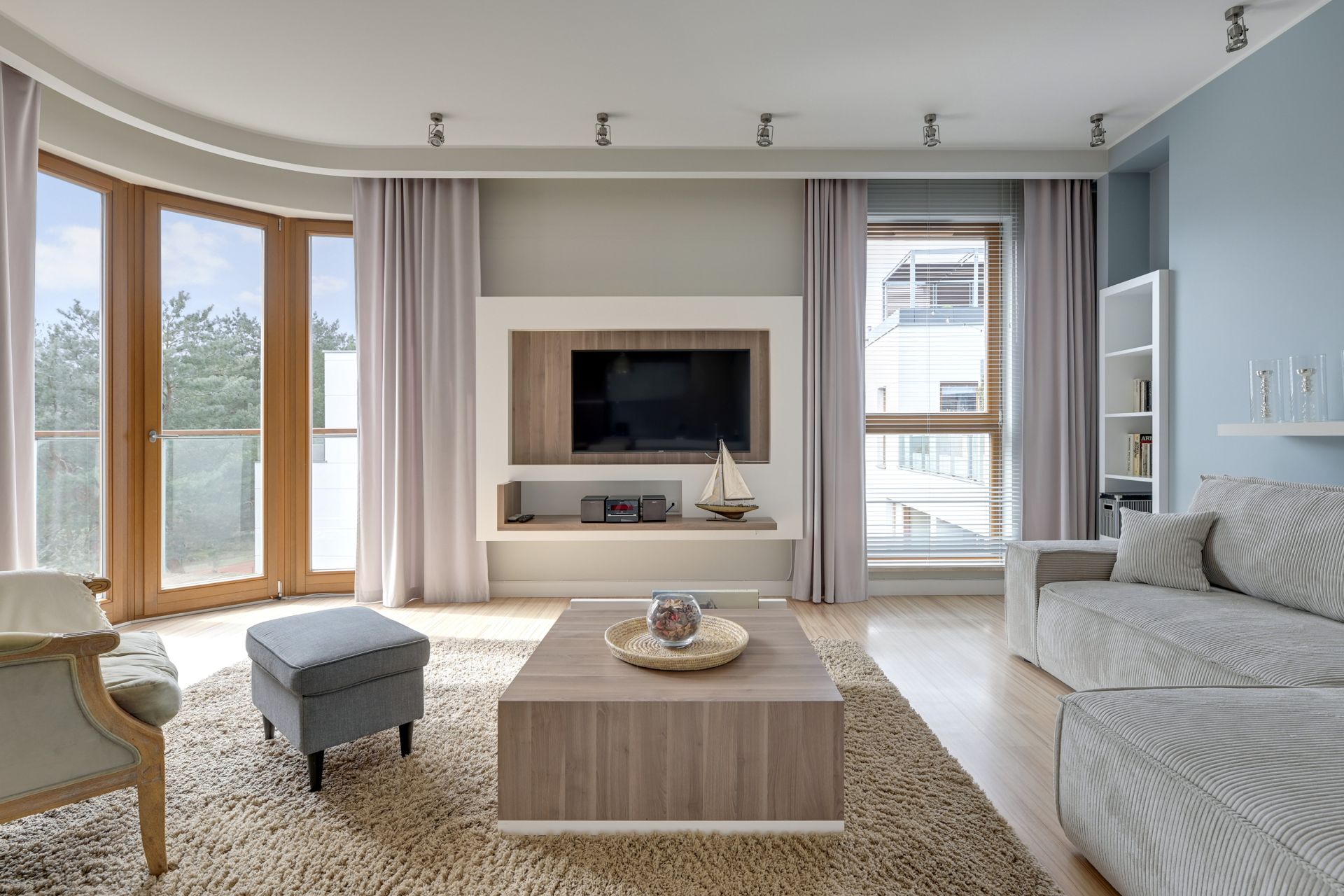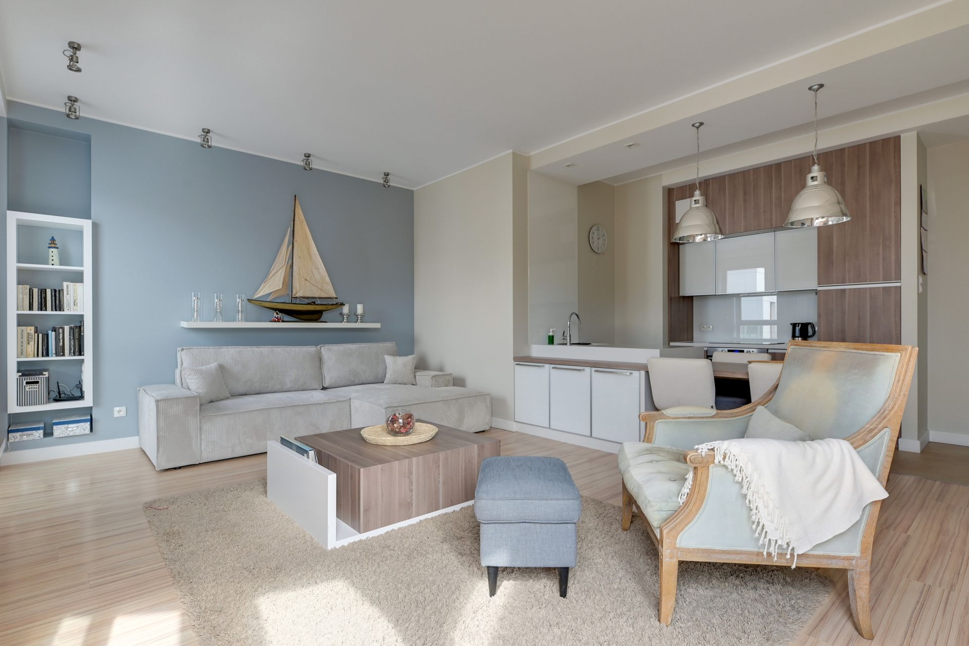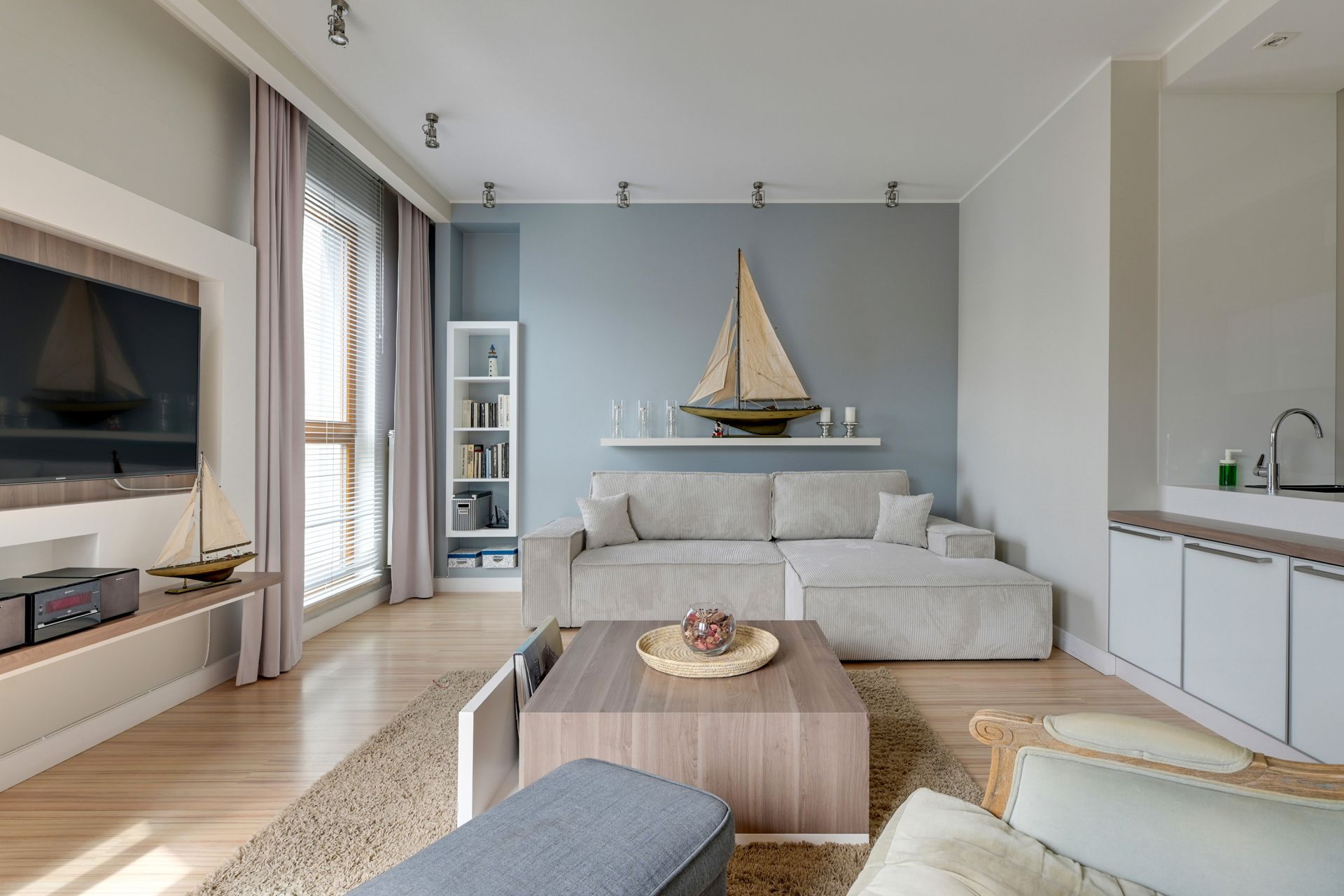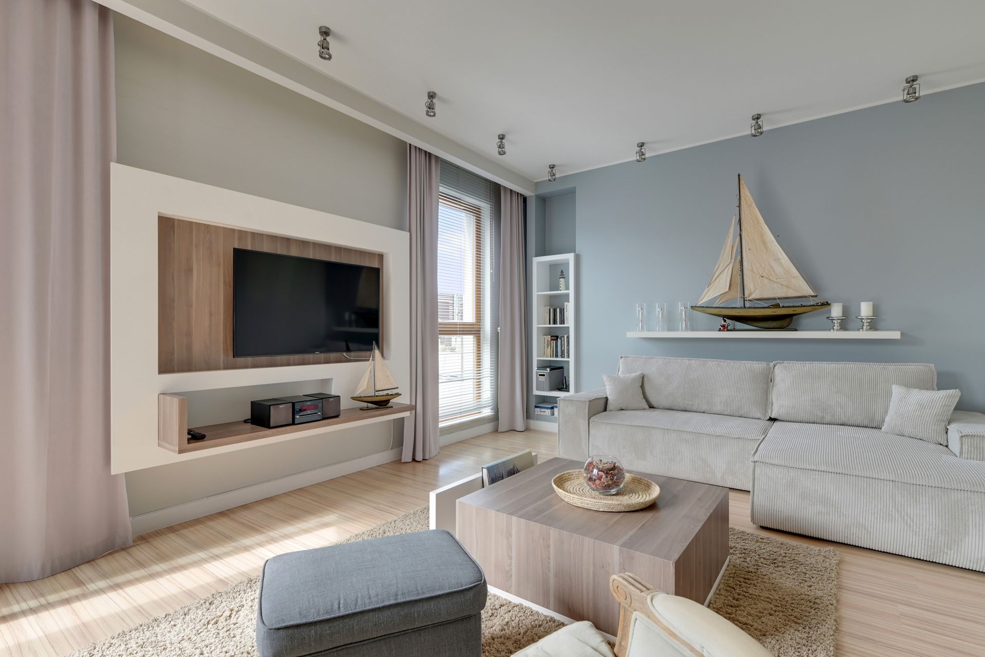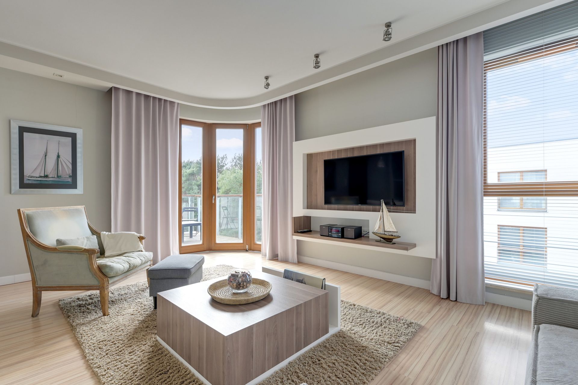 Centralnym punktem jest jasny salon zdobiony modelami żaglowców. Przestrzeń wypełnia duża, wygodna narożna sofa i TV, a szerokie przeszklenia prowadzą na prywatny balkon.