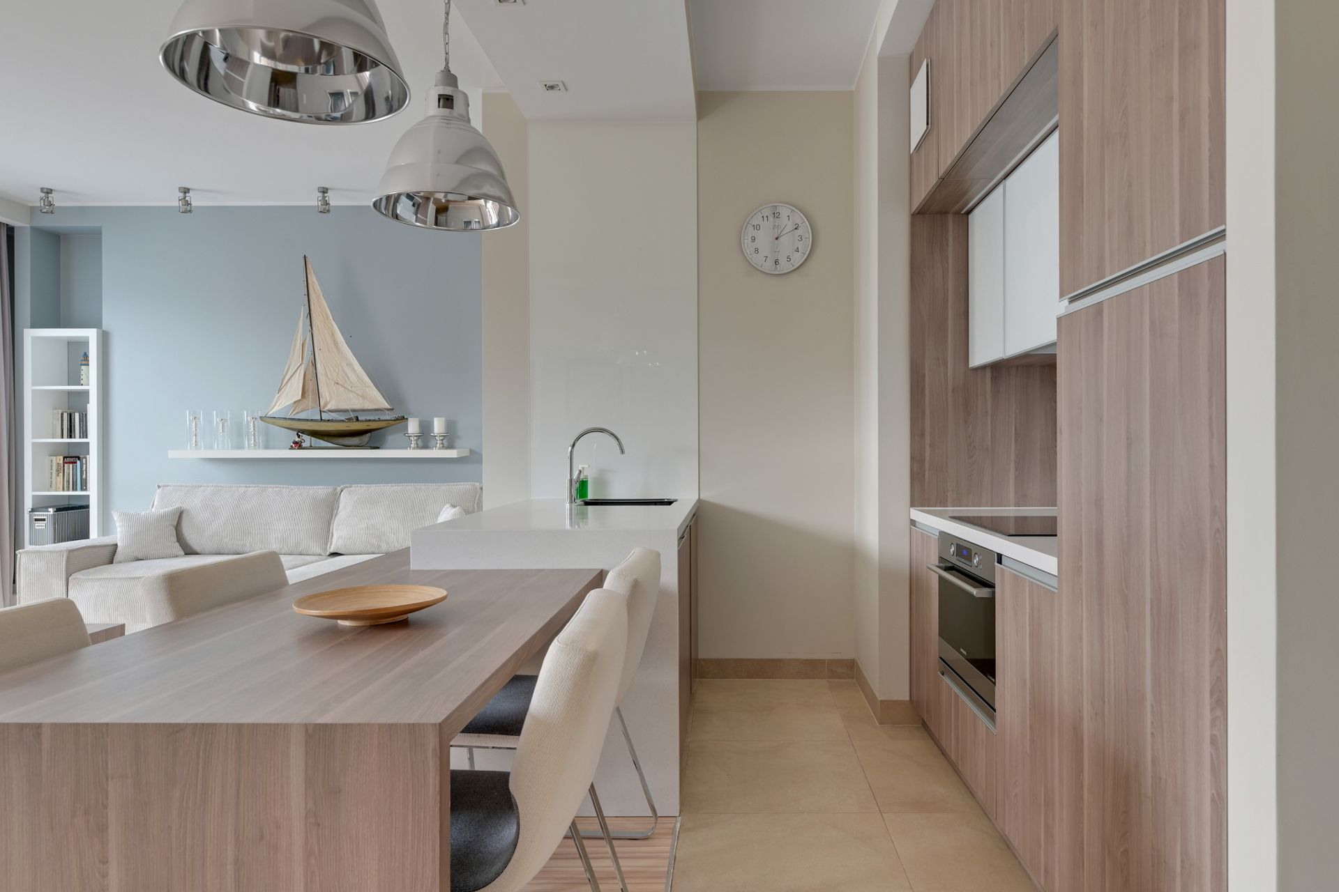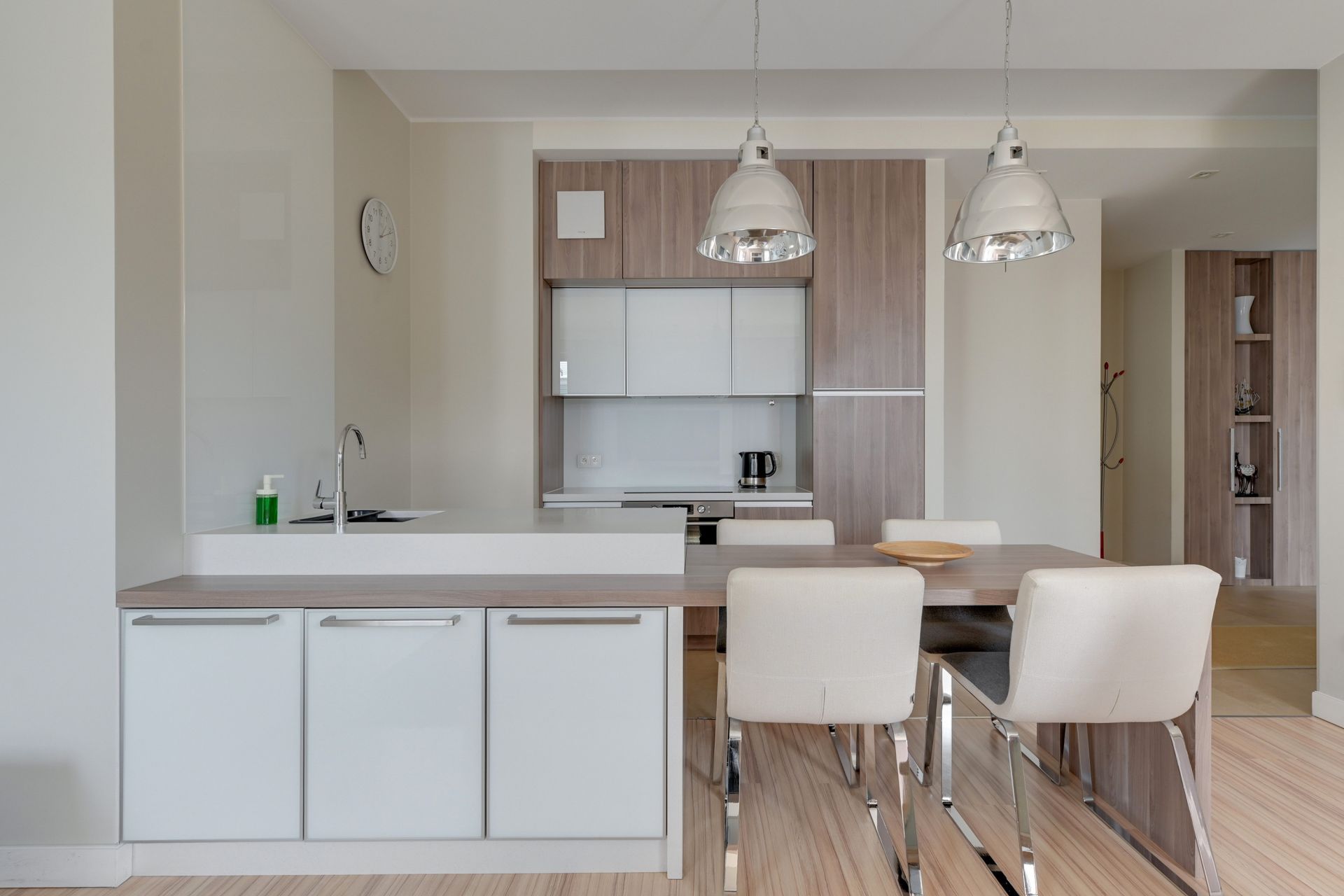 Nowoczesny aneks kuchenny z elementami drewna jest w pełni wyposażony (lodówka, zmywarka, piekarnik, ekspres do kawy). Posiłki można spożywać przy eleganckim, okrągłym stole jadalnym.