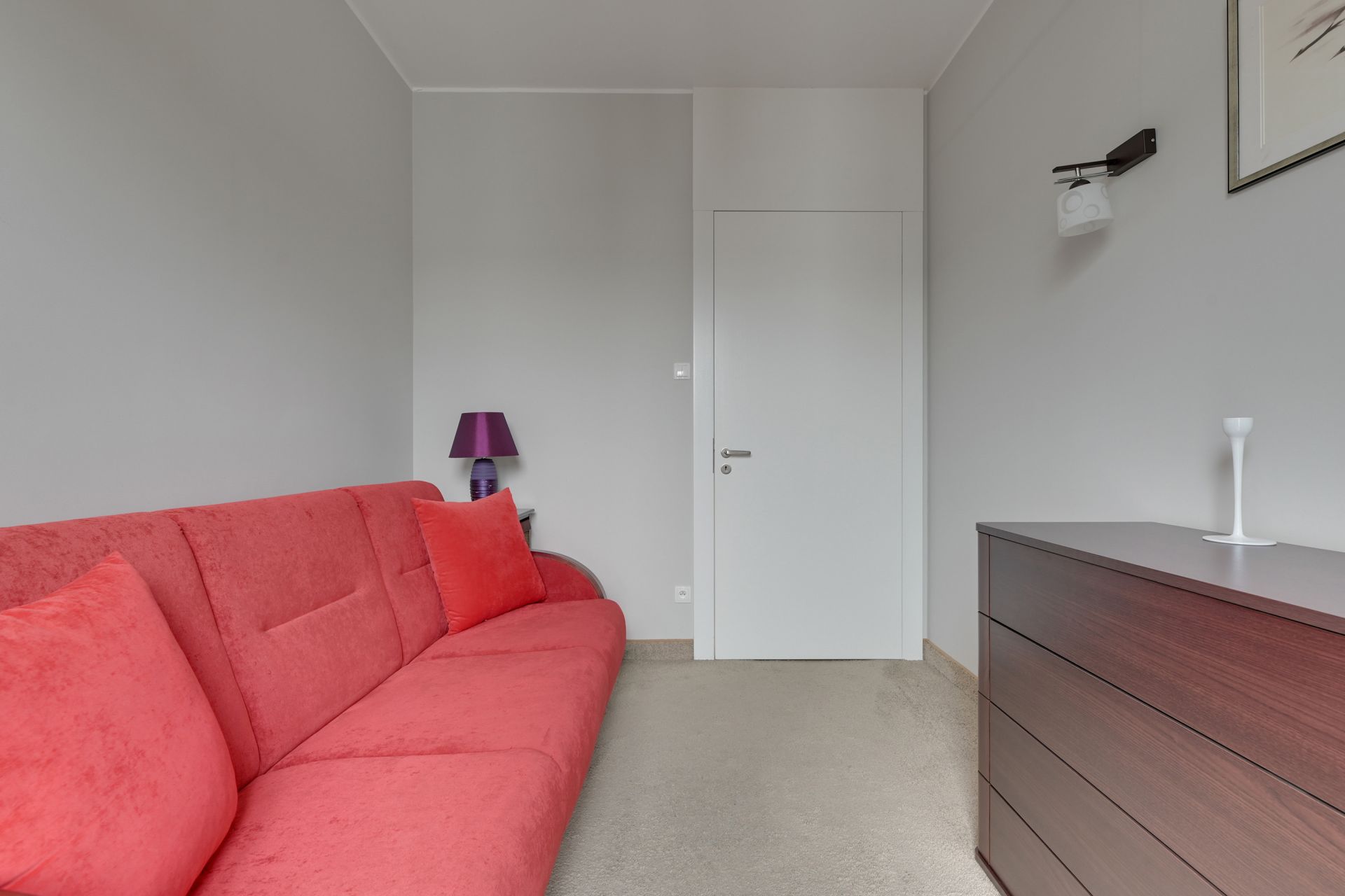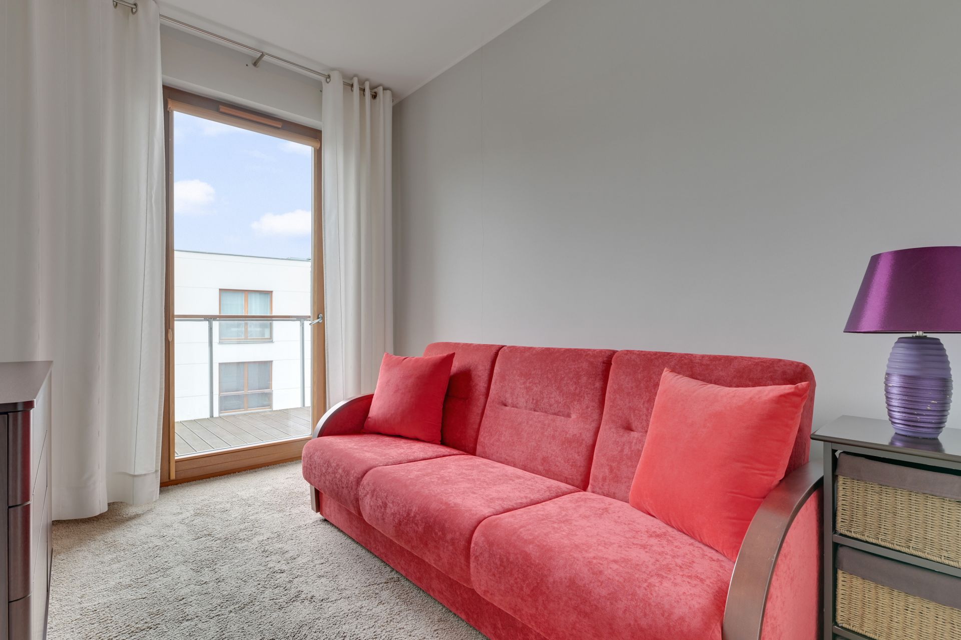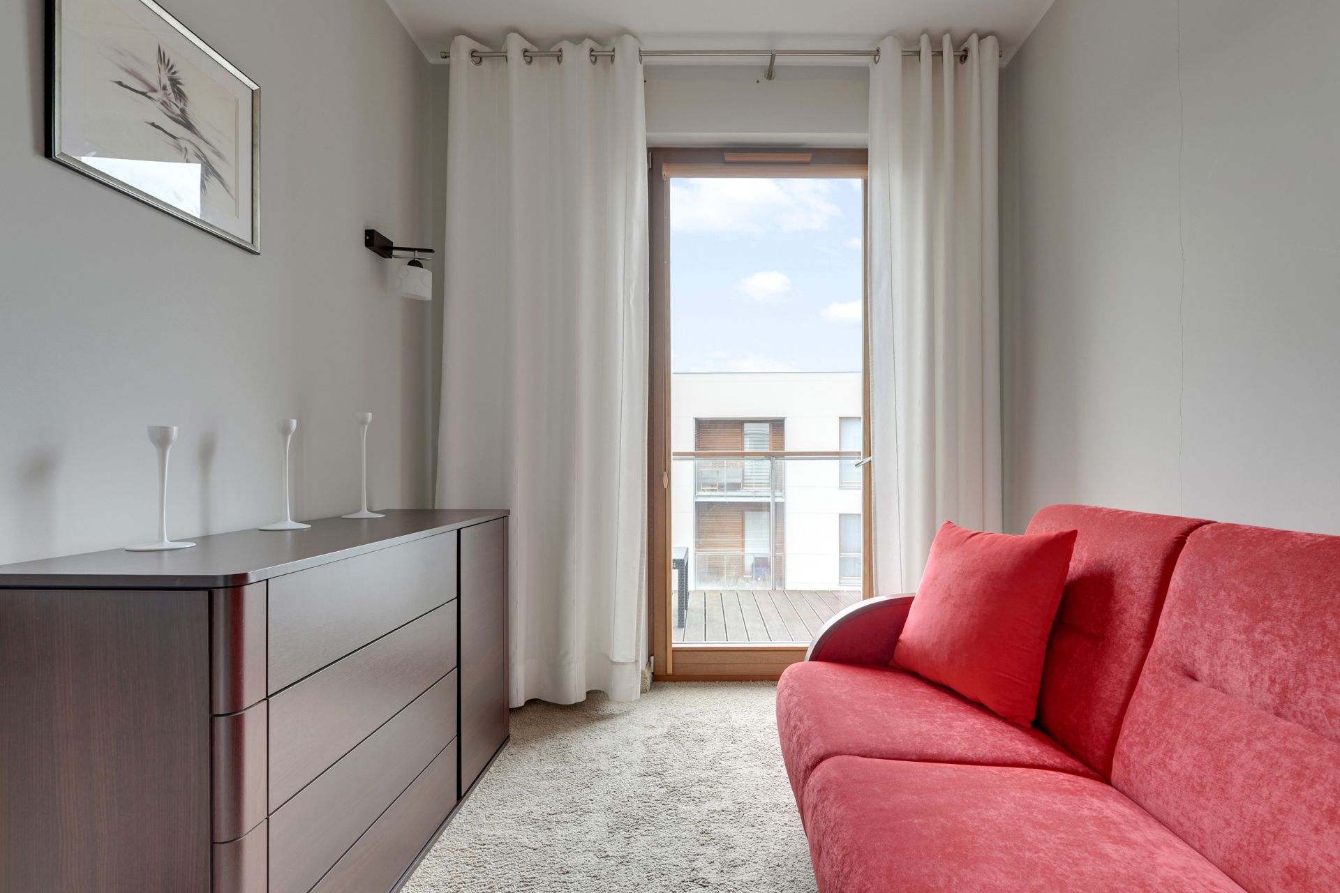Oferuje wygodną, rozkładaną czerwoną sofę oraz biurko z krzesłem, tworząc wygodną przestrzeń do pracy.