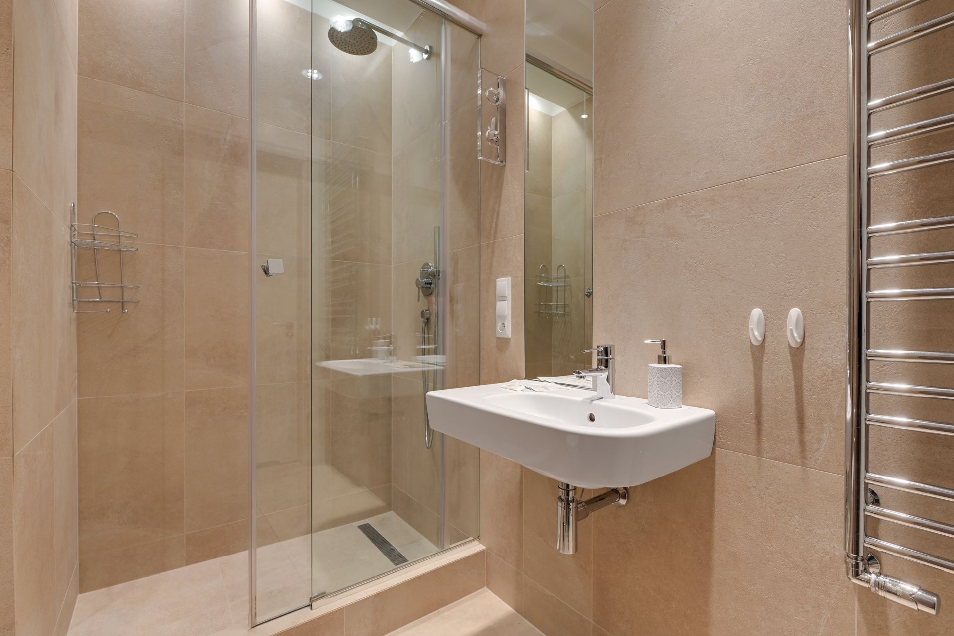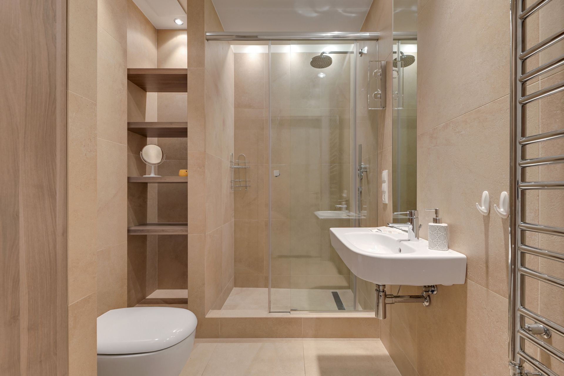 Stylowe wnętrze wyposażone w przestronny prysznic typu walk-in z deszczownicą oraz w pralkę.