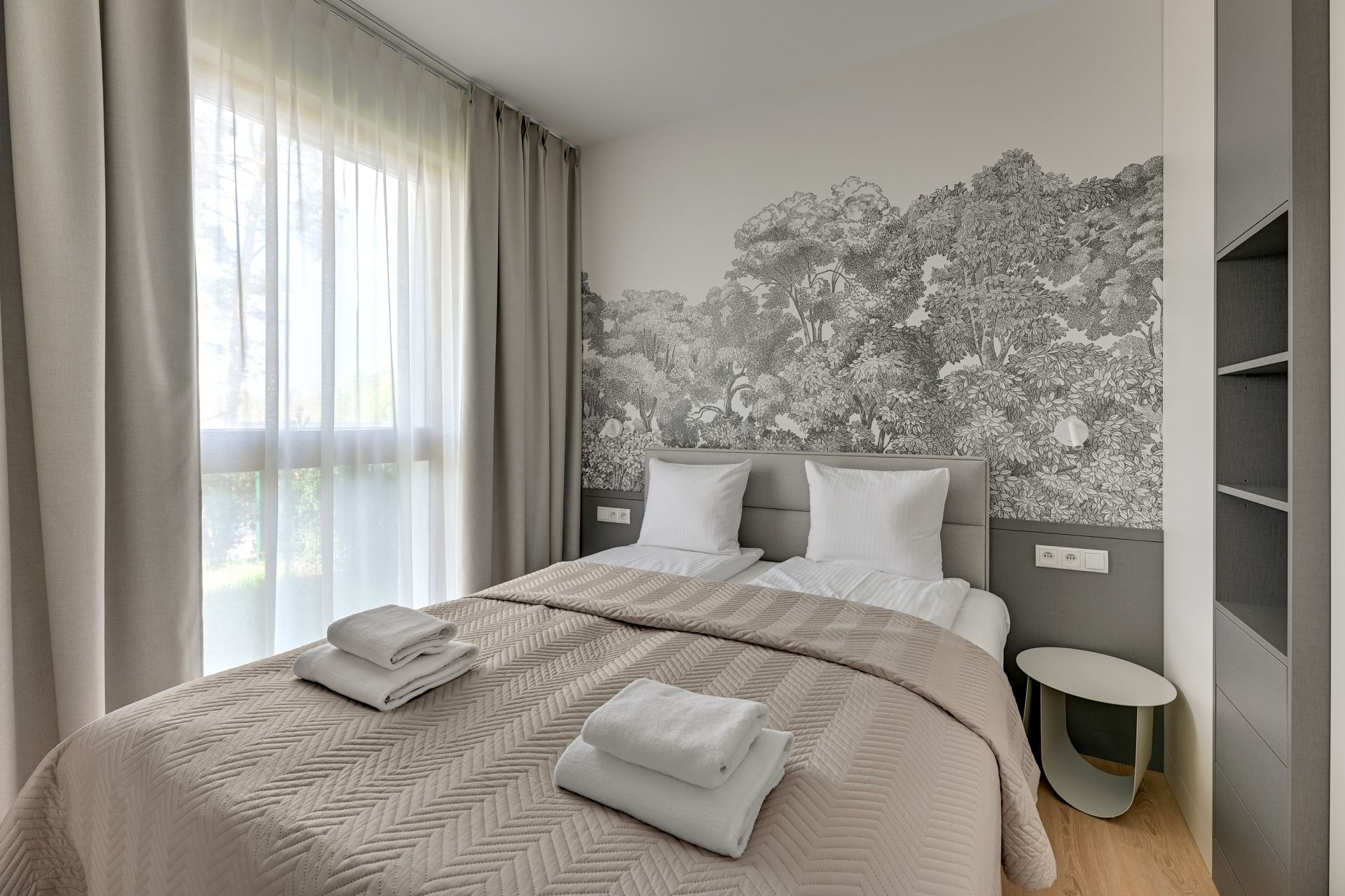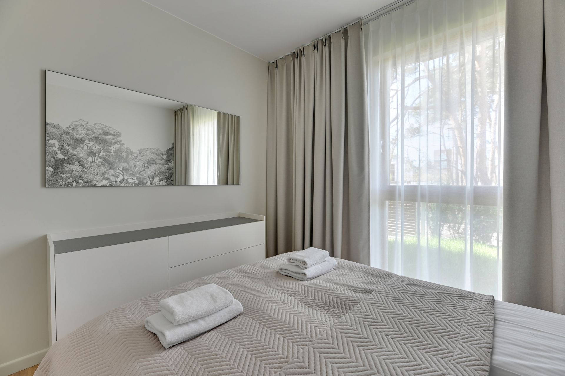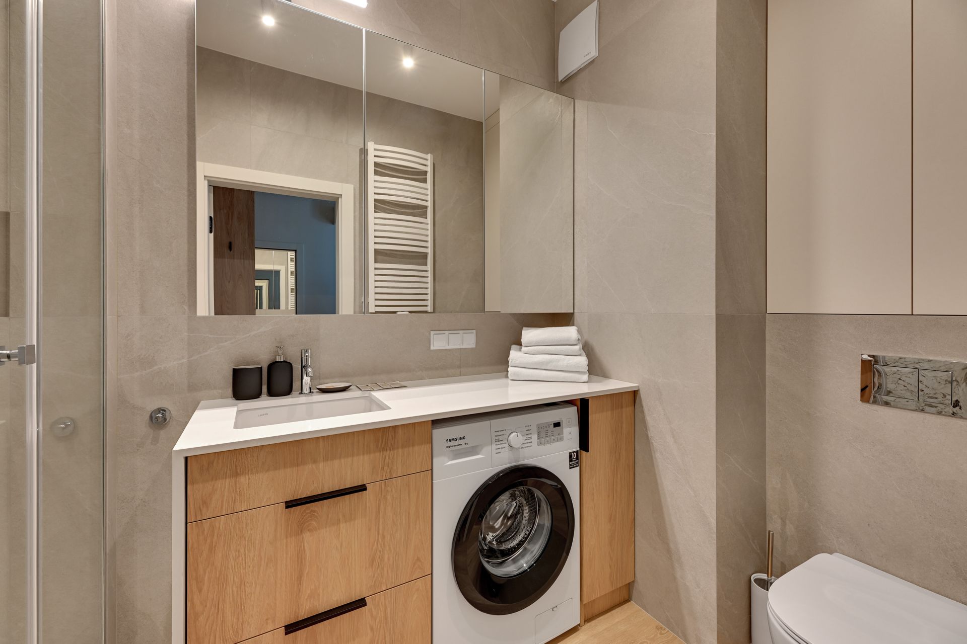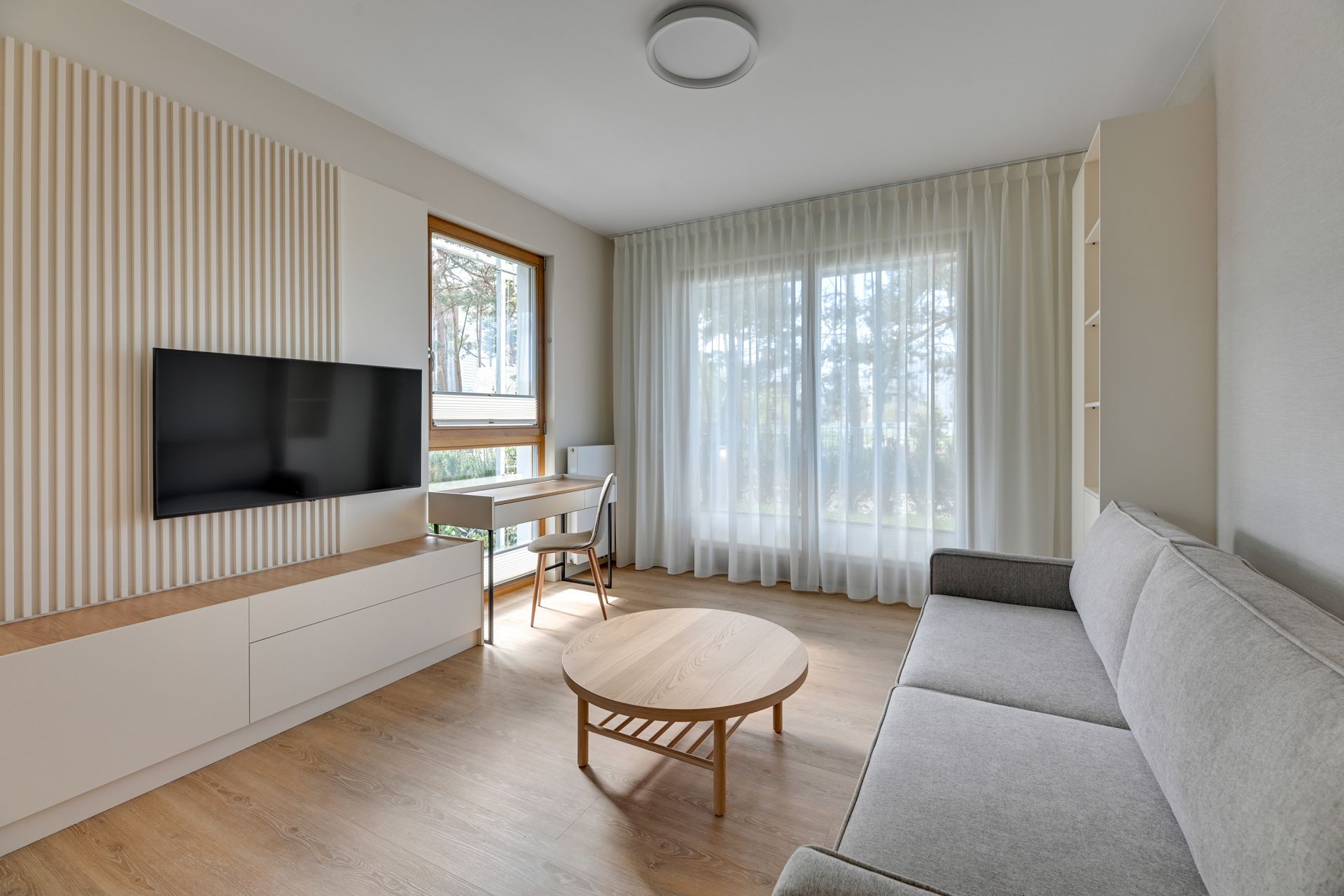 Apartament, przeznaczony dla maksymalnie 4 osób, oferuje jedną przytulną sypialnię oraz przestronny salon z aneksem kuchennym. Salon, utrzymany w spokojnej palecie szarości i beżów, zachęca do relaksu na wygodnej sofie. Praktyczny aneks kuchenny jest w pełni wyposażony, umożliwiając swobodne przygotowywanie posiłków. Dodatkowym atutem jest kącik do pracy z biurkiem, idealny dla osób potrzebujących przestrzeni do pracy zdalnej. Nowoczesna łazienka z prysznicem i pralką zapewnia komfortowy pobyt.