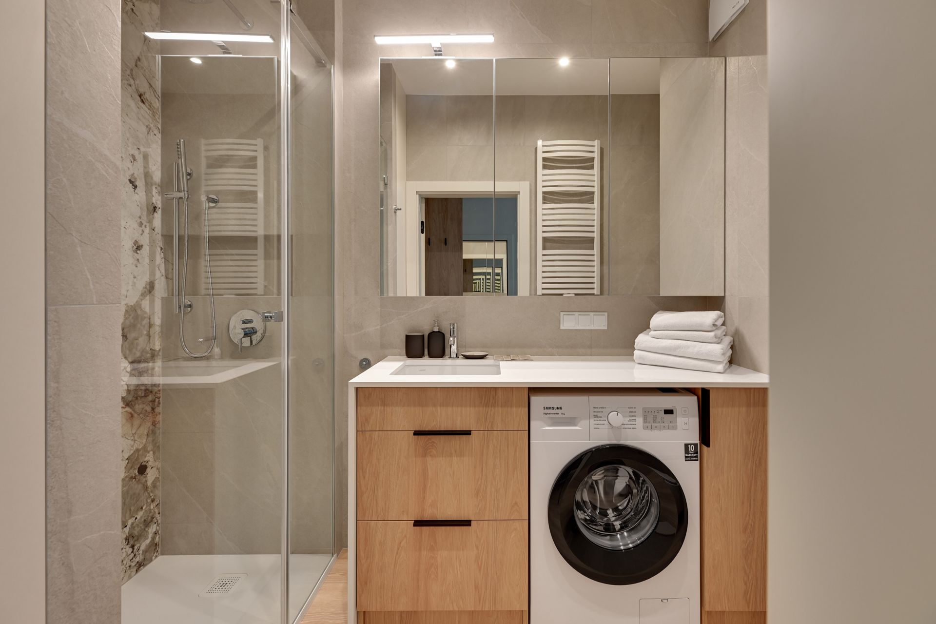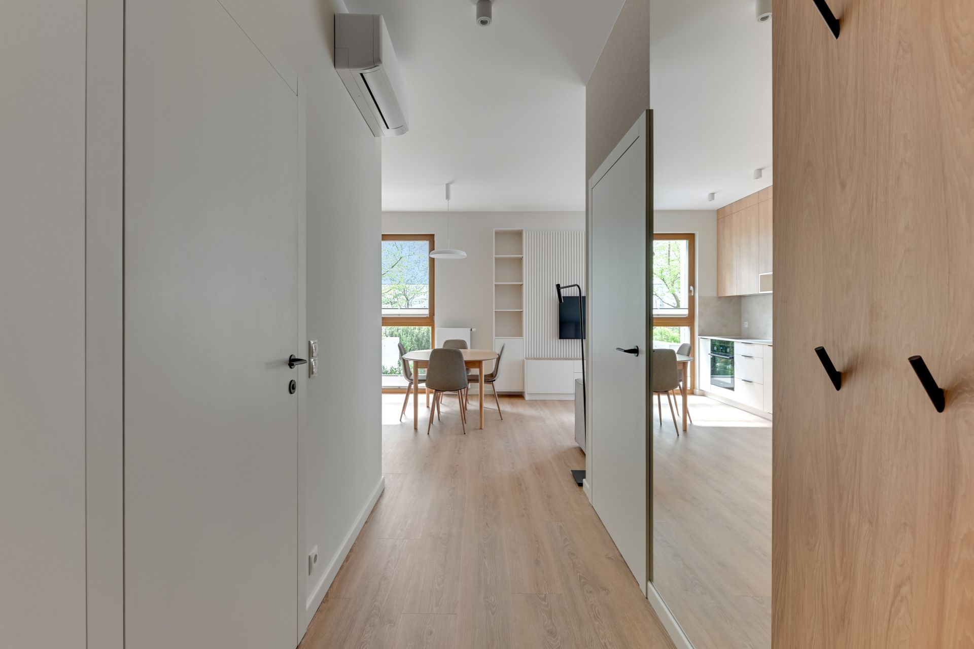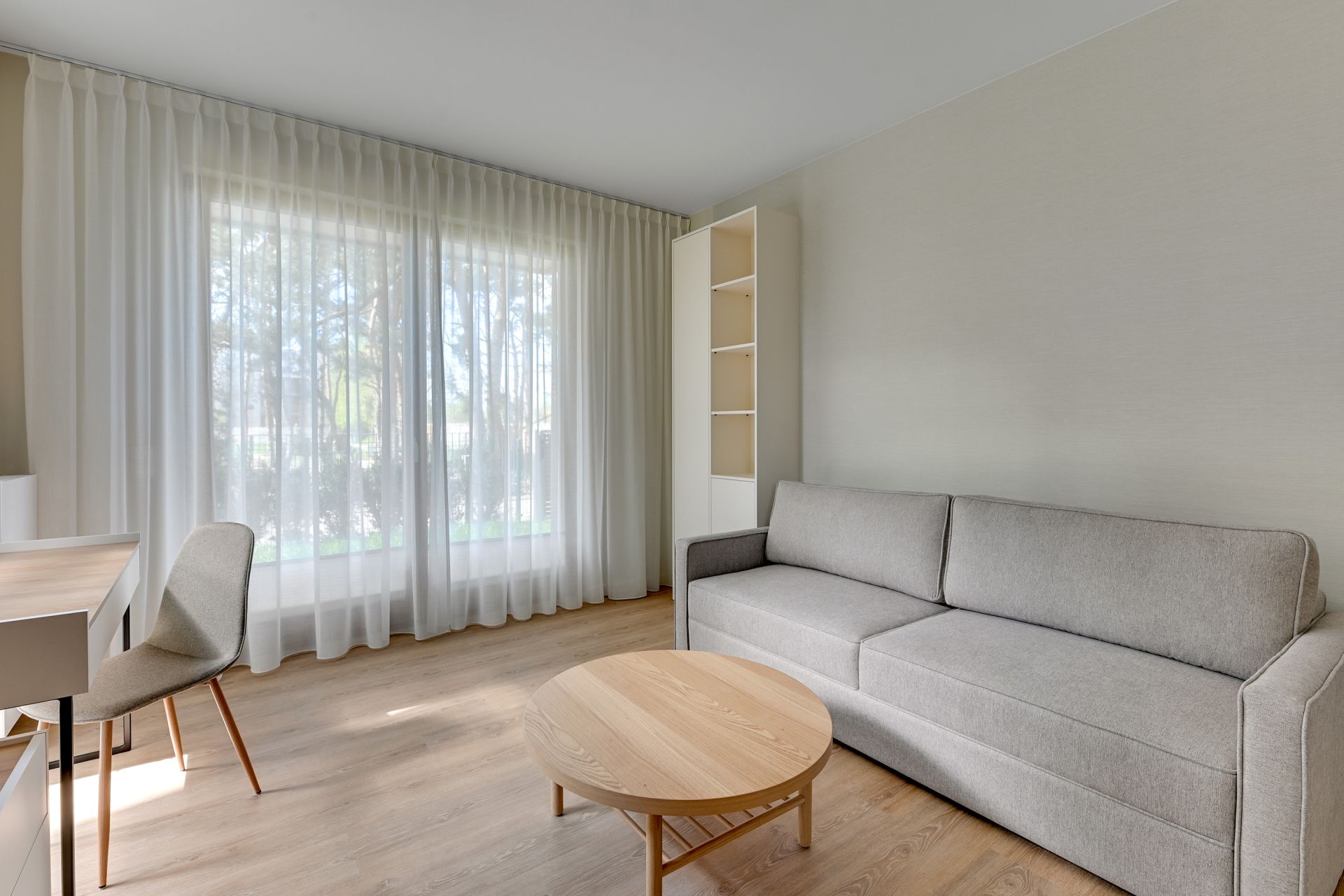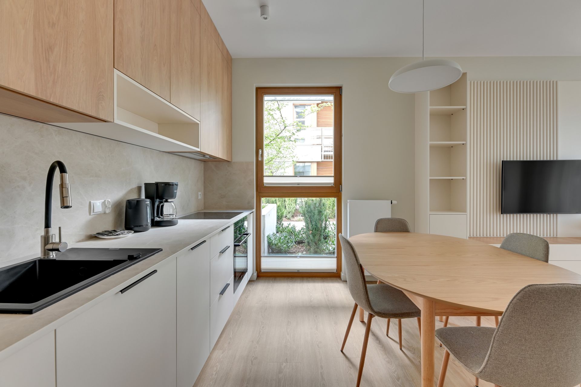 Apartament, przeznaczony dla maksymalnie 4 osób, oferuje jedną przytulną sypialnię oraz przestronny salon z aneksem kuchennym. Salon, utrzymany w spokojnej palecie szarości i beżów, zachęca do relaksu na wygodnej sofie. Praktyczny aneks kuchenny jest w pełni wyposażony, umożliwiając swobodne przygotowywanie posiłków. Dodatkowym atutem jest kącik do pracy z biurkiem, idealny dla osób potrzebujących przestrzeni do pracy zdalnej. Nowoczesna łazienka z prysznicem i pralką zapewnia komfortowy pobyt.