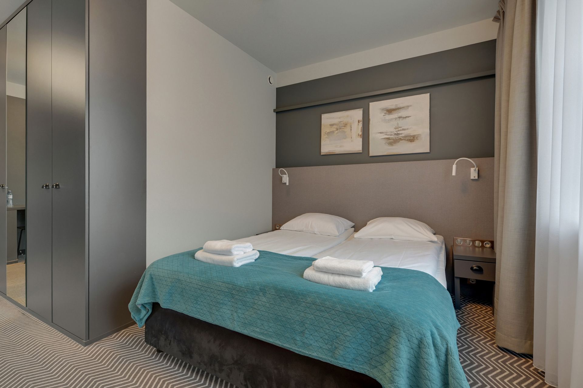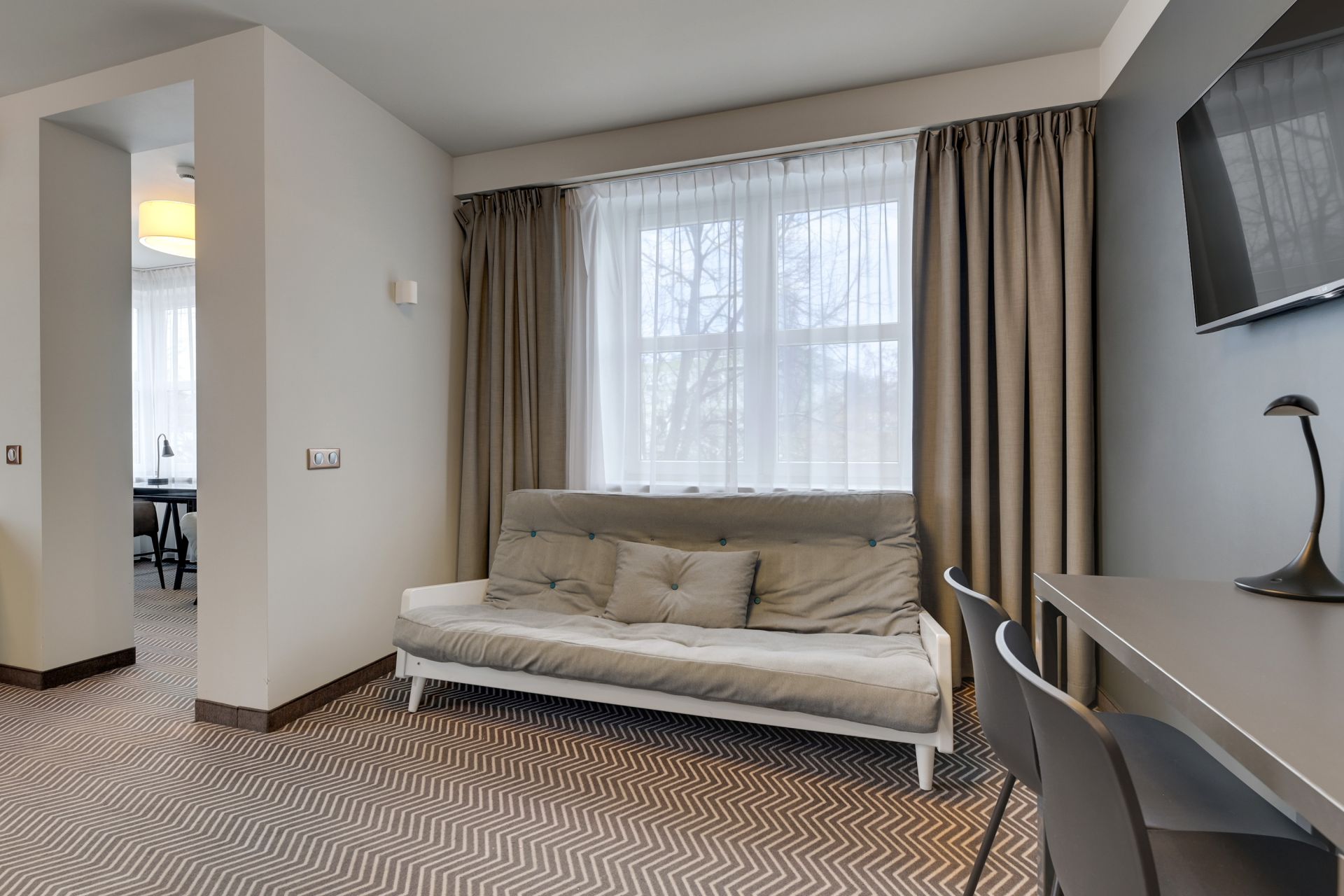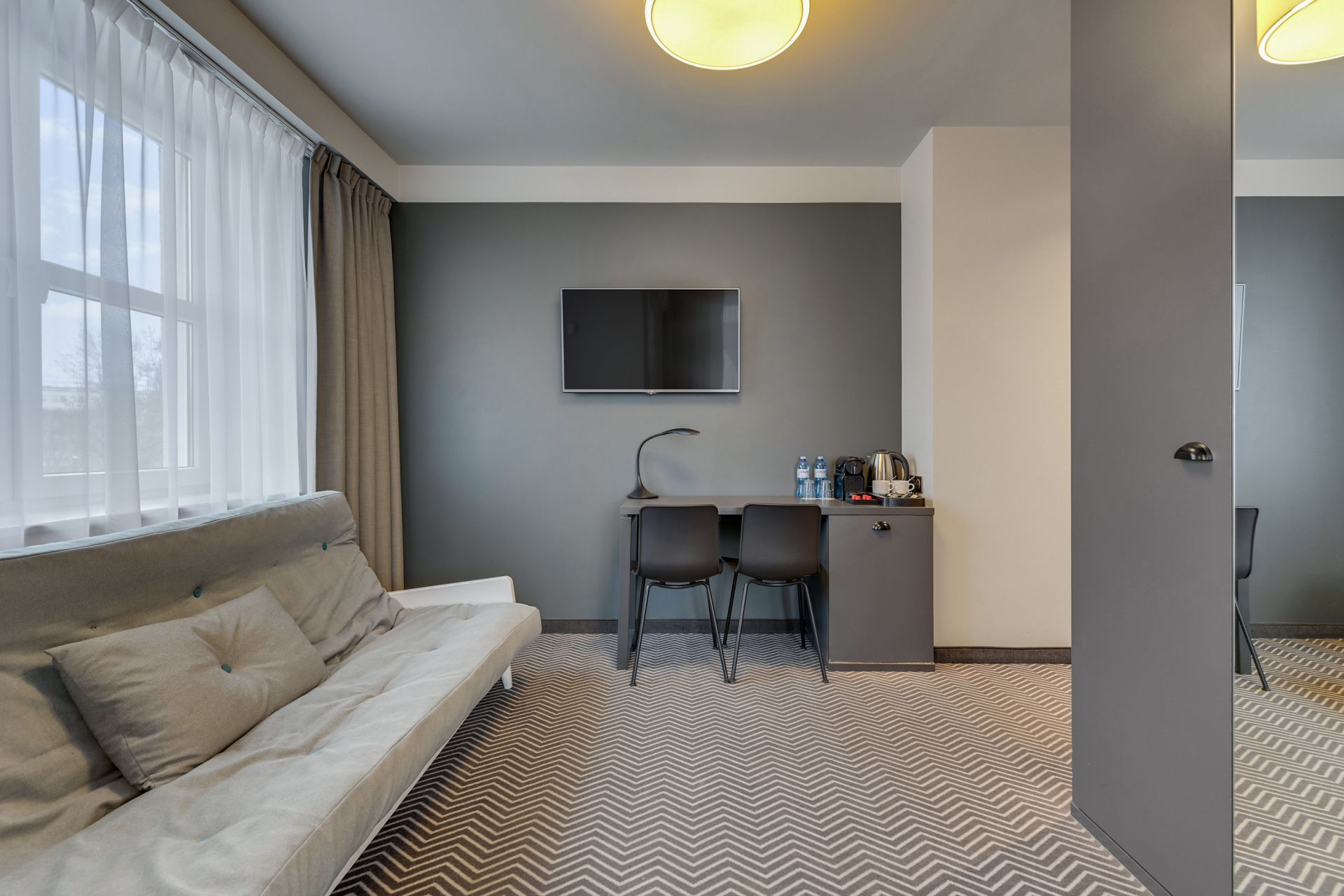 Pokój dwuosobowy typu deluxe o powierzchni 30 m² to przestronny i luksusowy wybór, idealny zarówno do wypoczynku, jak i pracy. Wyposażony w wygodne łóżko queen size o wymiarach 160x200 cm oraz dodatkową sofę. Do dyspozycji gości są również mała lodówka oraz ekspres do kawy. Pokój posiada oddzielną strefę do pracy z biurkiem, zapewniając idealne warunki dla osób łączących podróż z obowiązkami zawodowymi.