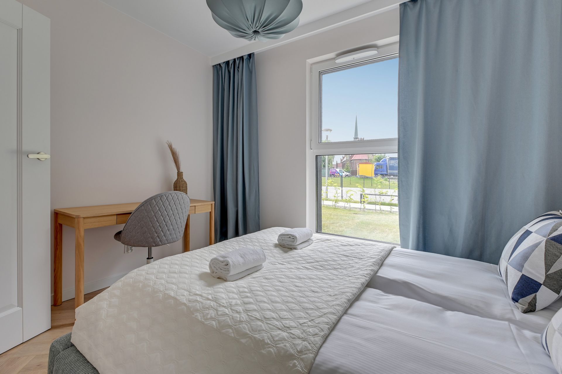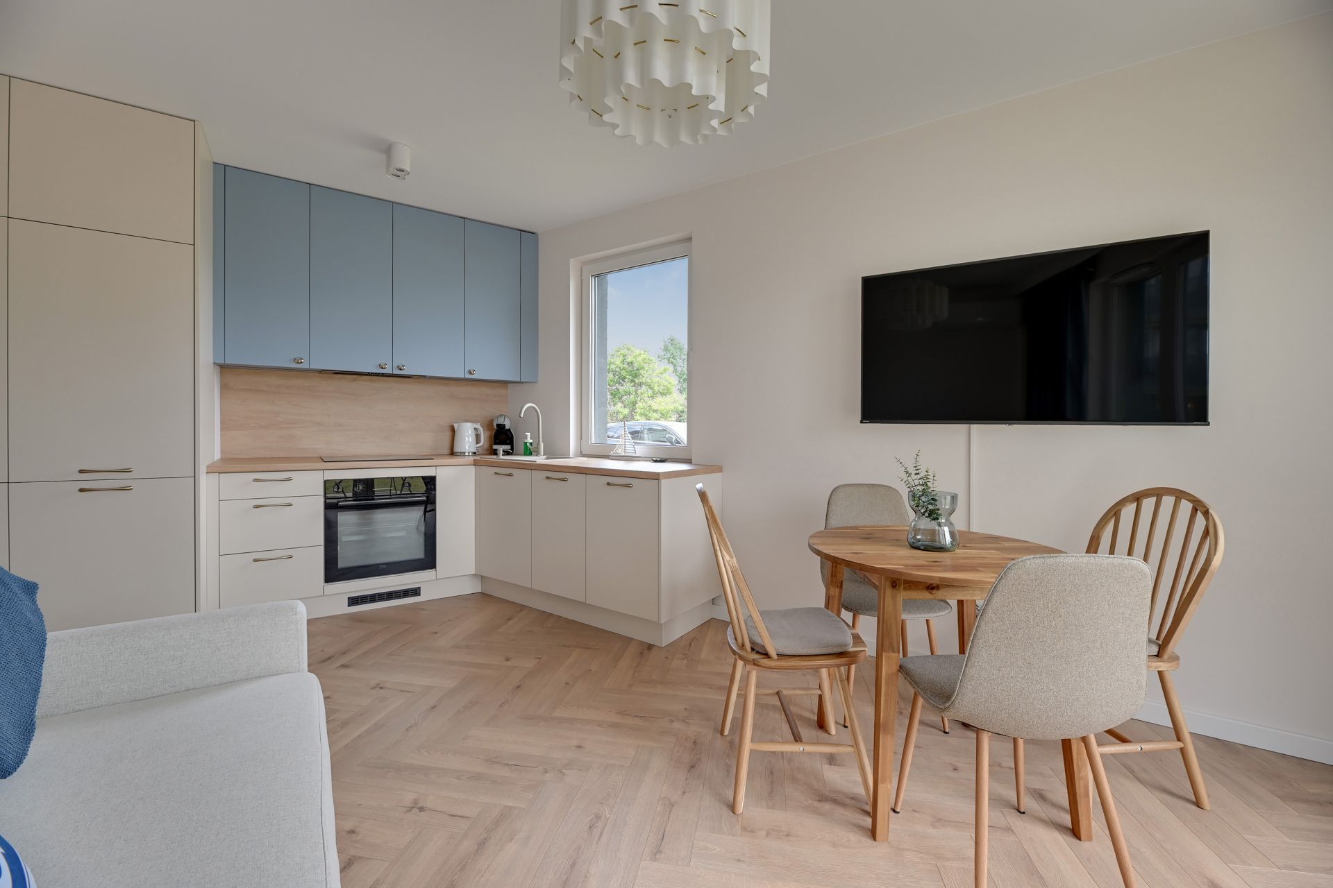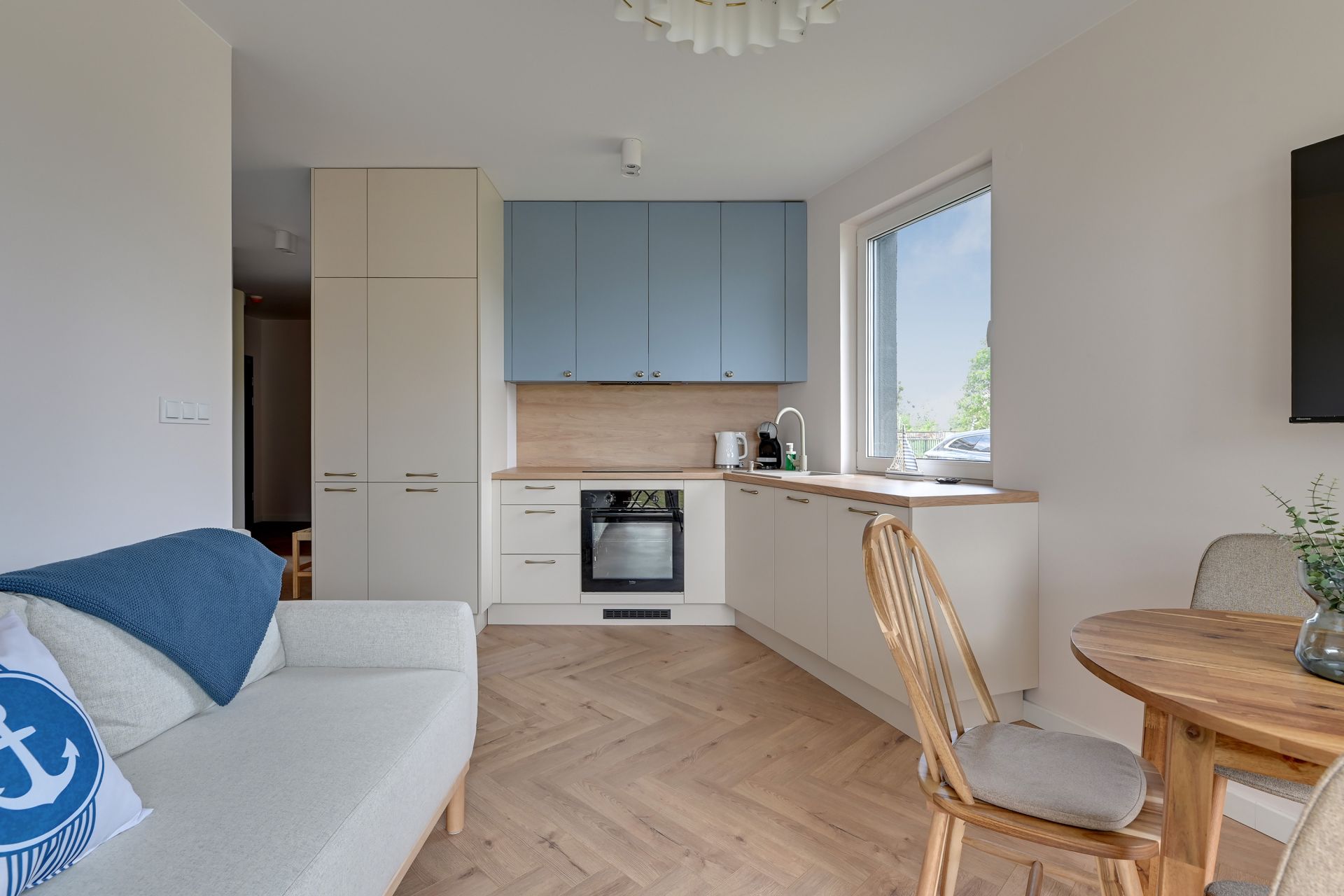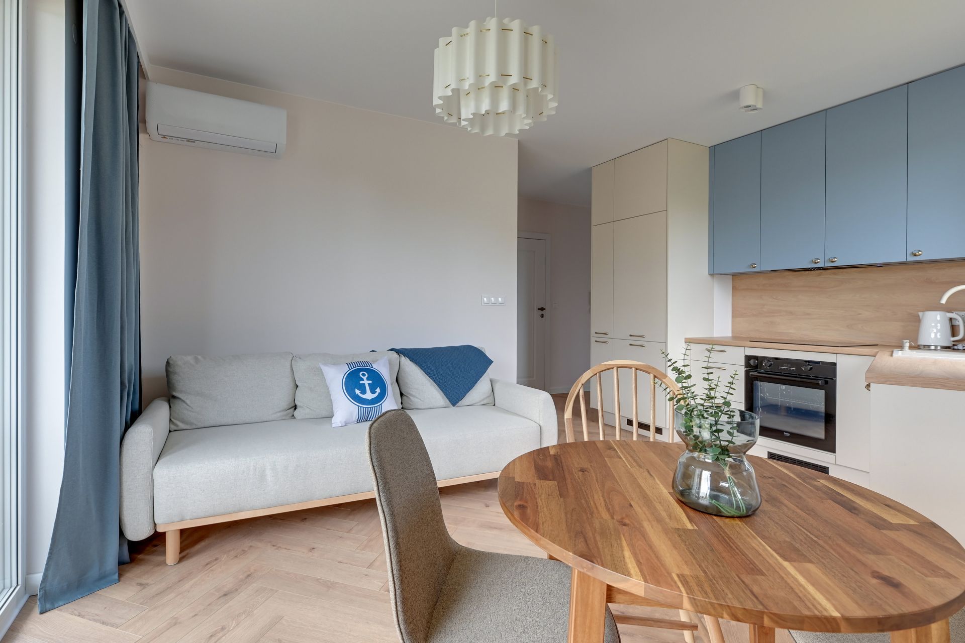 Wnętrze o powierzchni 47 m² zostało zaprojektowane z myślą o relaksie i funkcjonalności, urzekając nowoczesnym designem z dyskretnymi akcentami marynistycznymi. Apartament składa się z dwóch przytulnych sypialni oraz jasnego salonu z aneksem kuchennym. W pierwszej sypialni znajdziecie wygodne łóżko podwójne, natomiast druga sypialnia oferuje komfortowe łóżko rozkładane dla dwóch osób. Dodatkowo, w salonie znajduje się sofa, która zapewni wygodne miejsce do spania dla piątej osoby.