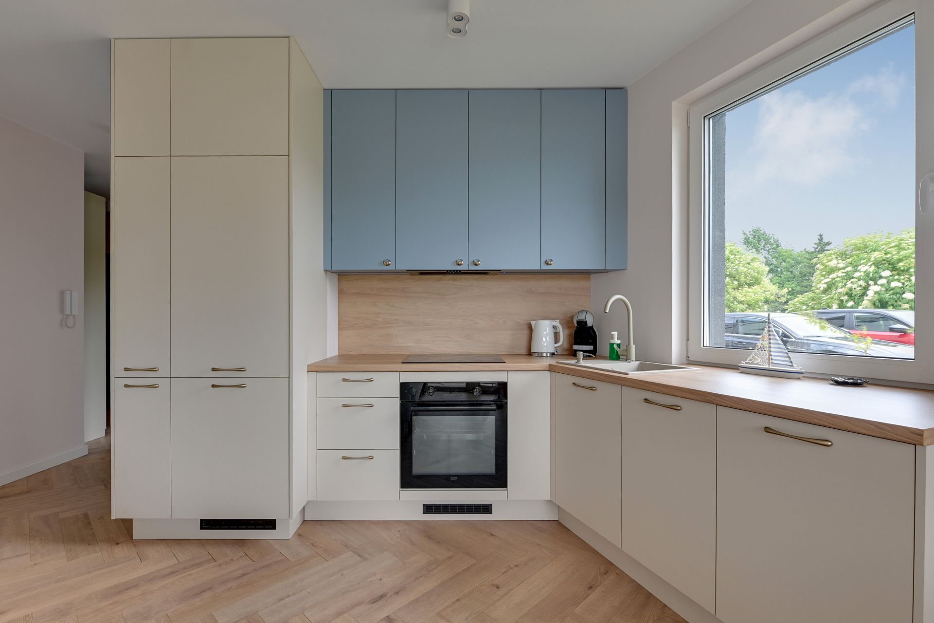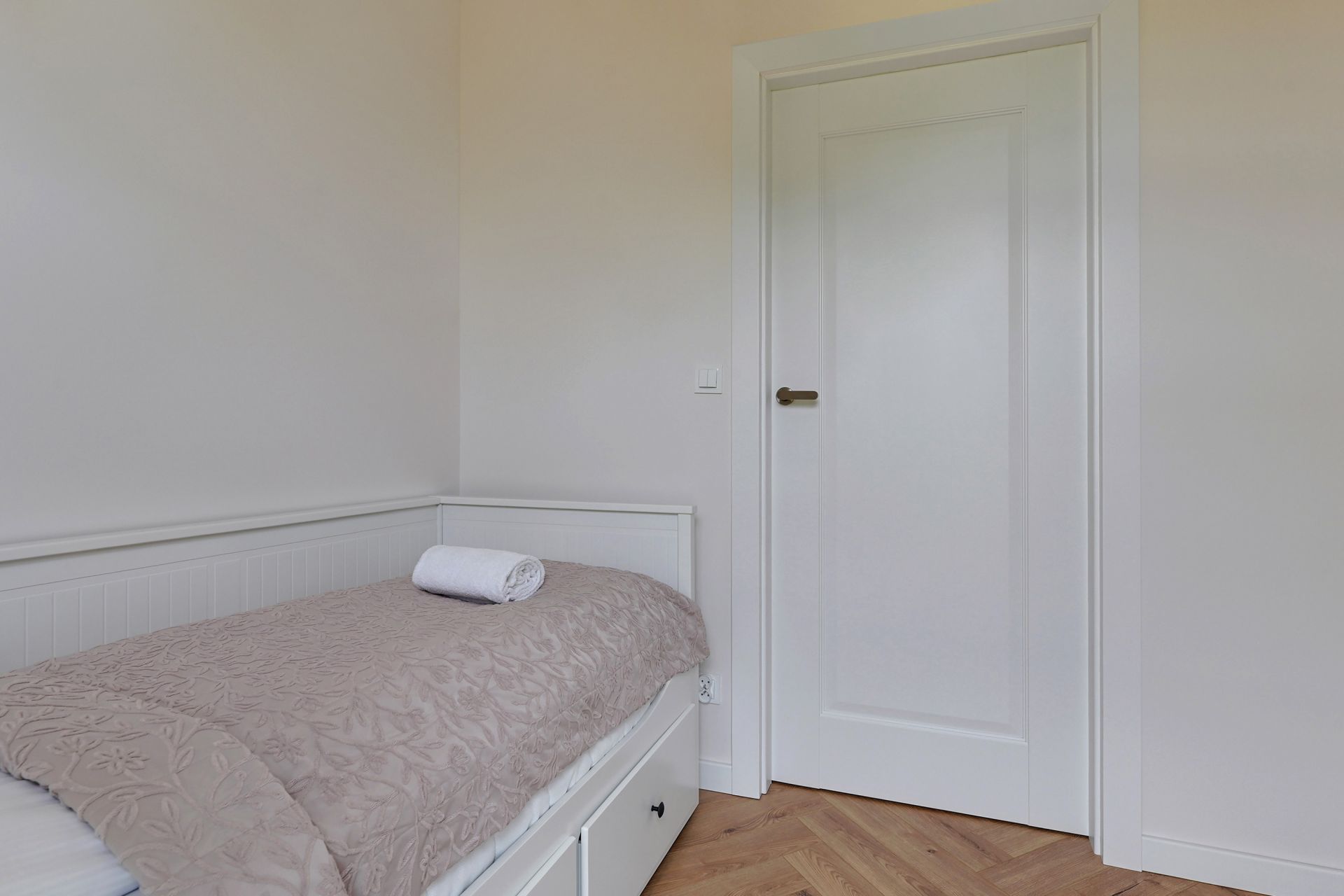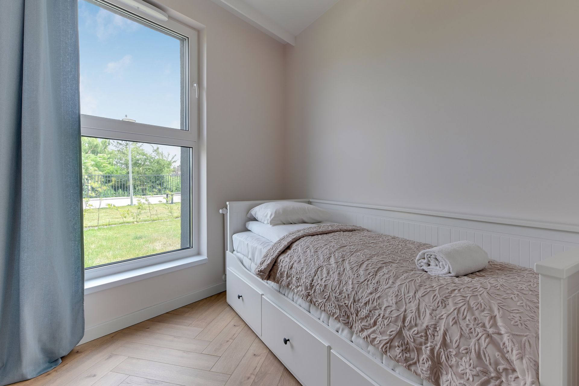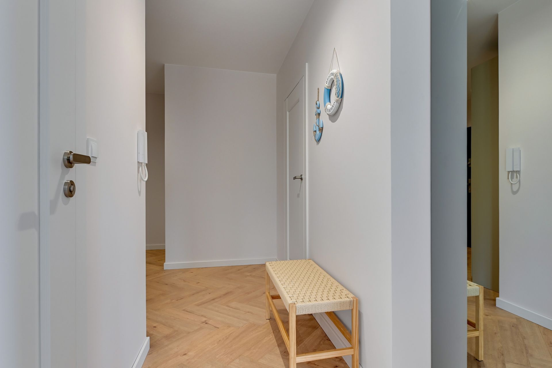 Wnętrze o powierzchni 47 m² zostało zaprojektowane z myślą o relaksie i funkcjonalności, urzekając nowoczesnym designem z dyskretnymi akcentami marynistycznymi. Apartament składa się z dwóch przytulnych sypialni oraz jasnego salonu z aneksem kuchennym. W pierwszej sypialni znajdziecie wygodne łóżko podwójne, natomiast druga sypialnia oferuje komfortowe łóżko rozkładane dla dwóch osób. Dodatkowo, w salonie znajduje się sofa, która zapewni wygodne miejsce do spania dla piątej osoby.