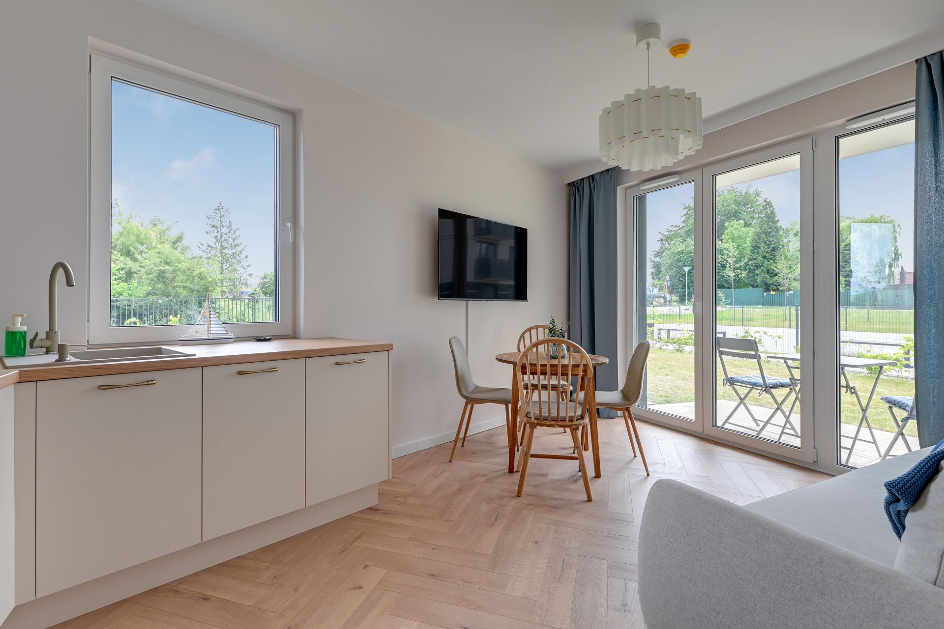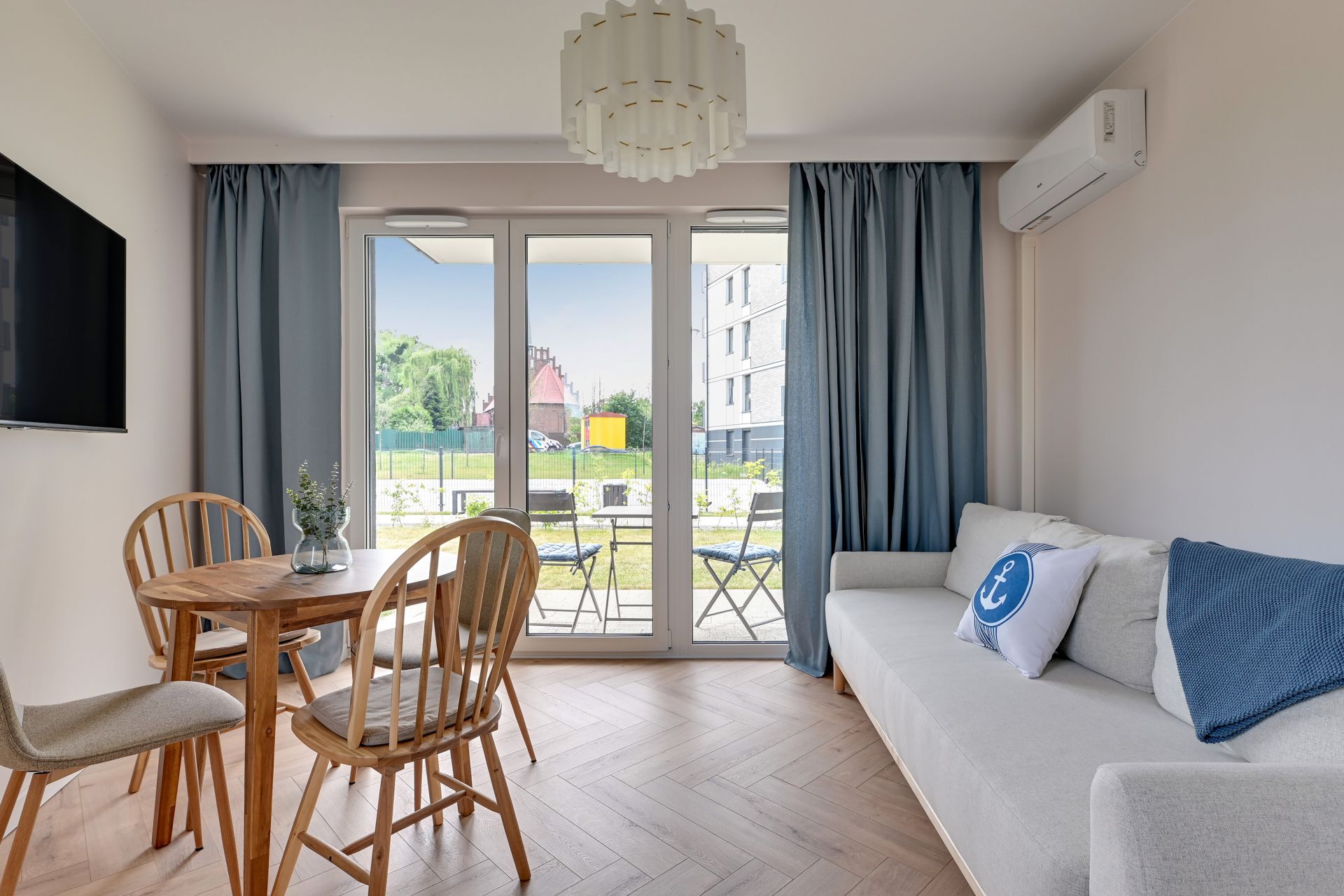 Niewątpliwym klejnotem apartamentu jest prywatny taras z przylegającym ogródkiem, wyposażony w meble ogrodowe. To idealne miejsce na poranną kawę, rodzinny posiłek na świeżym powietrzu czy wieczorny relaks z dala od zgiełku miasta.