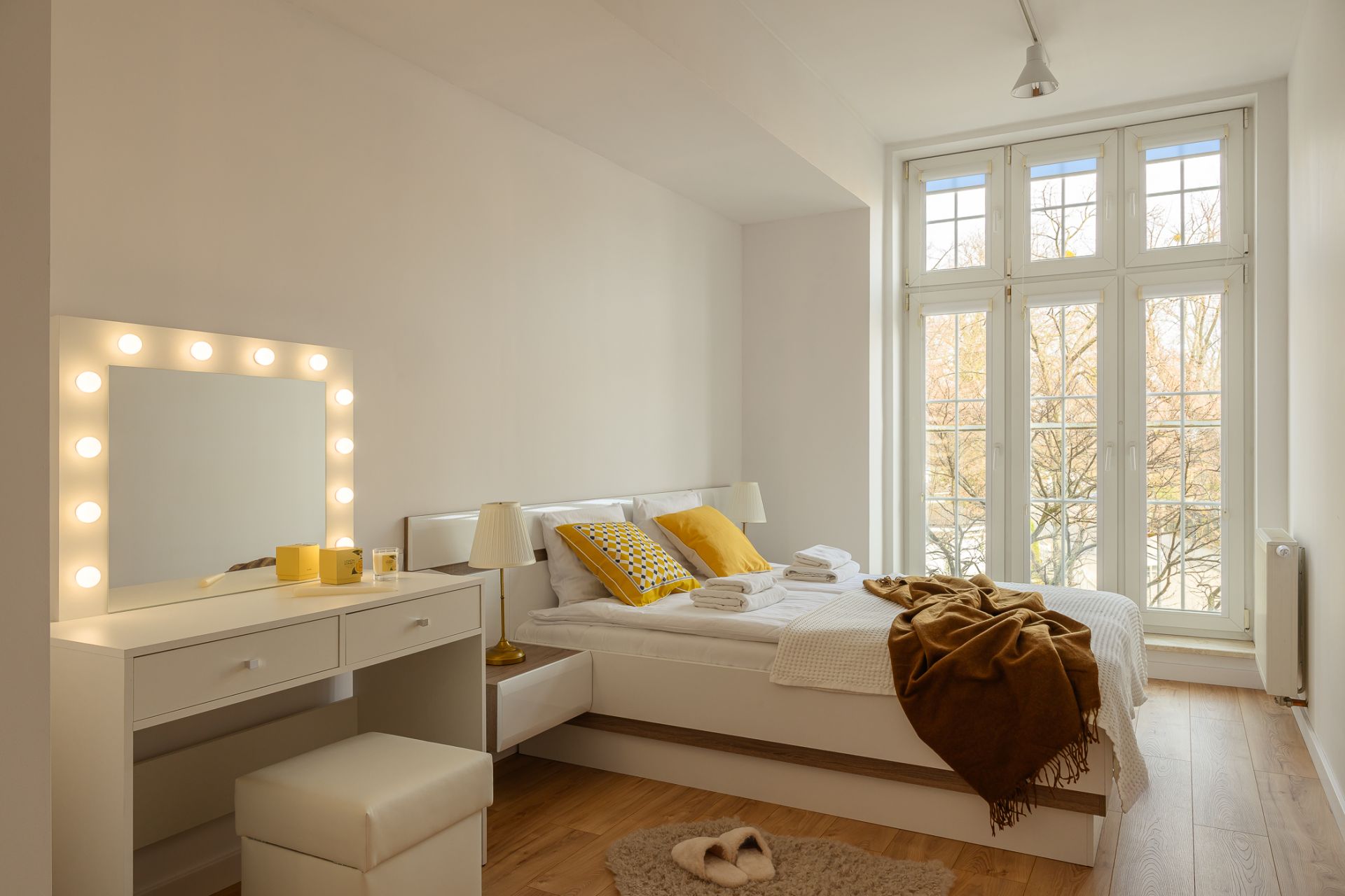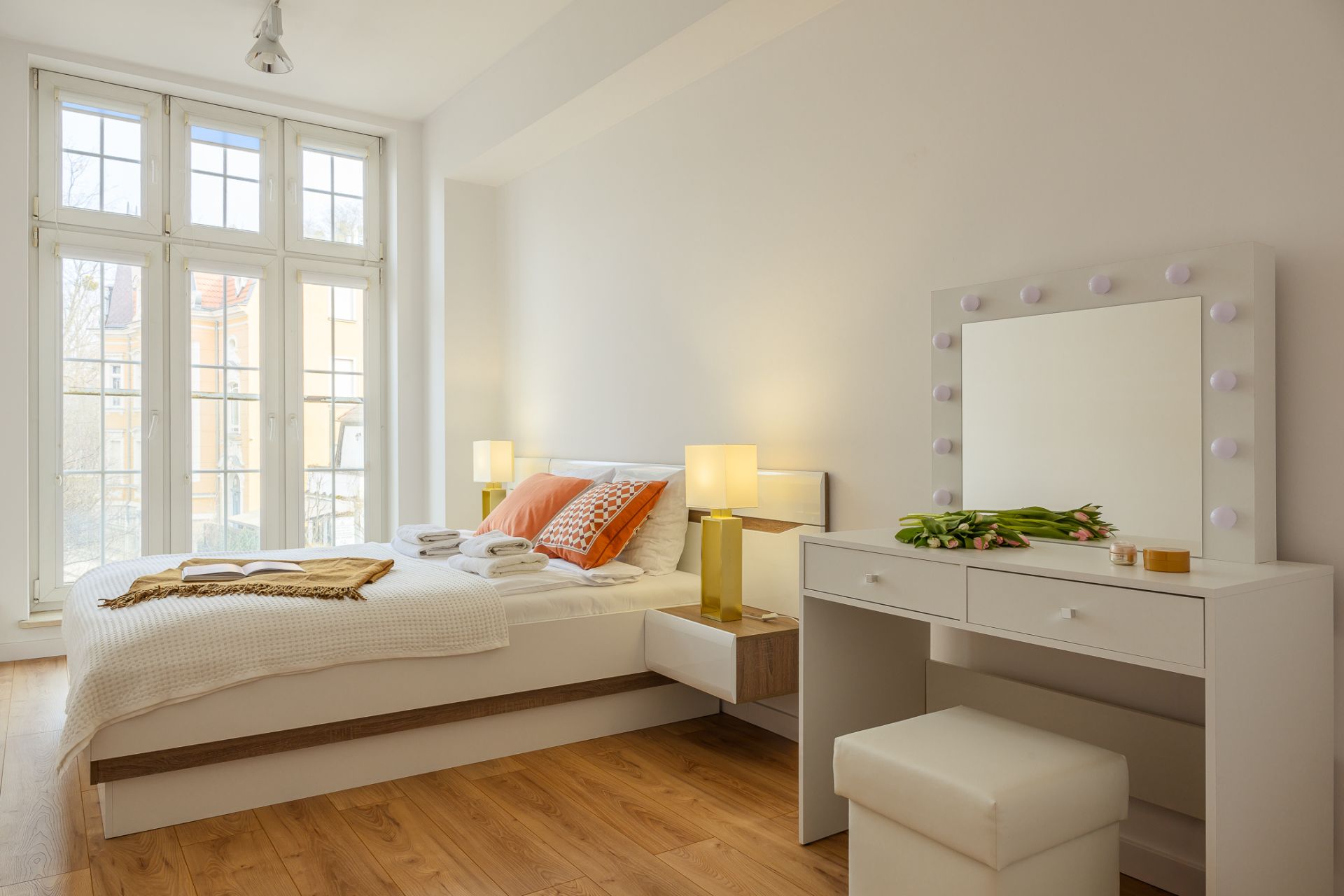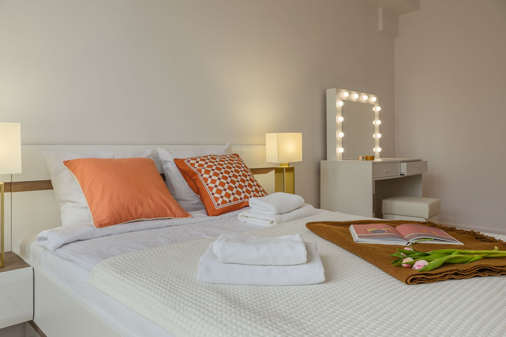 Wnętrze składa się z jasnego salonu z narożną sofą i dużym telewizorem oraz w pełni wyposażonego aneksu kuchennego z częścią jadalnianą. Do dyspozycji gości są dwie oddzielne sypialnie. Główna sypialnia oferuje duże łóżko małżeńskie oraz praktyczne stanowisko z podświetlanym lustrem. Druga sypialnia zapewnia równie komfortowe warunki do wypoczynku.