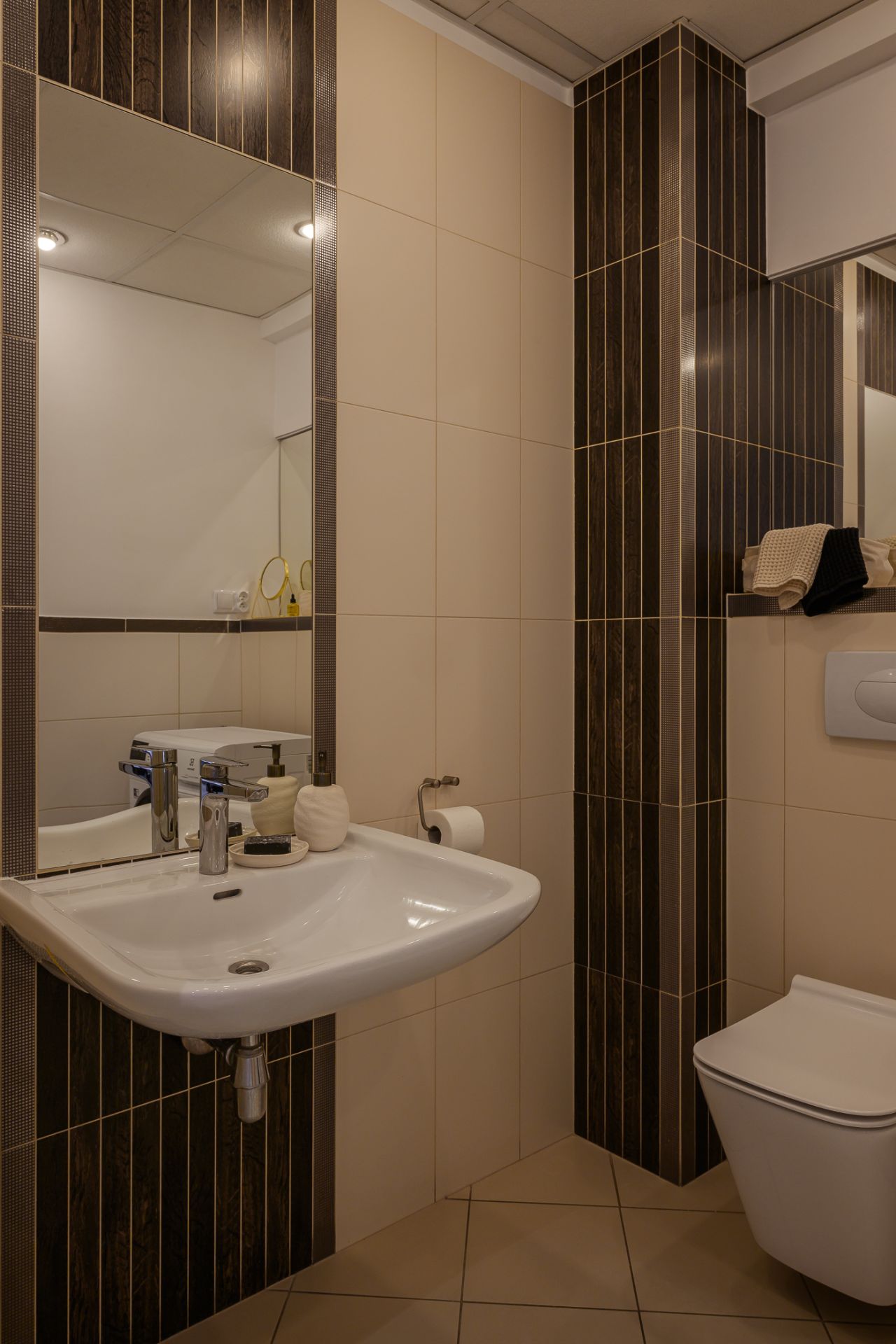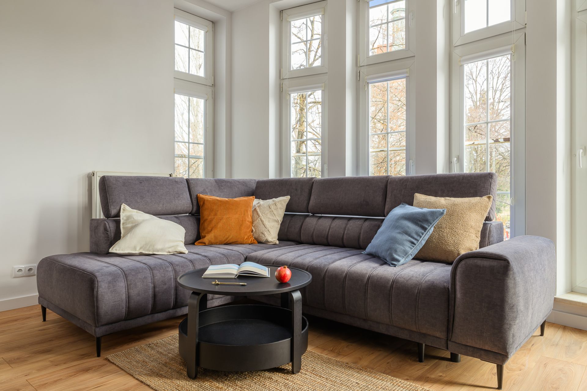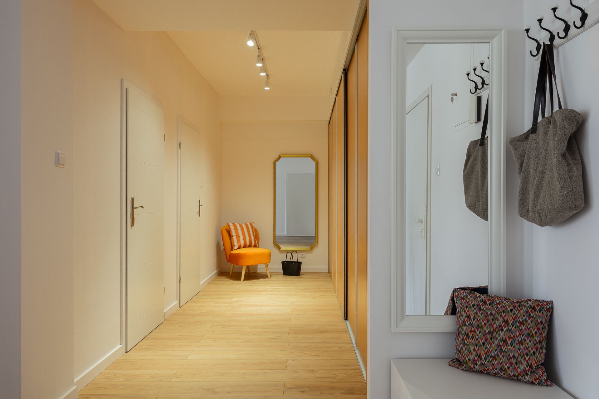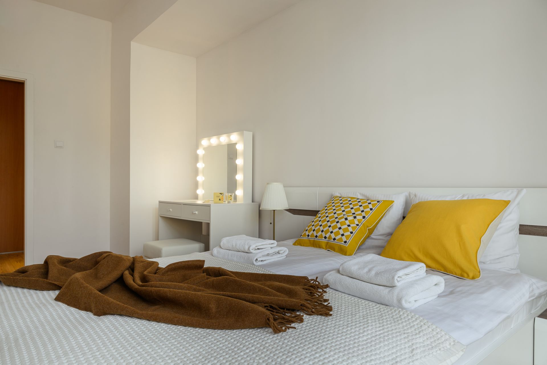 Wnętrze składa się z jasnego salonu z narożną sofą i dużym telewizorem oraz w pełni wyposażonego aneksu kuchennego z częścią jadalnianą. Do dyspozycji gości są dwie oddzielne sypialnie. Główna sypialnia oferuje duże łóżko małżeńskie oraz praktyczne stanowisko z podświetlanym lustrem. Druga sypialnia zapewnia równie komfortowe warunki do wypoczynku.