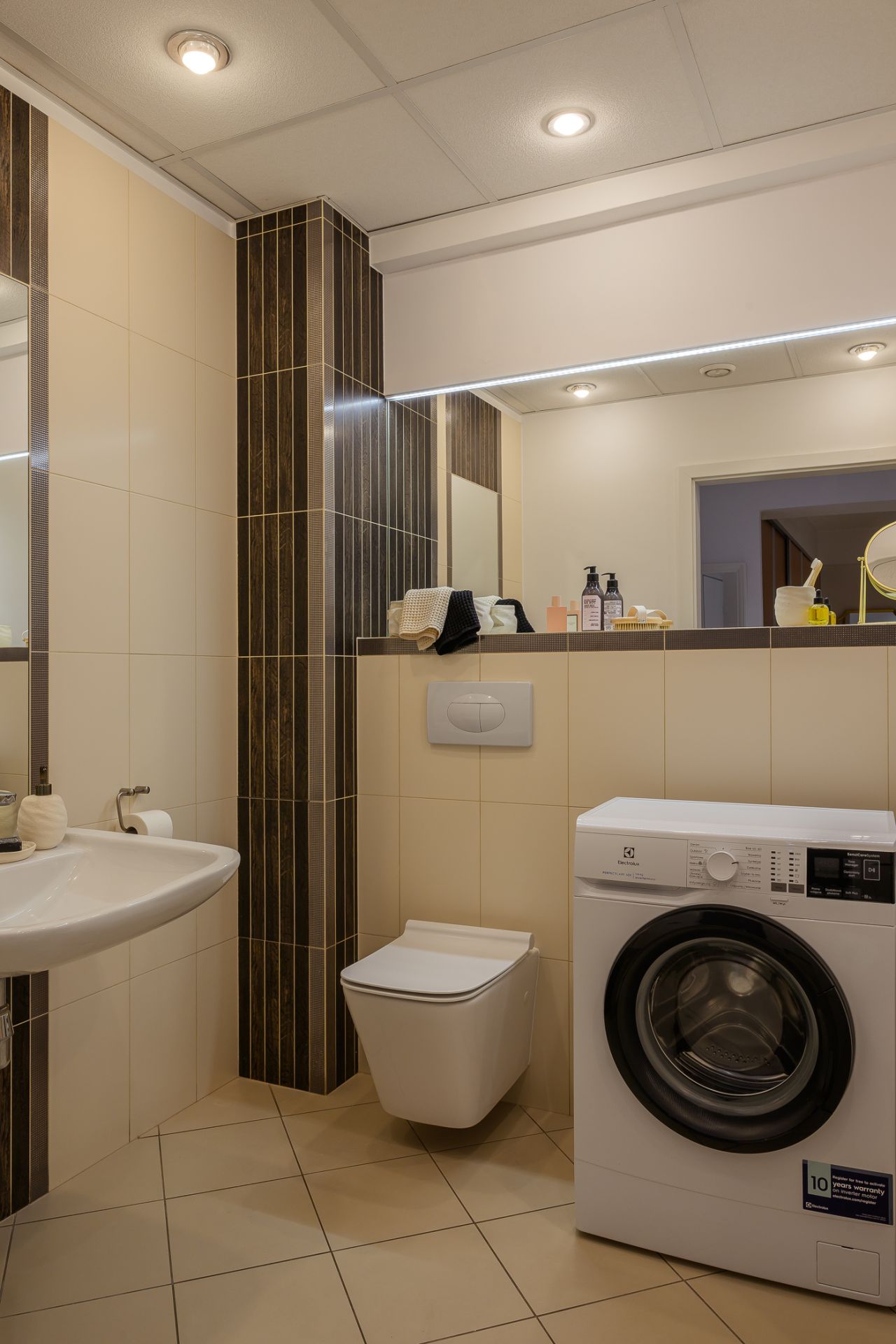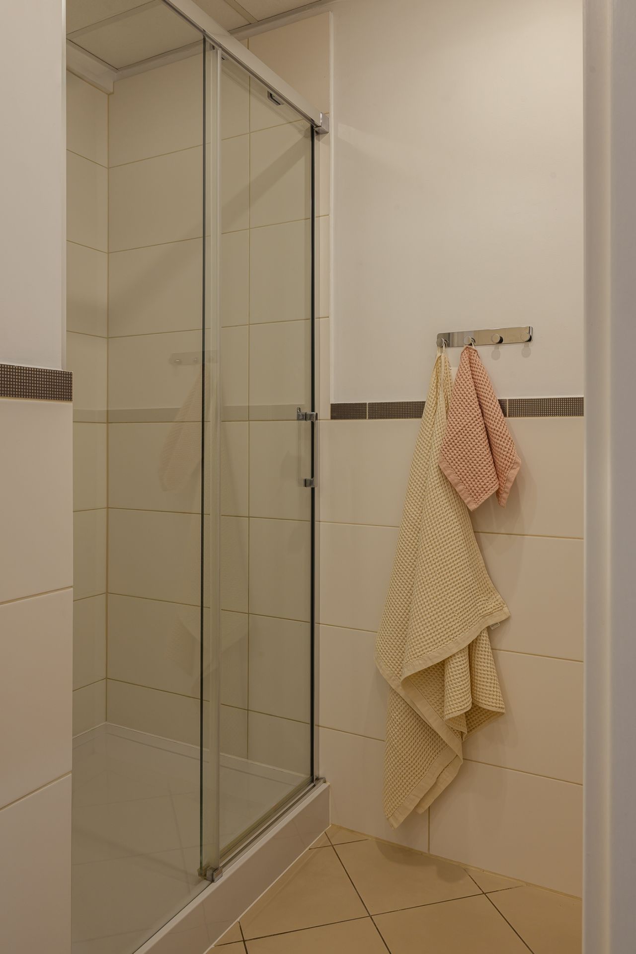Łazienka wyposażona jest w przestronną kabinę prysznicową oraz pralkę. Dodatkowym atutem mieszkania jest funkcjonalny przedpokój z dużą szafą. Apartament znajduje się w budynku z windą, co zapewnia wygodny dostęp do lokalu.