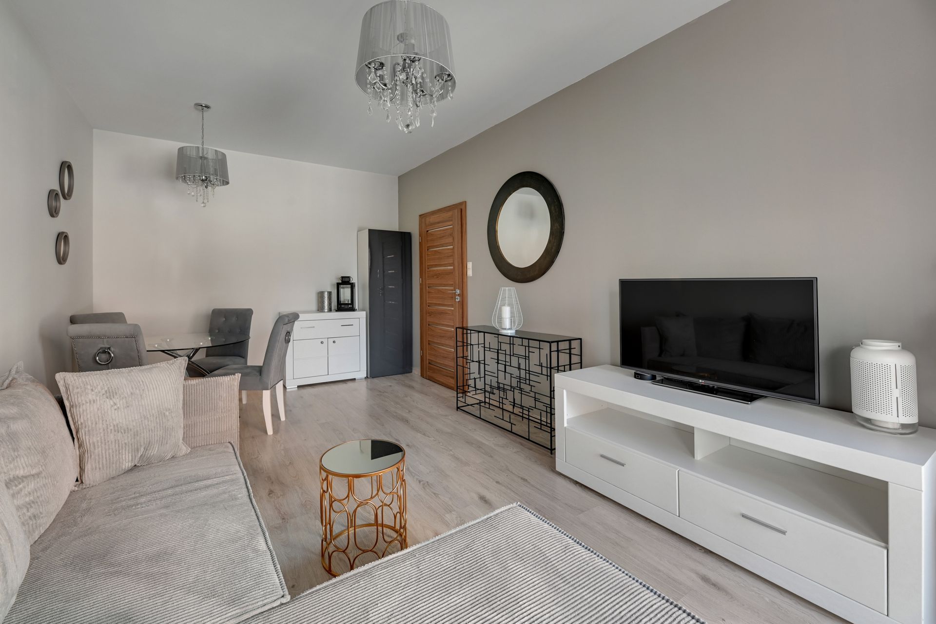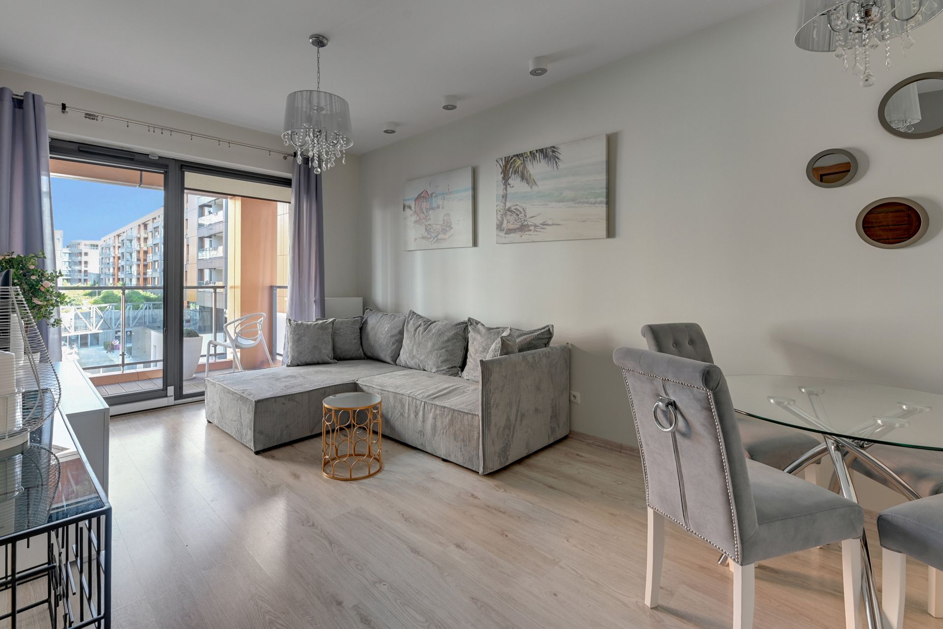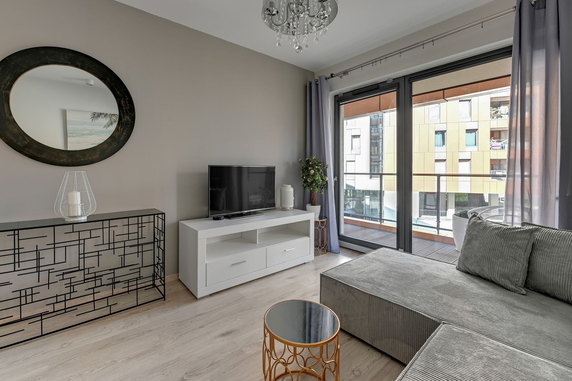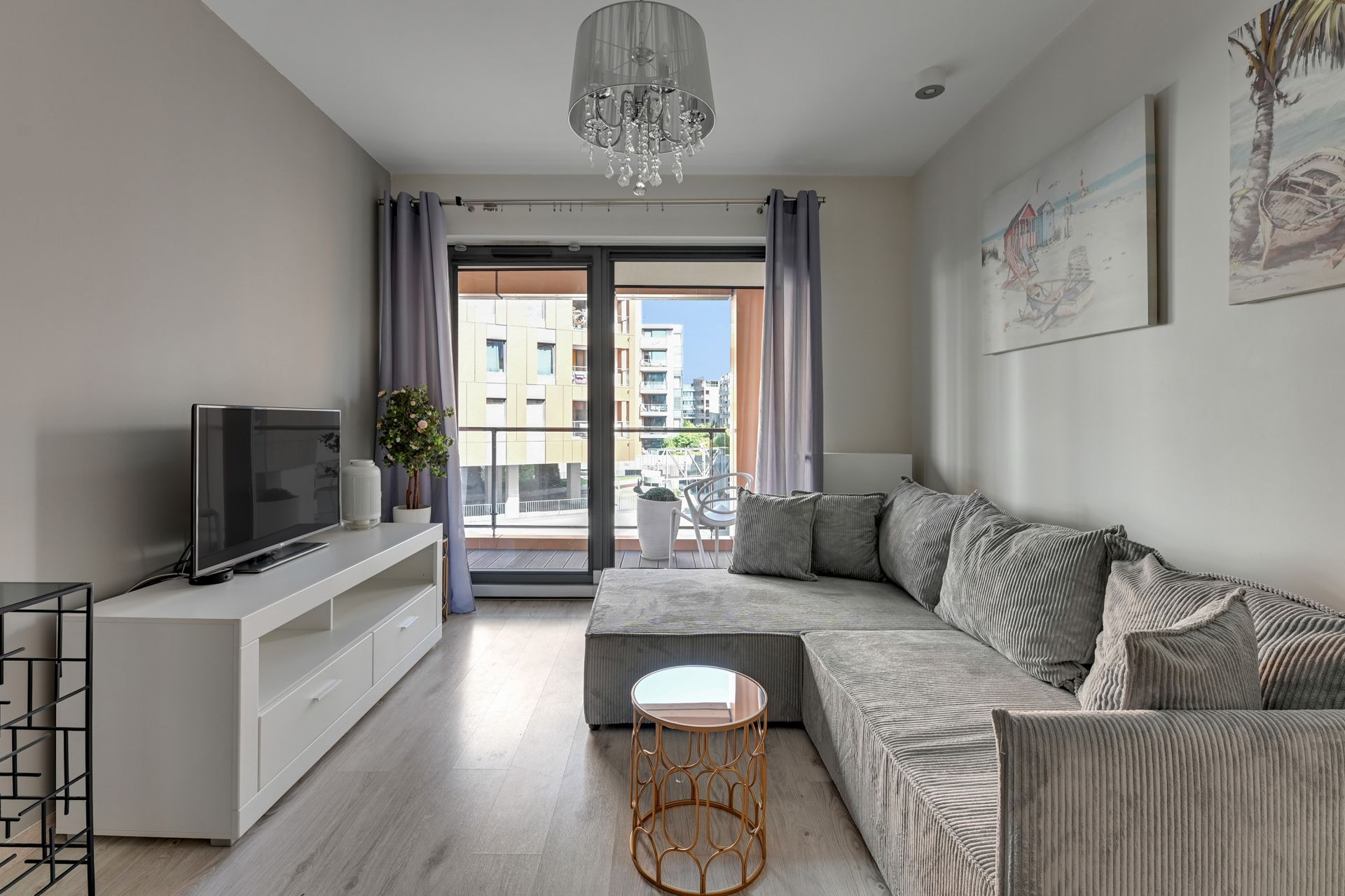 Wnętrze apartamentu zostało urządzone w nowoczesnym, minimalistycznym stylu, z dbałością o każdy detal. Dominują jasne, stonowane kolory, które nadają przestrzeni poczucie świeżości i spokoju. Salon wyposażony jest w dużą, wygodną sofę, którą można łatwo przekształcić w dodatkowe miejsce do spania dla dwóch osób. W pełni wyposażona kuchnia z mikrofalówką i płytą grzewczą pozwala na swobodne przygotowywanie posiłków.