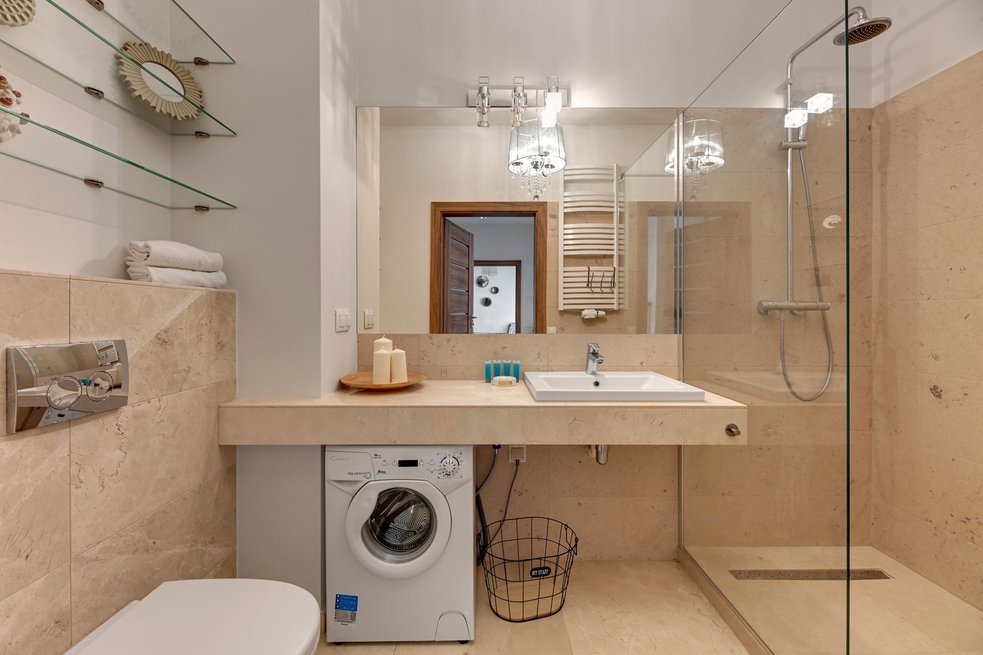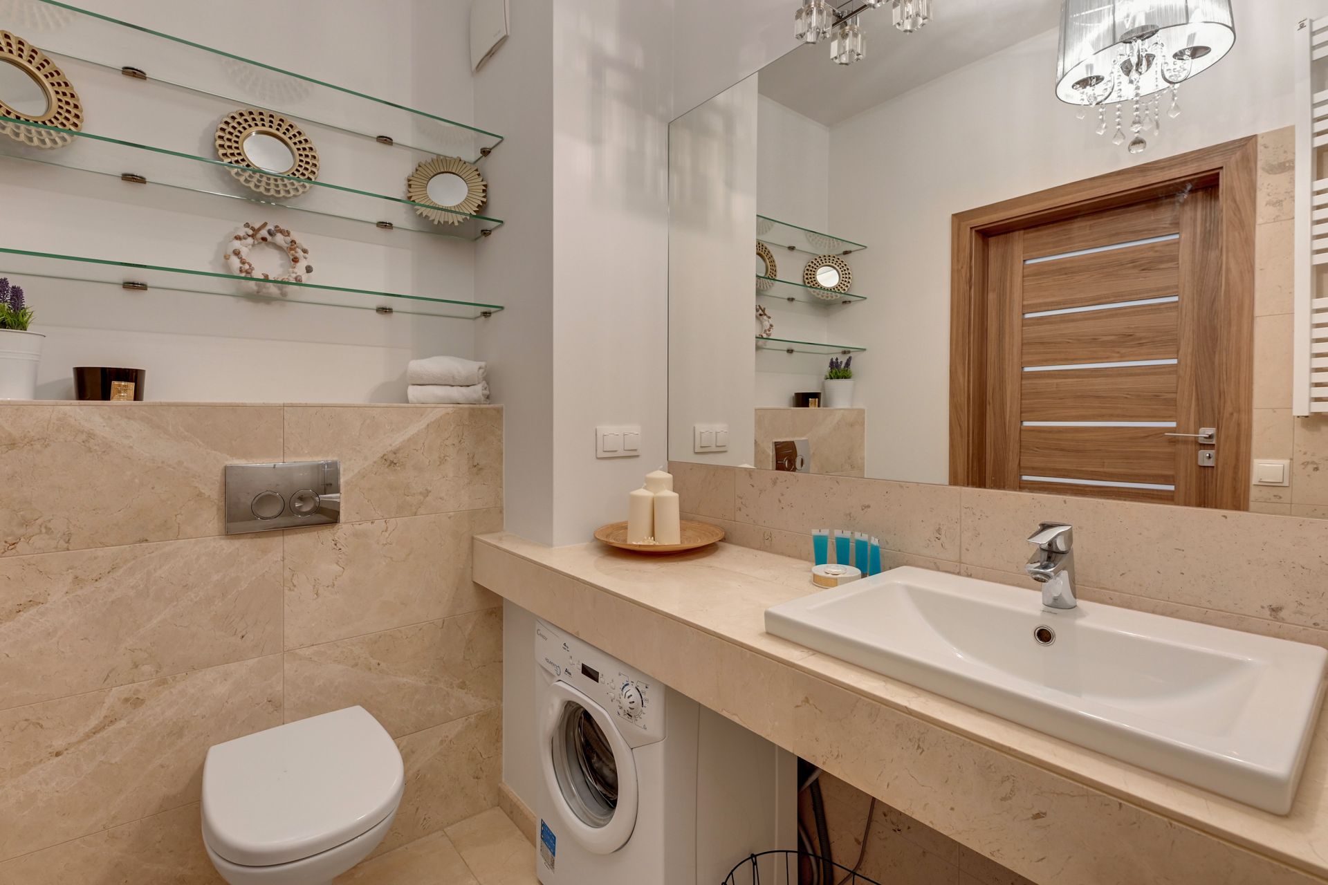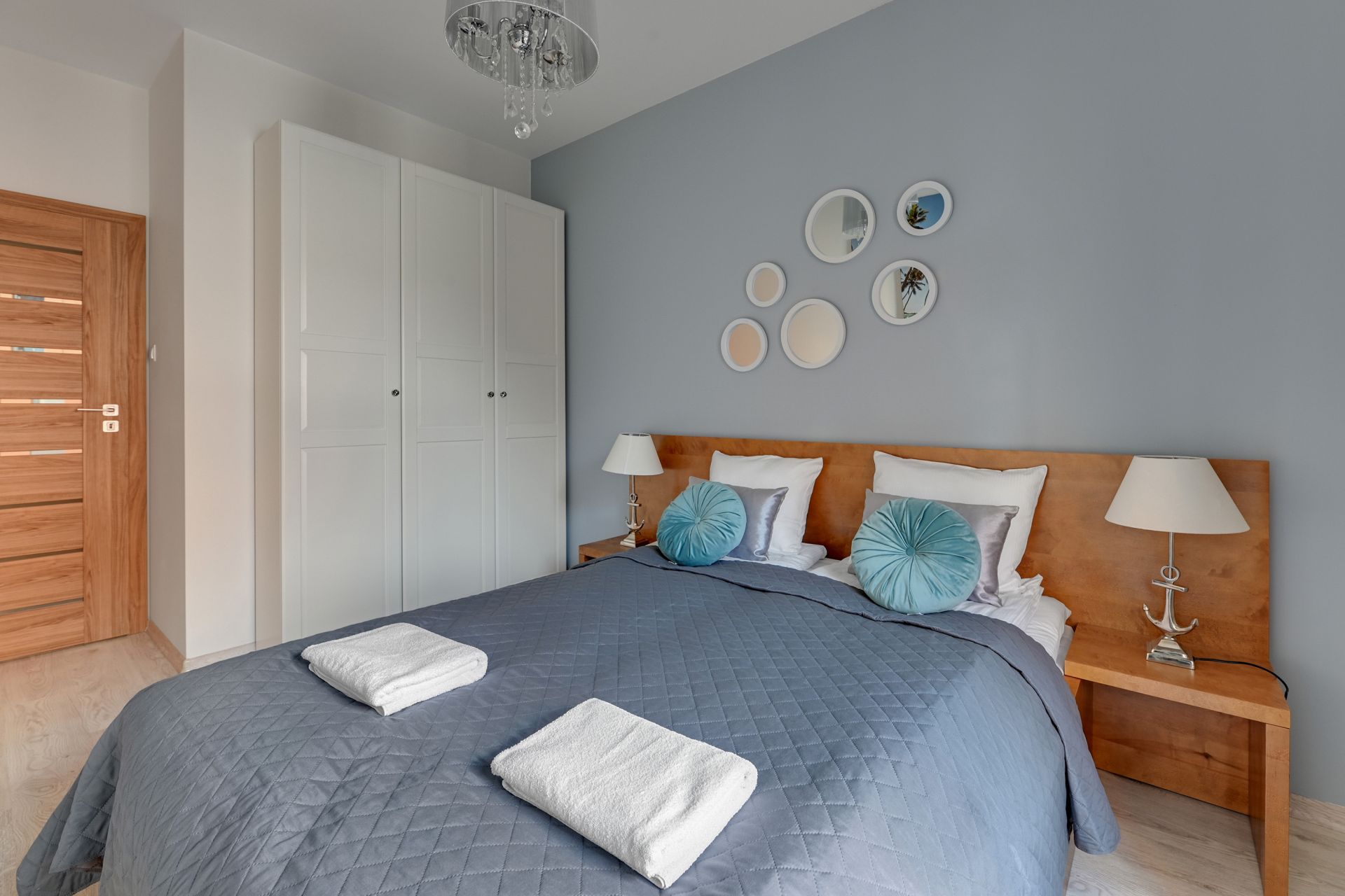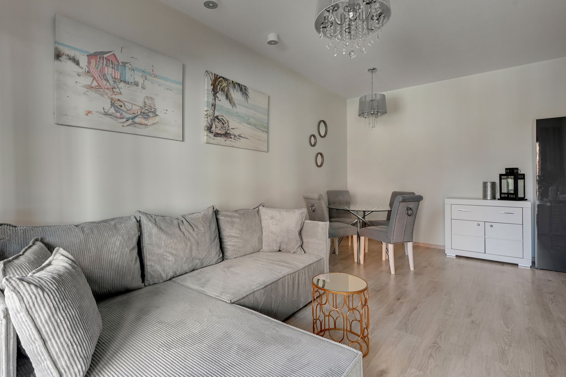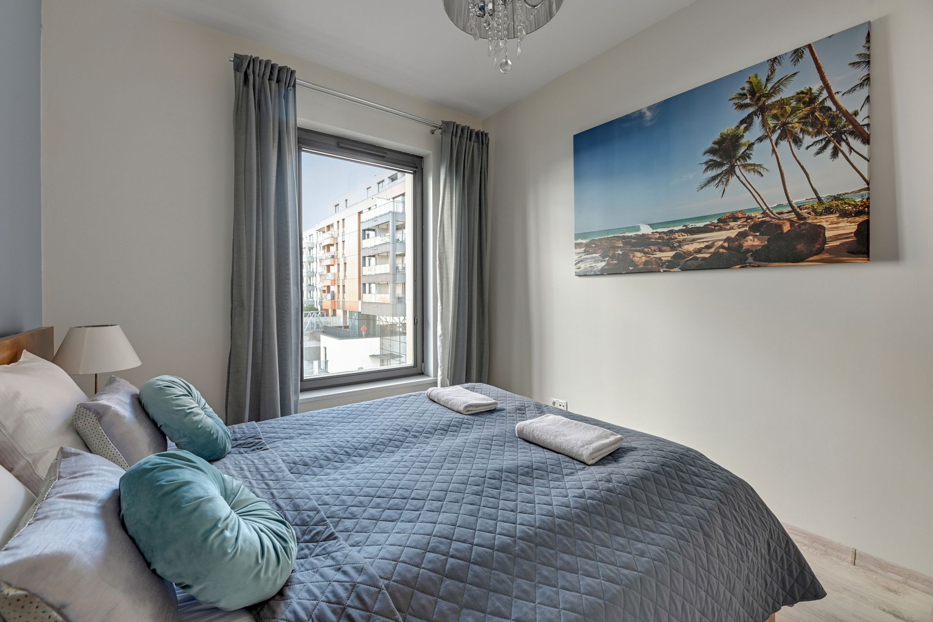 Wnętrze apartamentu zostało urządzone w nowoczesnym, minimalistycznym stylu, z dbałością o każdy detal. Dominują jasne, stonowane kolory, które nadają przestrzeni poczucie świeżości i spokoju. Salon wyposażony jest w dużą, wygodną sofę, którą można łatwo przekształcić w dodatkowe miejsce do spania dla dwóch osób. W pełni wyposażona kuchnia z mikrofalówką i płytą grzewczą pozwala na swobodne przygotowywanie posiłków.