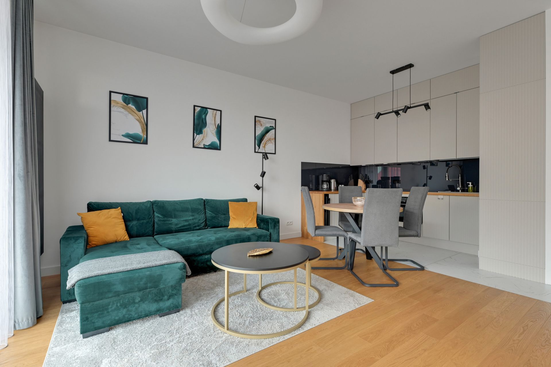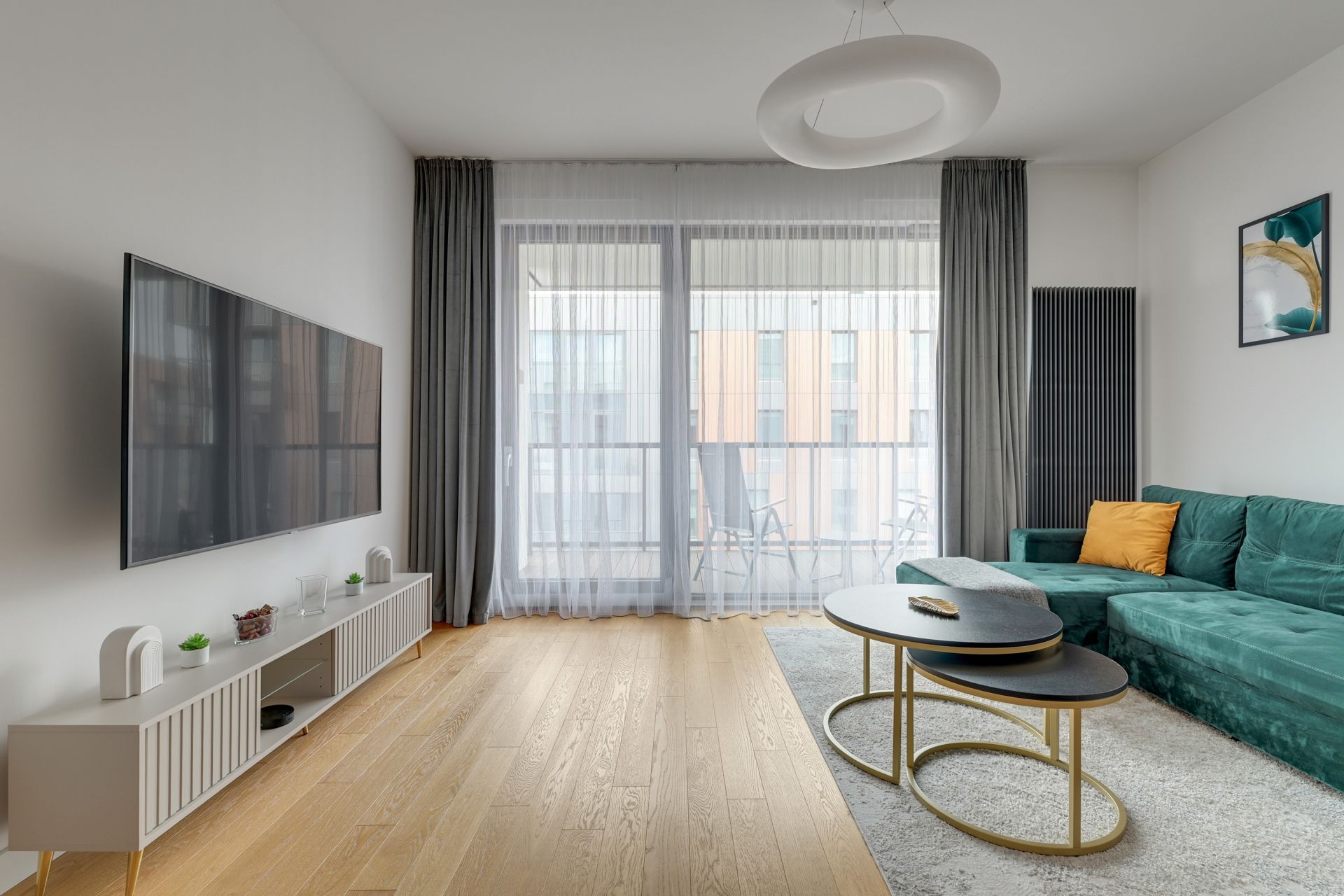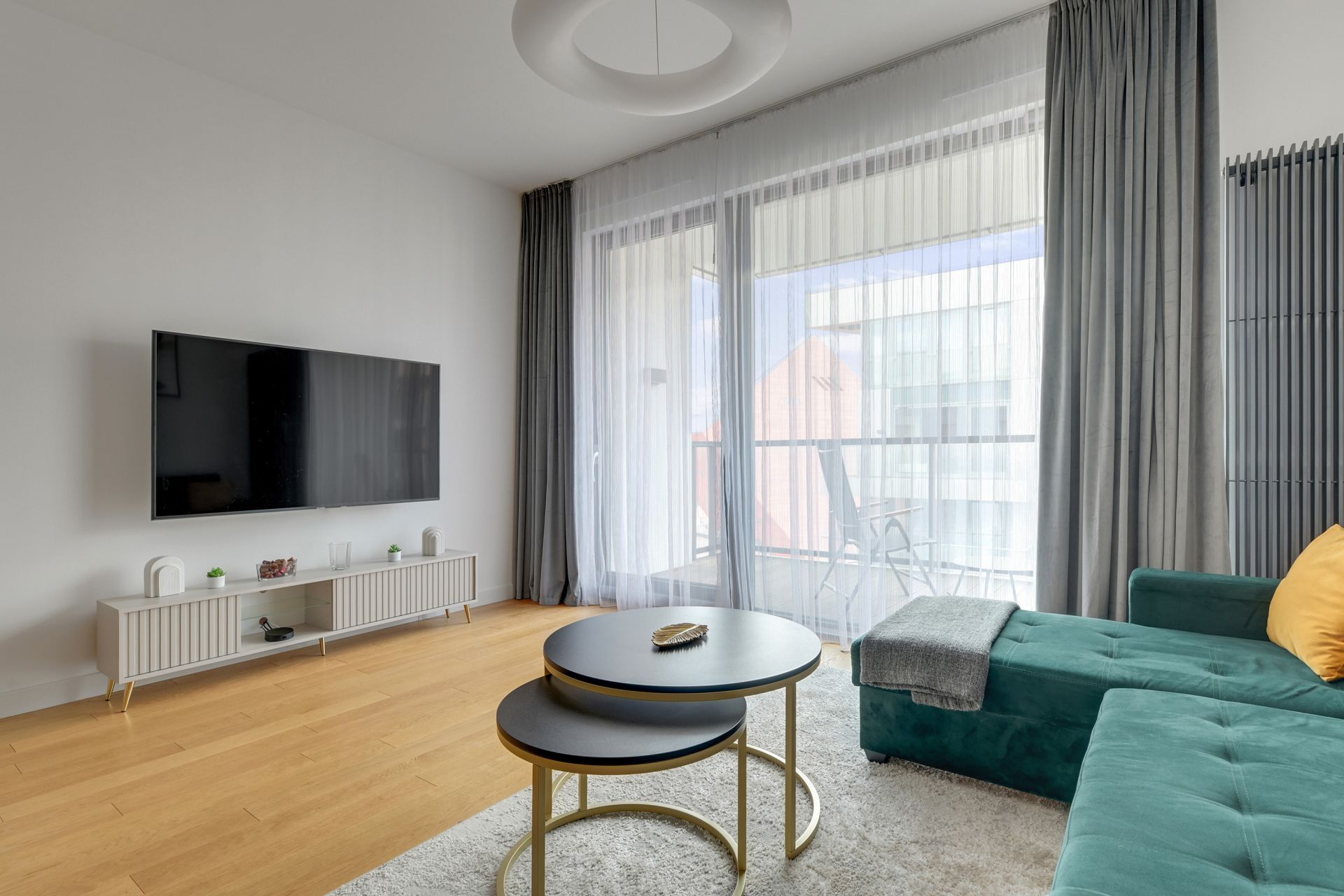 Salon z widokiem: Jasna, otwarta przestrzeń ze szmaragdową sofą i bezpośrednim wyjściem na balkon. To stąd mogą Państwo podziwiać ikoniczną architekturę Muzeum II Wojny Światowej.
