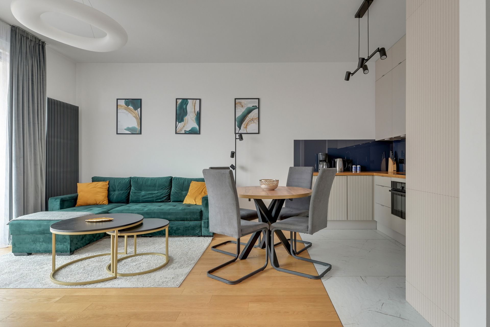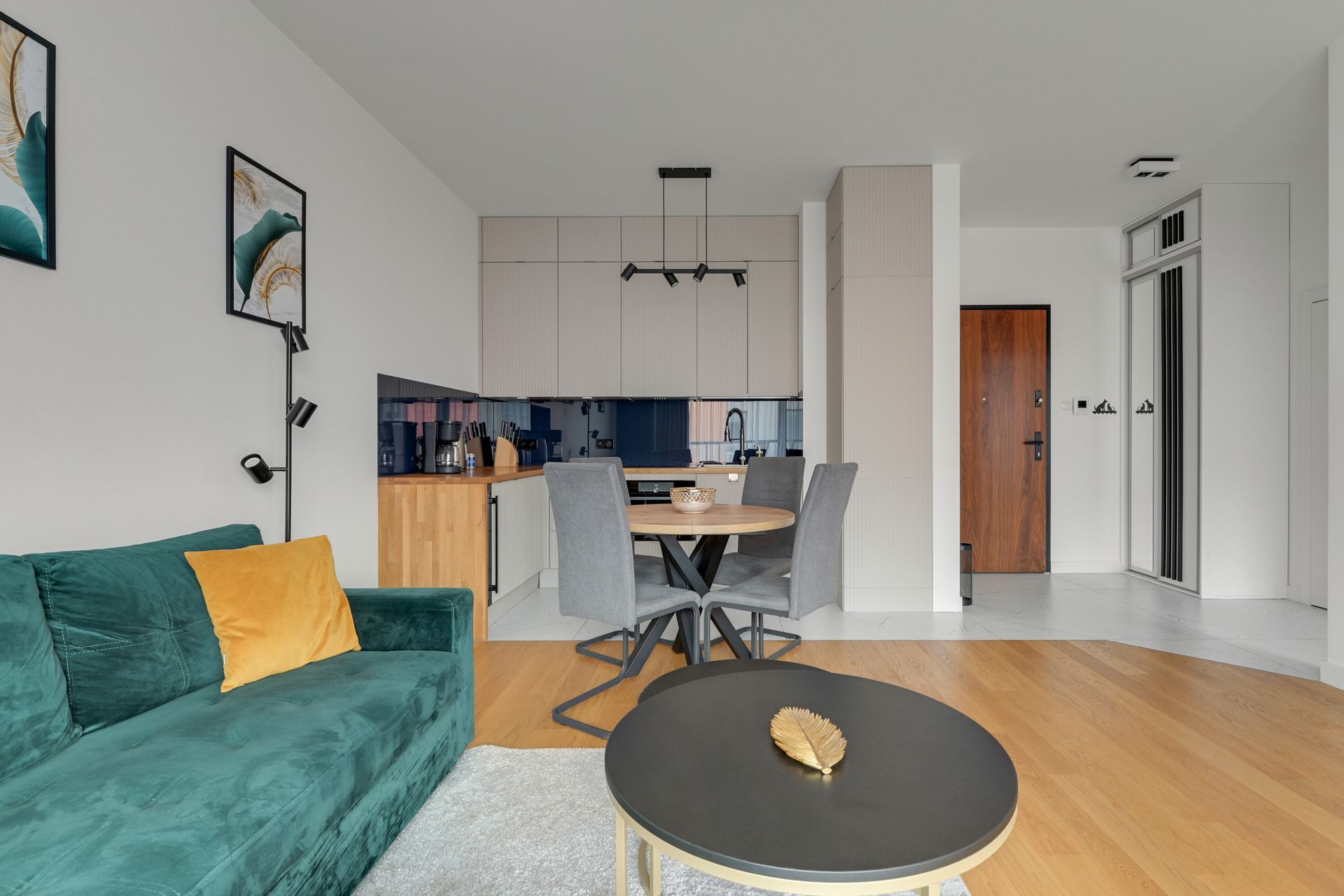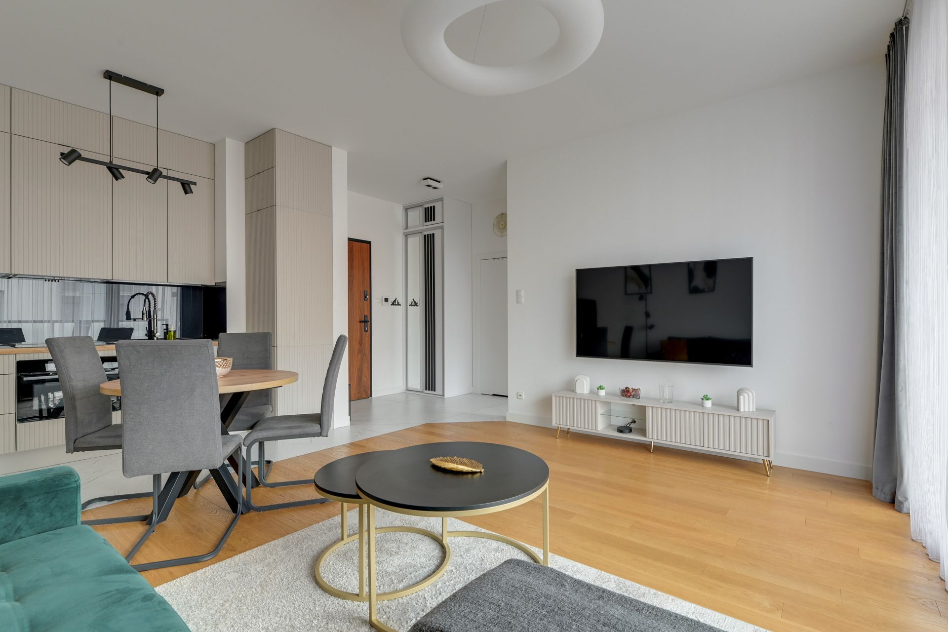 Salon z widokiem: Jasna, otwarta przestrzeń ze szmaragdową sofą i bezpośrednim wyjściem na balkon. To stąd mogą Państwo podziwiać ikoniczną architekturę Muzeum II Wojny Światowej.