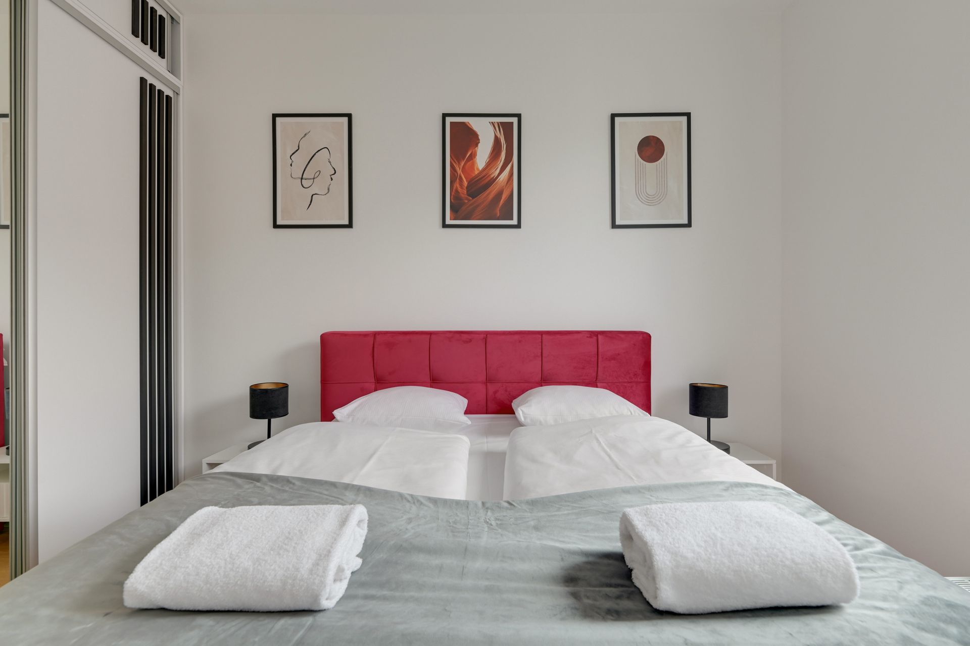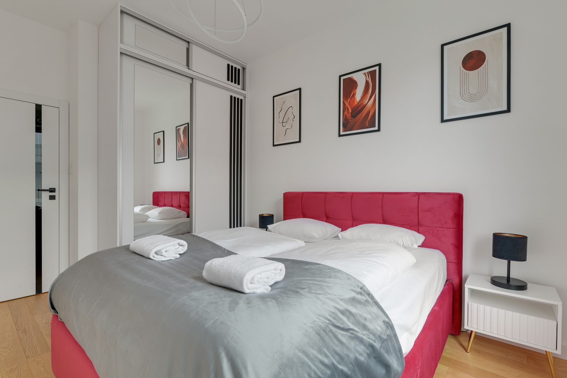 Rubinowa sypialnia: Komfortowe, duże łóżko z welurowym zagłówkiem w kolorze głębokiej czerwieni oraz pojemna lustrzana szafa.