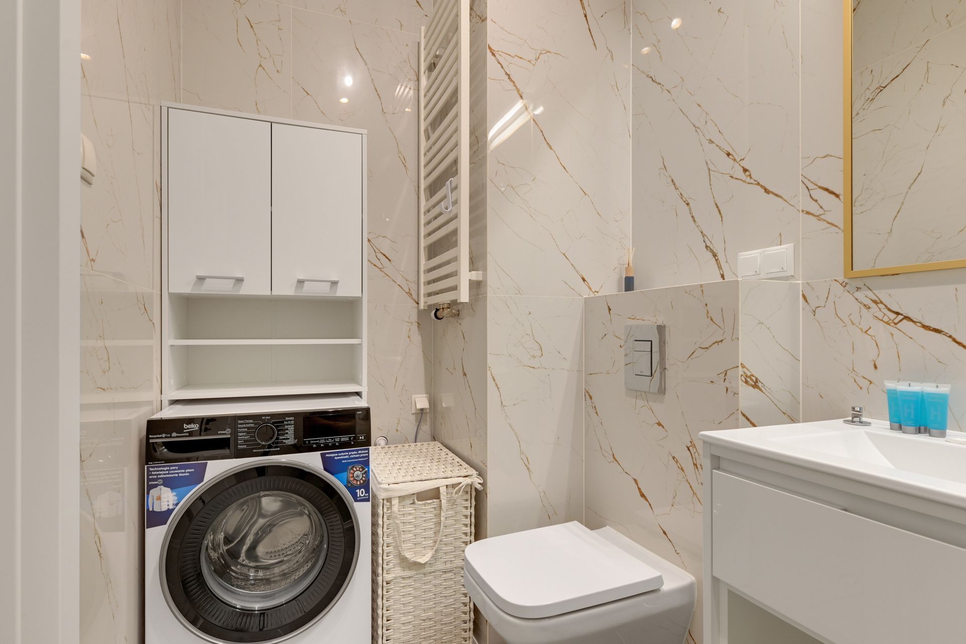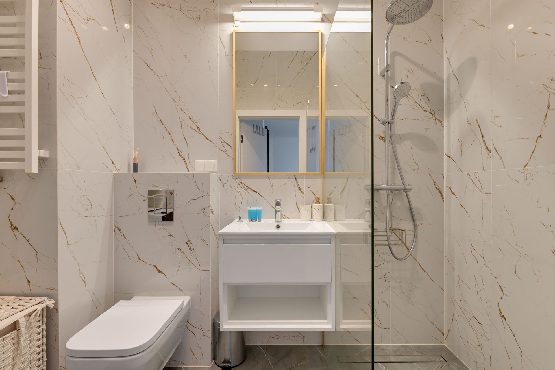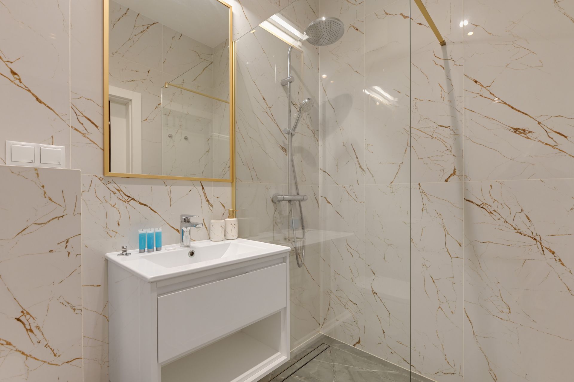 Złota łazienka: Pokój kąpielowy wykończony marmurowymi płytami ze złotym użyleniem i ekskluzywną, złotą armaturą.