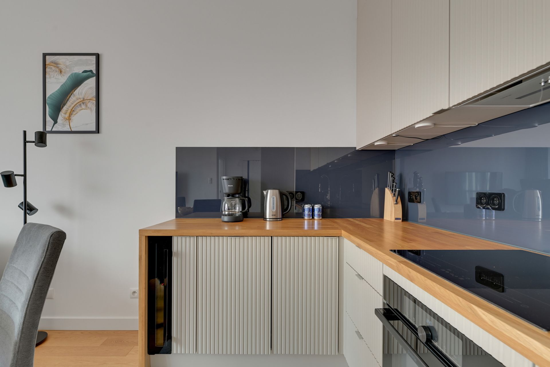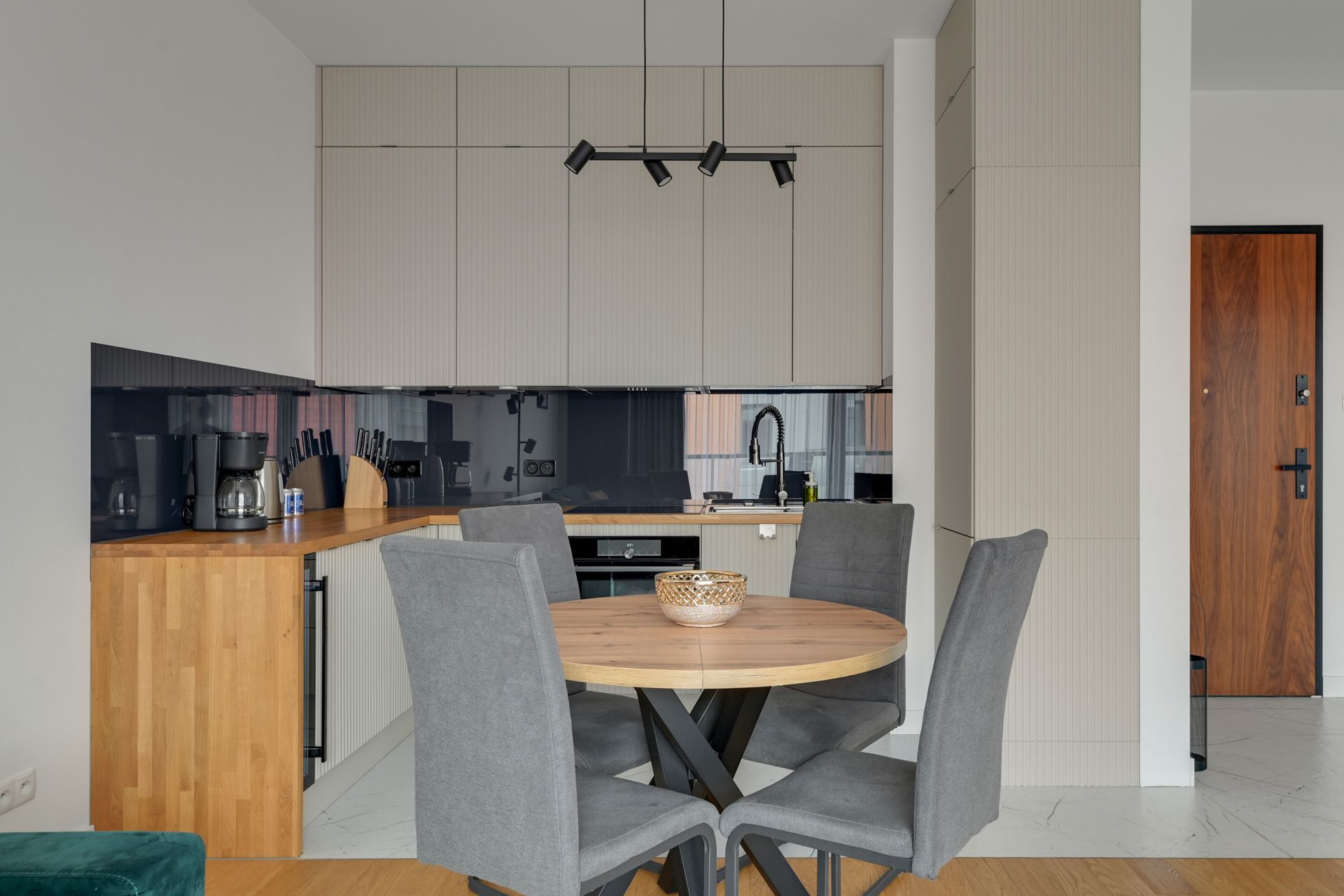Kuchnia i jadalnia: Nowoczesny aneks w stonowanych barwach z granatowym akcentem, w pełni wyposażony (zmywarka, ekspres do kawy). Okrągły stół sprzyja wspólnym posiłkom.