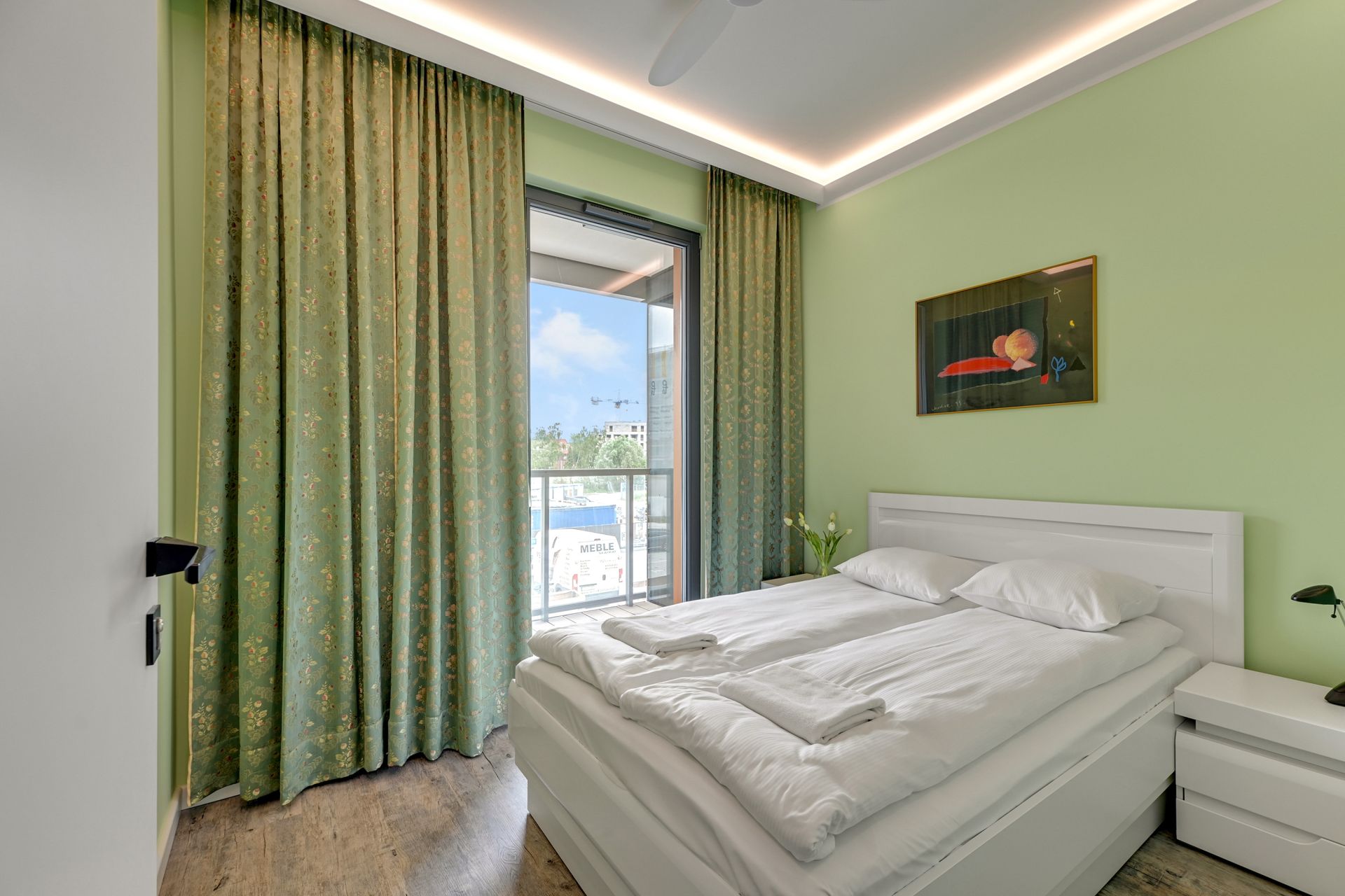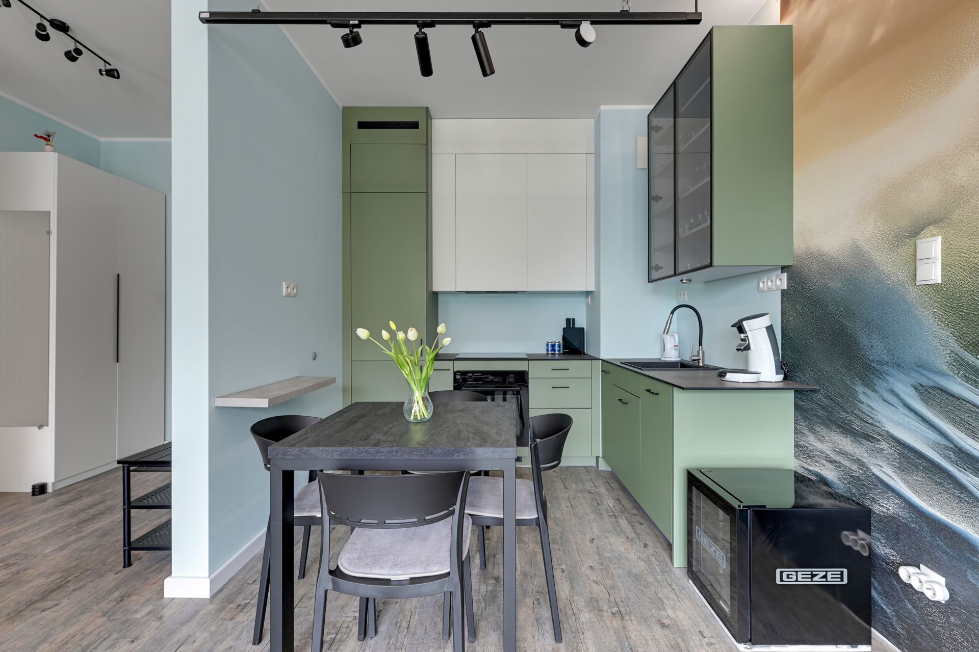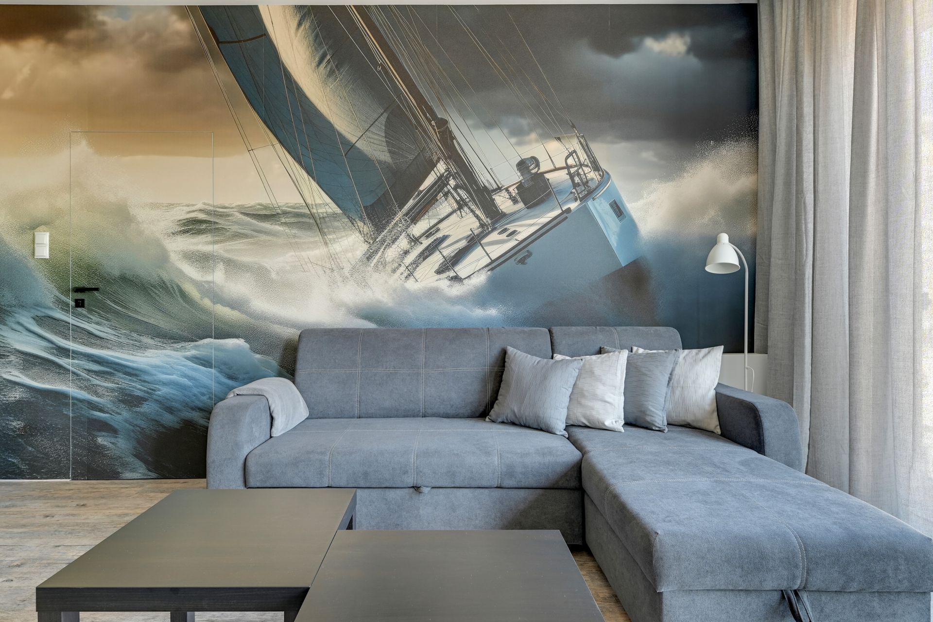 Wnętrze o powierzchni 47 m² zostało zaprojektowane z myślą o Waszym komforcie i relaksie. Apartament składa się z jednej przytulnej sypialni oraz słonecznego salonu połączonego z aneksem kuchennym. W salonie czeka na Was wygodna rozkładana sofa, idealna do wieczornego odpoczynku, a także dla dodatkowych gości – mieszkanie komfortowo pomieści do 4 osób. Wzrok od razu przyciąga imponująca fototapeta z motywem żaglówki, która nadaje wnętrzu wyjątkowy, morski charakter i inspiruje do odkrywania Gdańska.