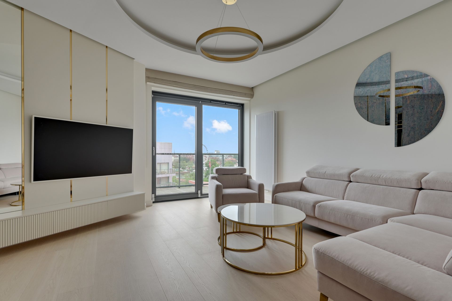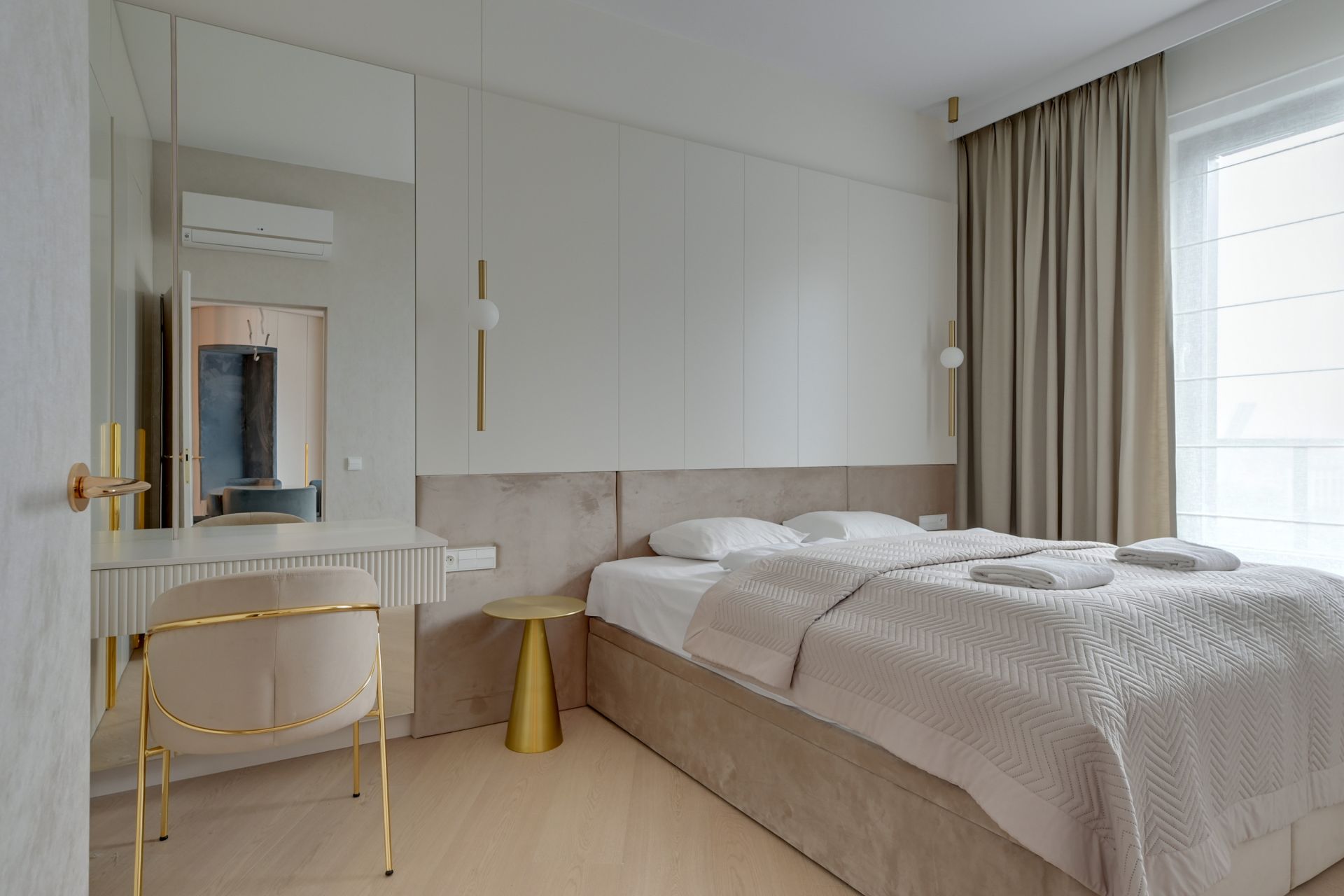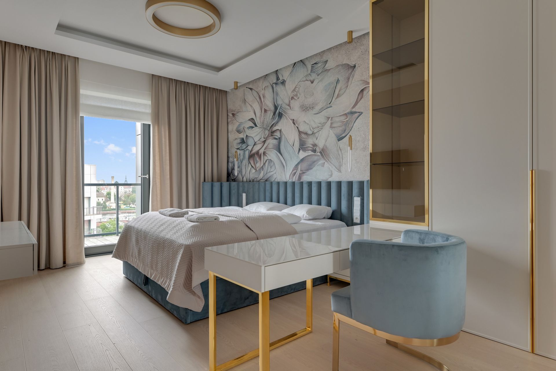 Design i Funkcjonalność na Najwyższym Poziomie: Każdy element tego apartamentu został starannie dobrany, by stworzyć harmonijną i wyrafinowaną przestrzeń. Połączenie jasnych barw z detalami ze szlachetnego złota i akcentami w odcieniach błękitu nadaje wnętrzom nowoczesnego, a zarazem ponadczasowego charakteru.