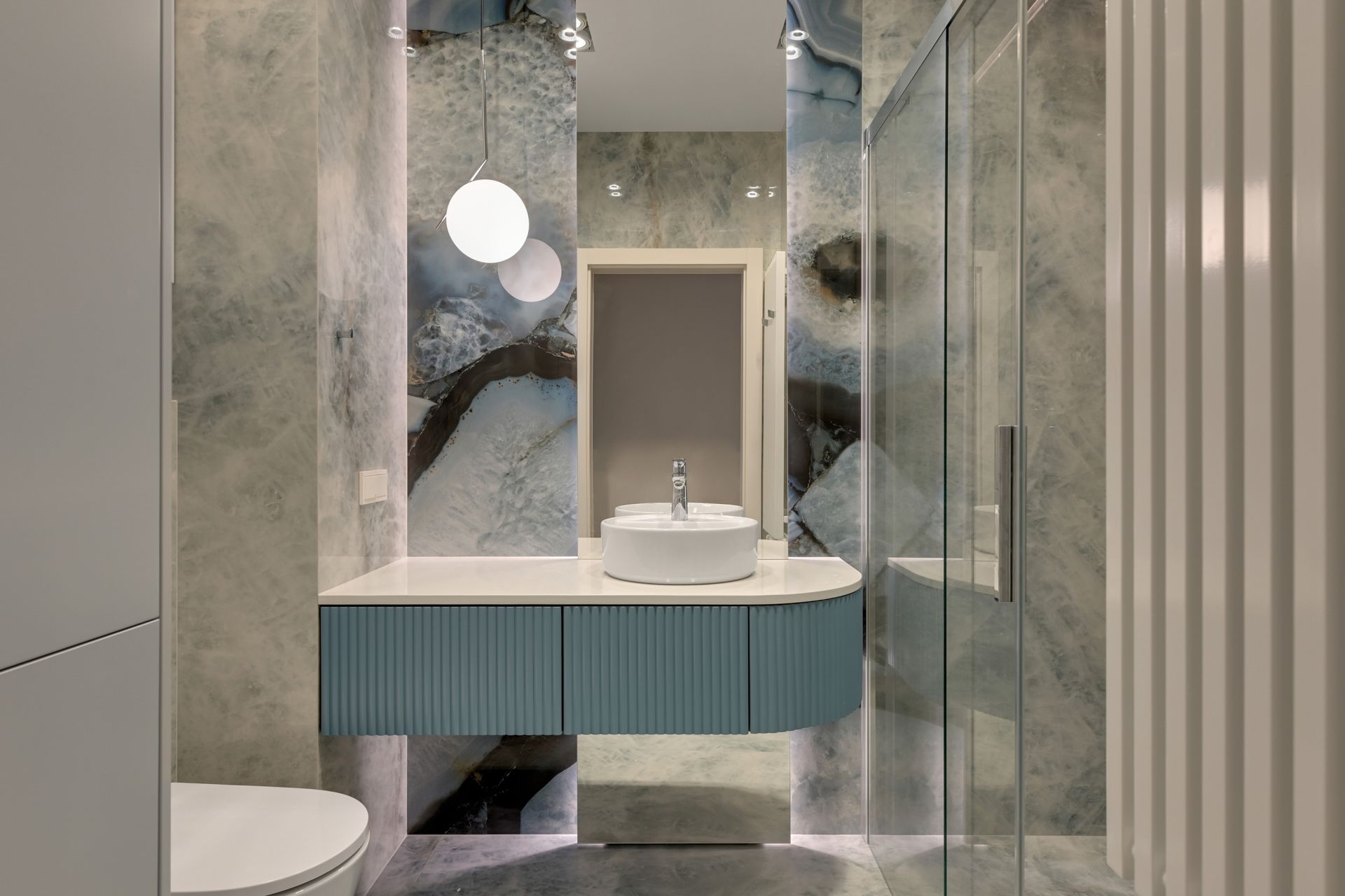 Apartament posiada główną łazienkę z nowoczesną kabiną prysznicową oraz oddzielną, komfortową toaletę. Oba pomieszczenia zachwycają wykończeniem z wysokiej jakości materiałów, w tym szlachetnych, wzorzystych kamieni, a złota armatura dodaje im blasku i ekskluzywności.
