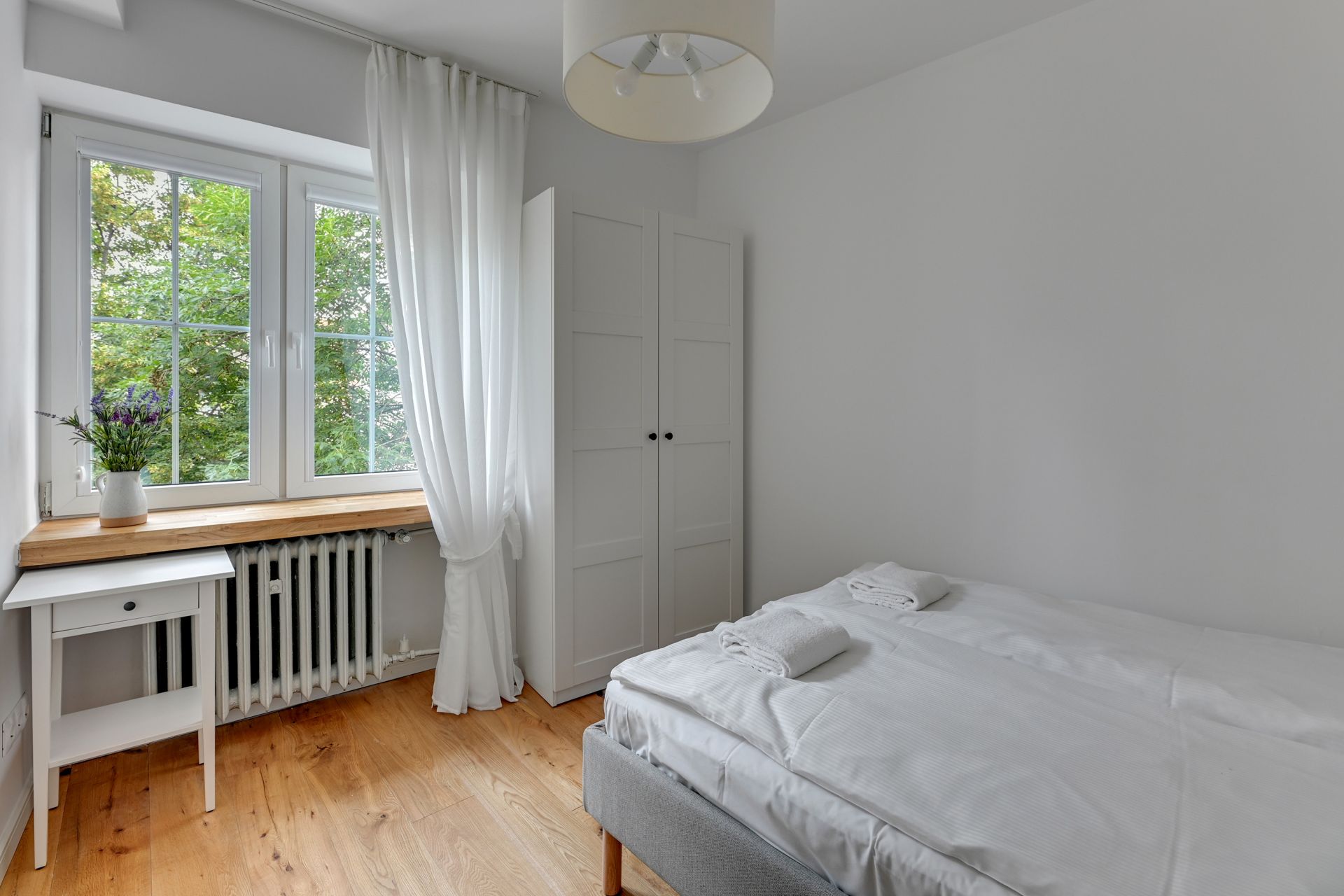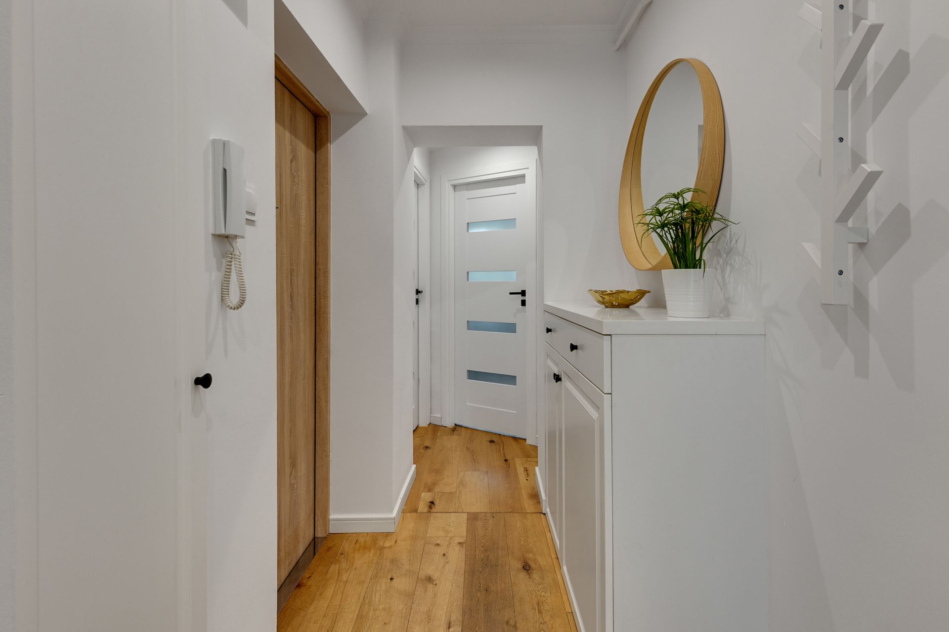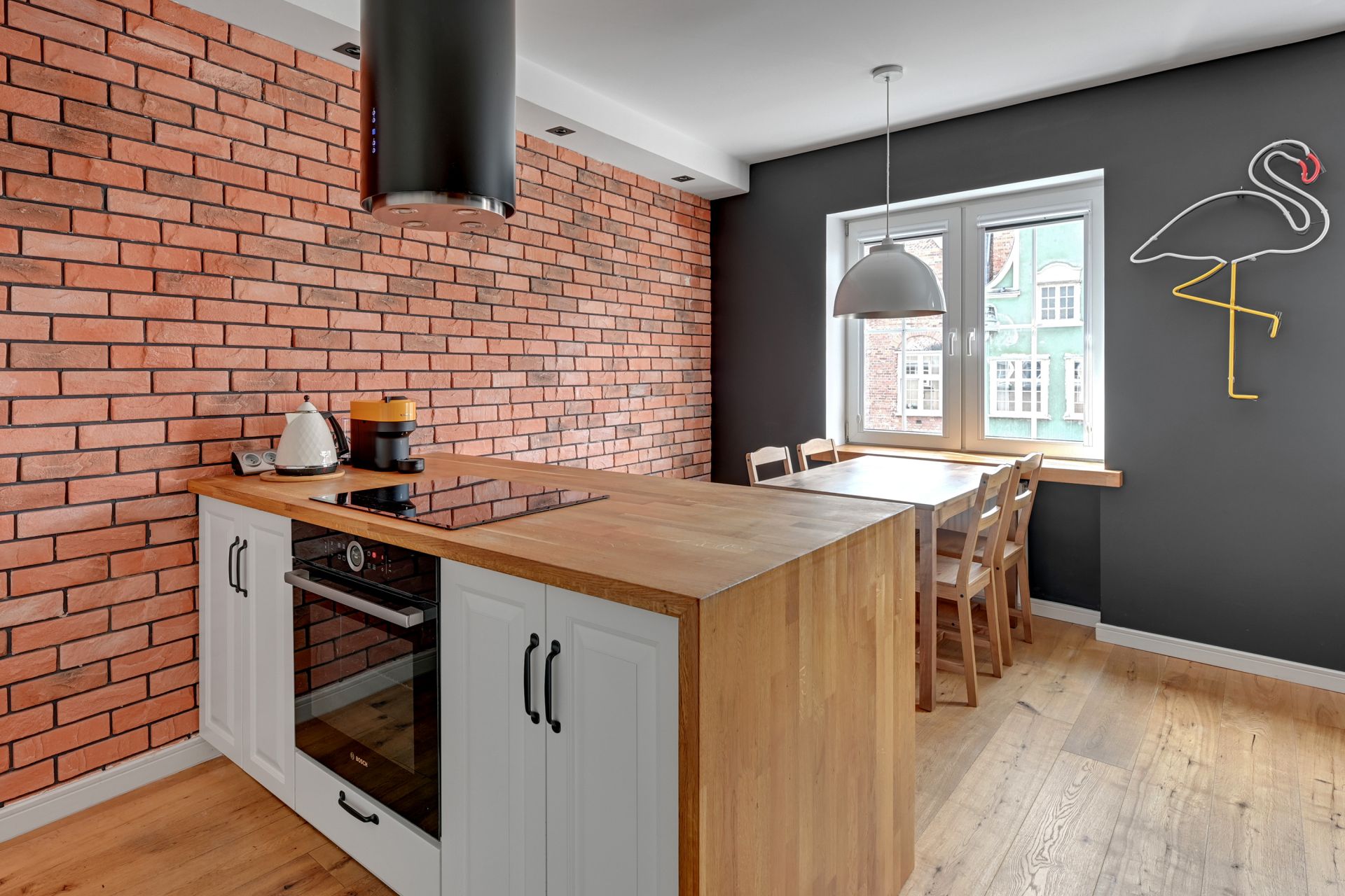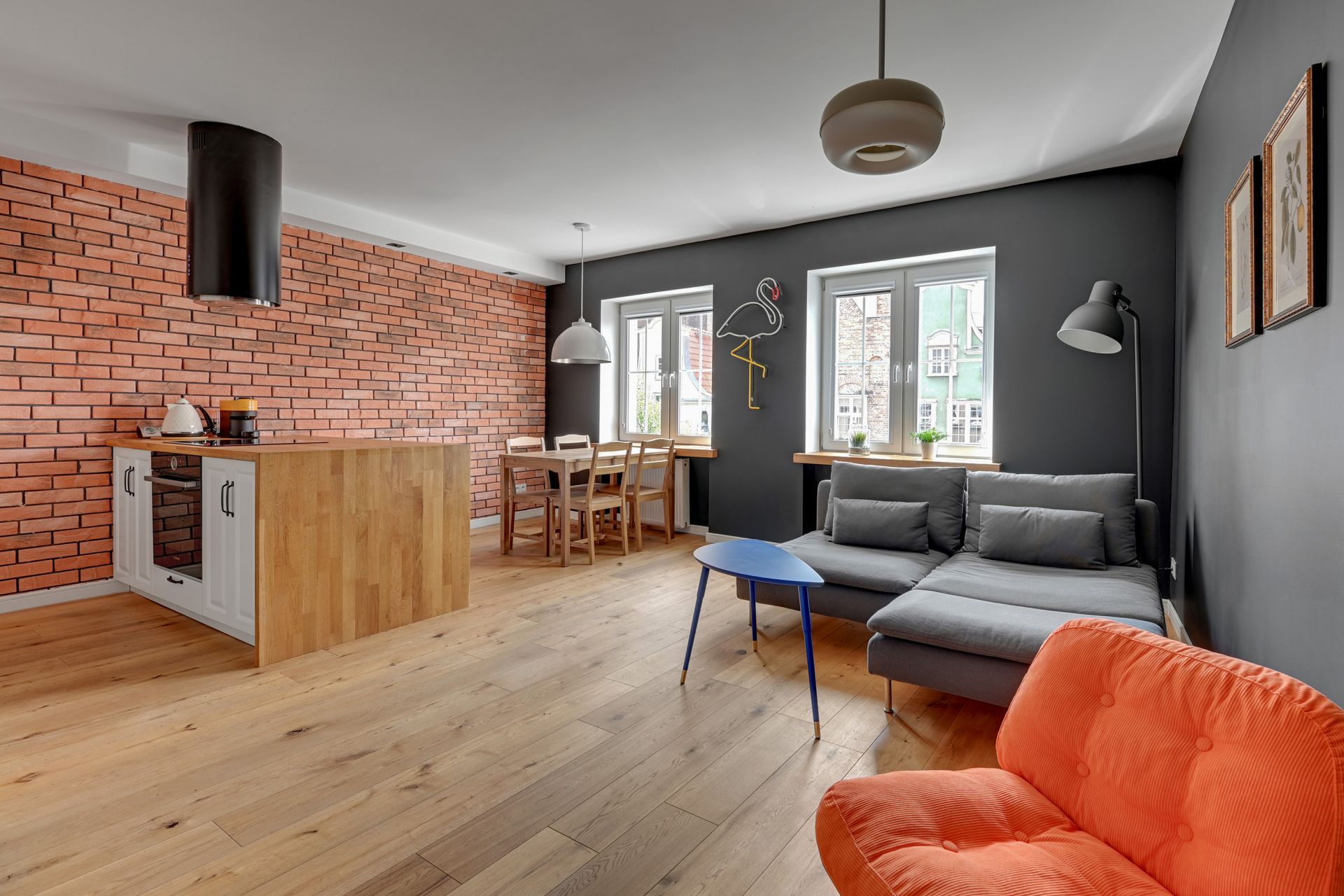 Eleganckie Wnętrza, Komfort na Wyciągnięcie Ręki: Apartament został zaprojektowany z myślą o najwyższym komforcie i estetyce. Składa się z dwóch przytulnych sypialni, zapewniających prywatność i spokojny sen dla maksymalnie czterech osób. Jasne, naturalne światło zalewa pomieszczenia, a eleganckie drewniane podłogi i designerskie detale, takie jak oryginalna ceglana ściana w salonie, dodają wnętrzom charakteru.