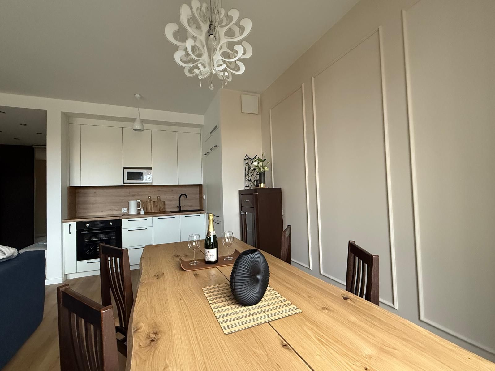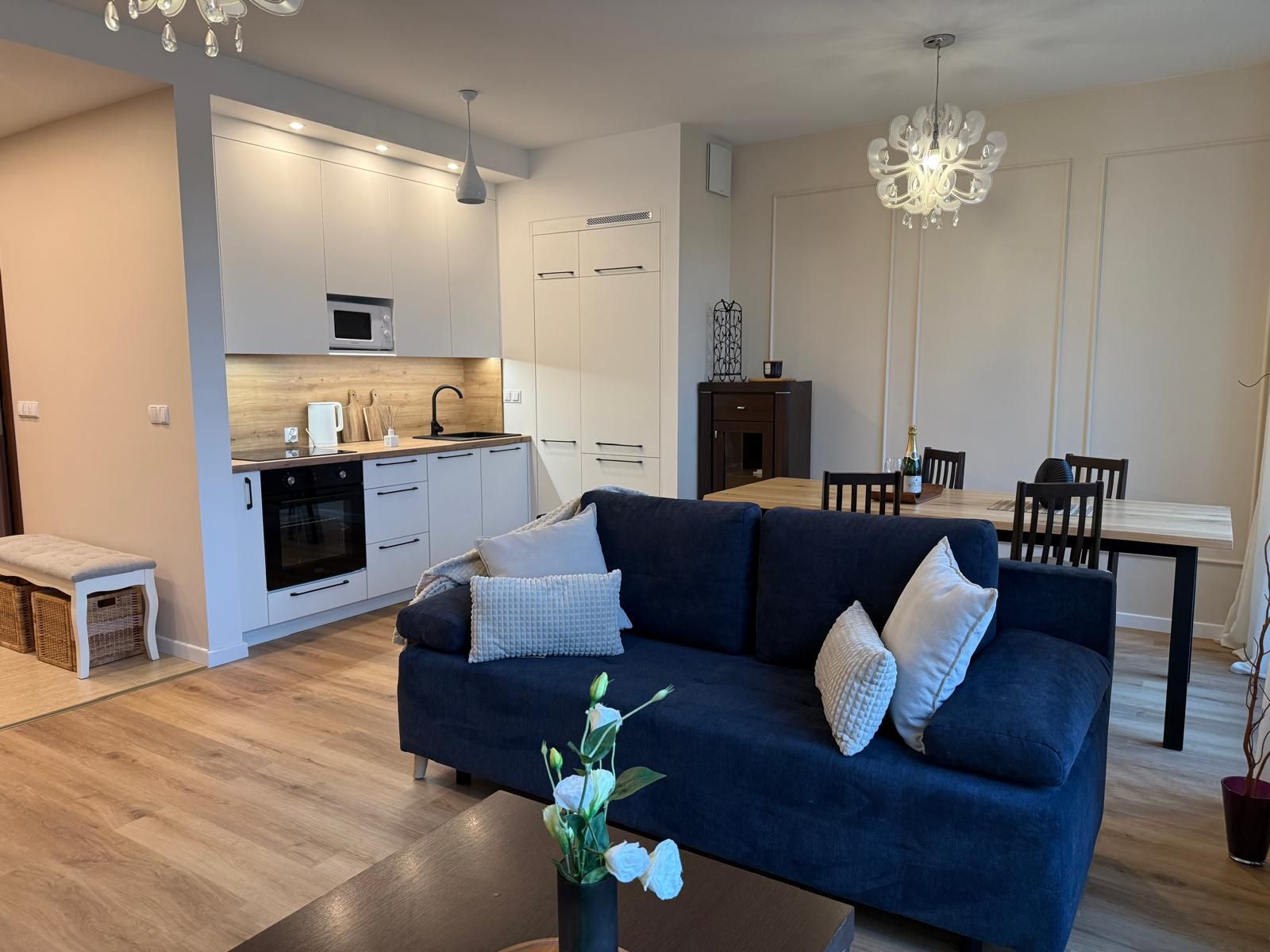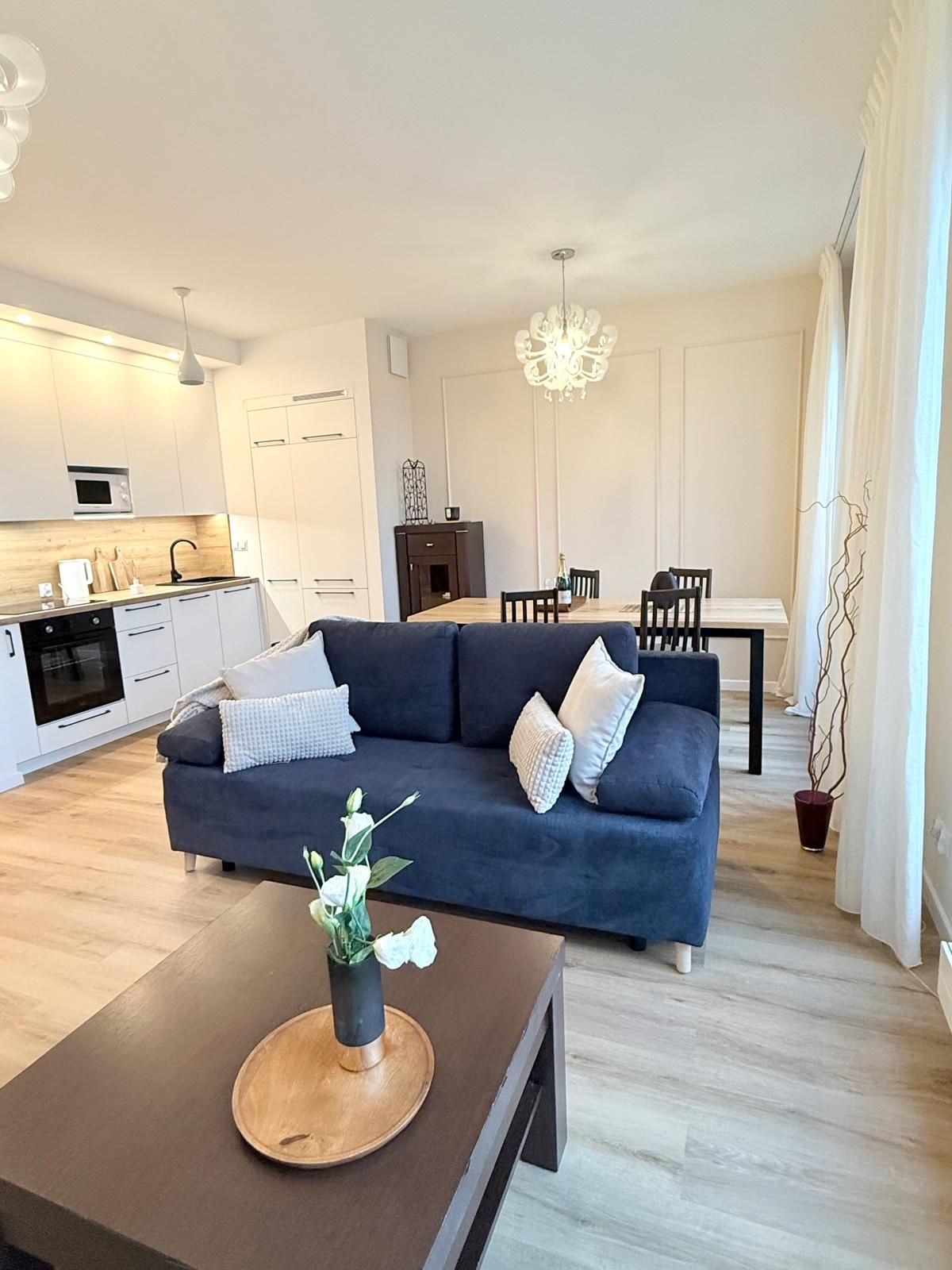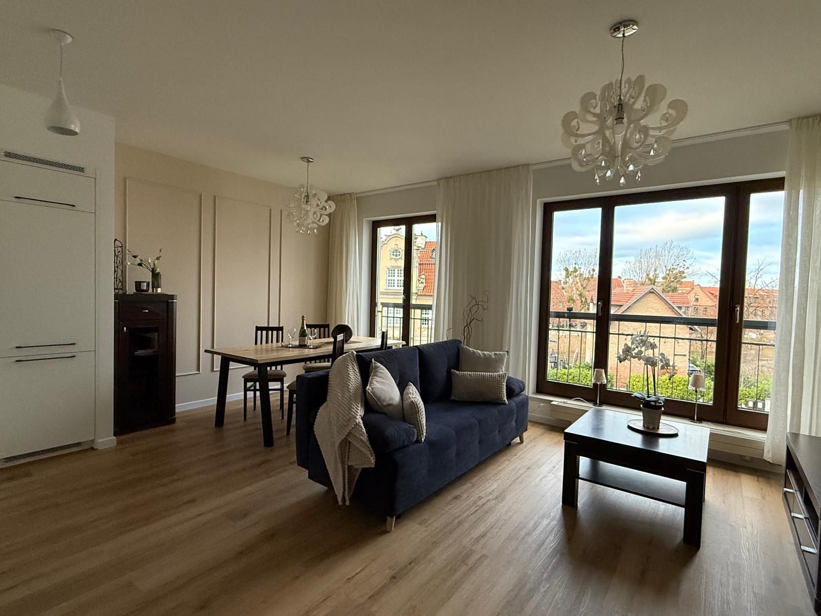 Jasna, elegancka przestrzeń, w której główną rolę grają duże okna. Zapewniają one unikalny widok na Motławę oraz ikoniczny gdański Żuraw. W salonie znajduje się wygodna, granatowa sofa oraz duży, drewniany stół – idealny na wspólne kolacje.
