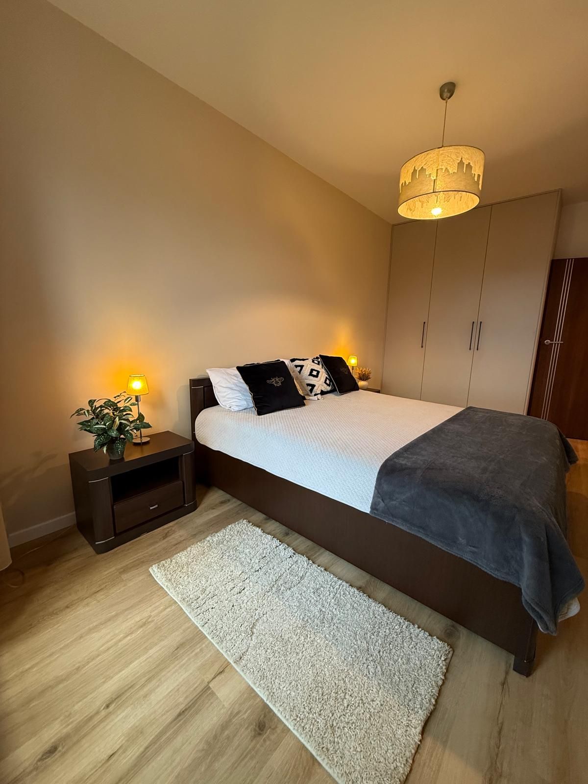 Przytulny pokój z dużym łóżkiem małżeńskim, pojemną szafą i nastrojowym oświetleniem.