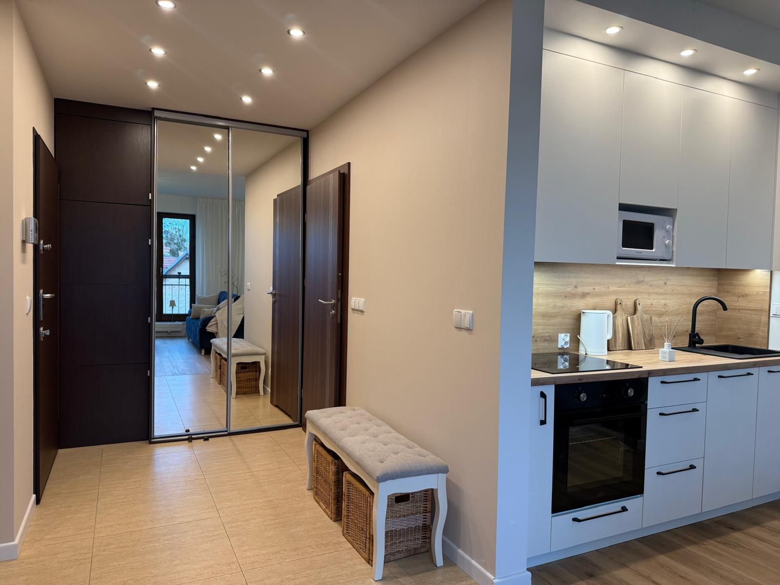 Biała, minimalistyczna zabudowa kuchenna została wyposażona we wszystkie niezbędne sprzęty (piekarnik, mikrofala, ekspres do kawy).