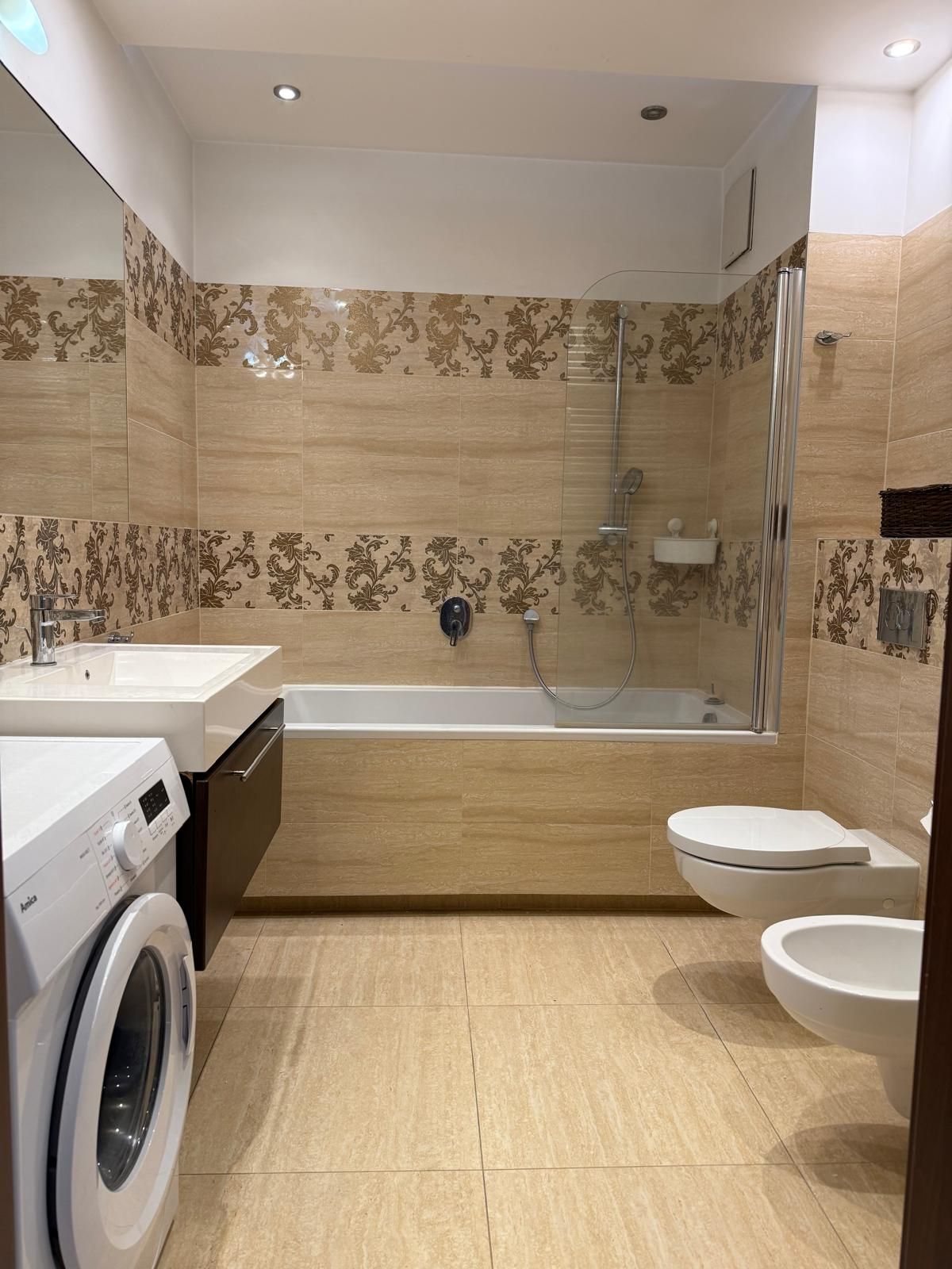 Klasycznie wykończona przestrzeń z wanną (z parawanem prysznicowym), bidetem oraz pralką.